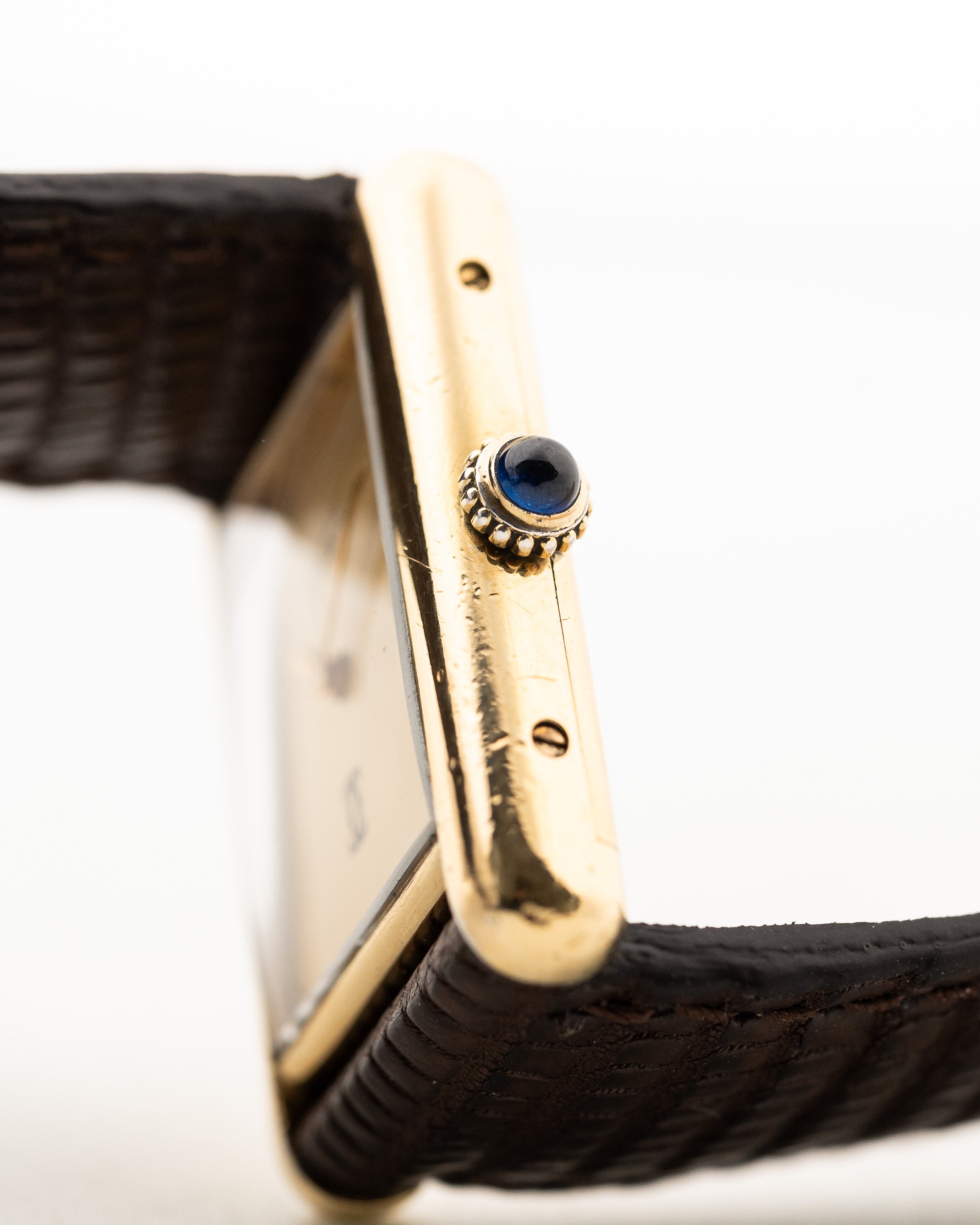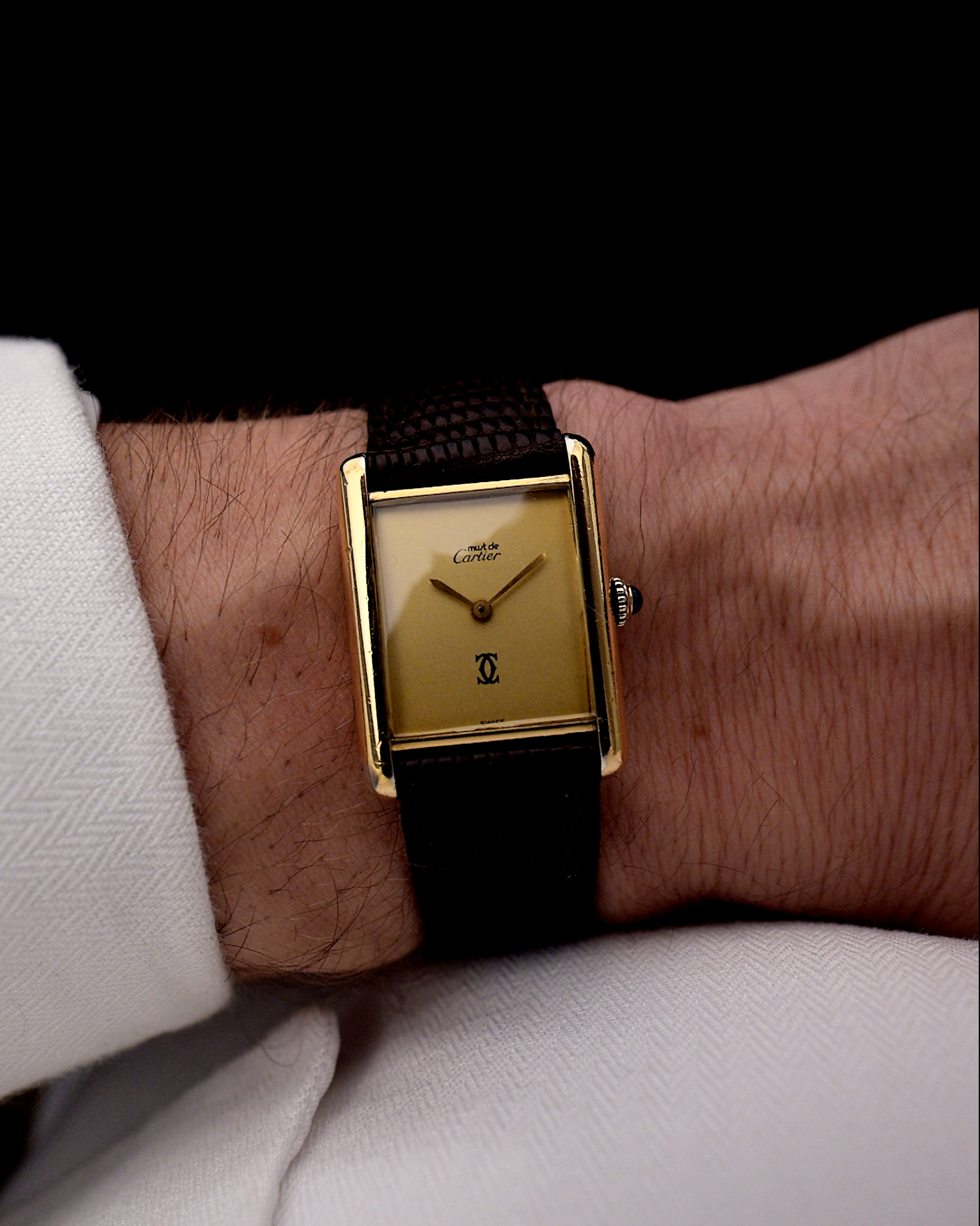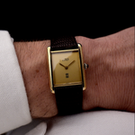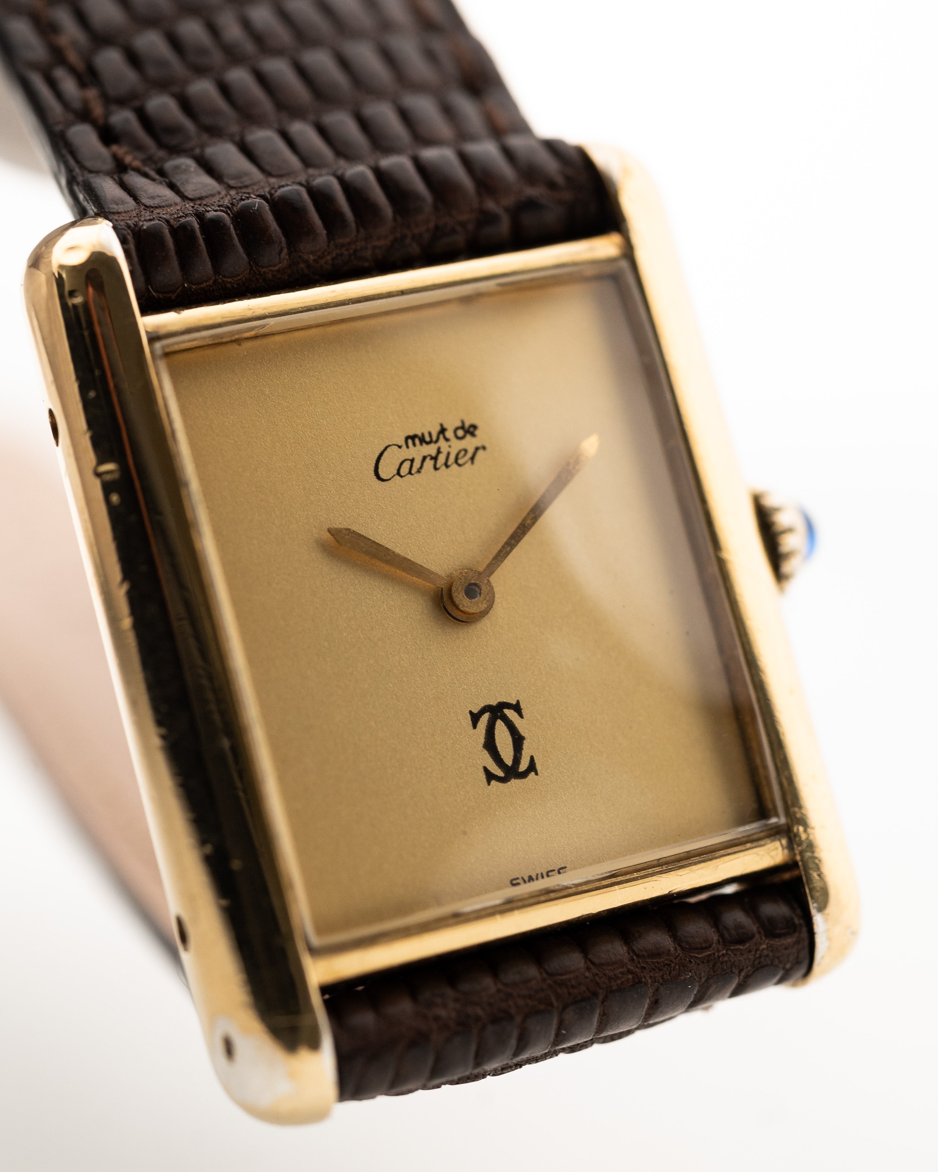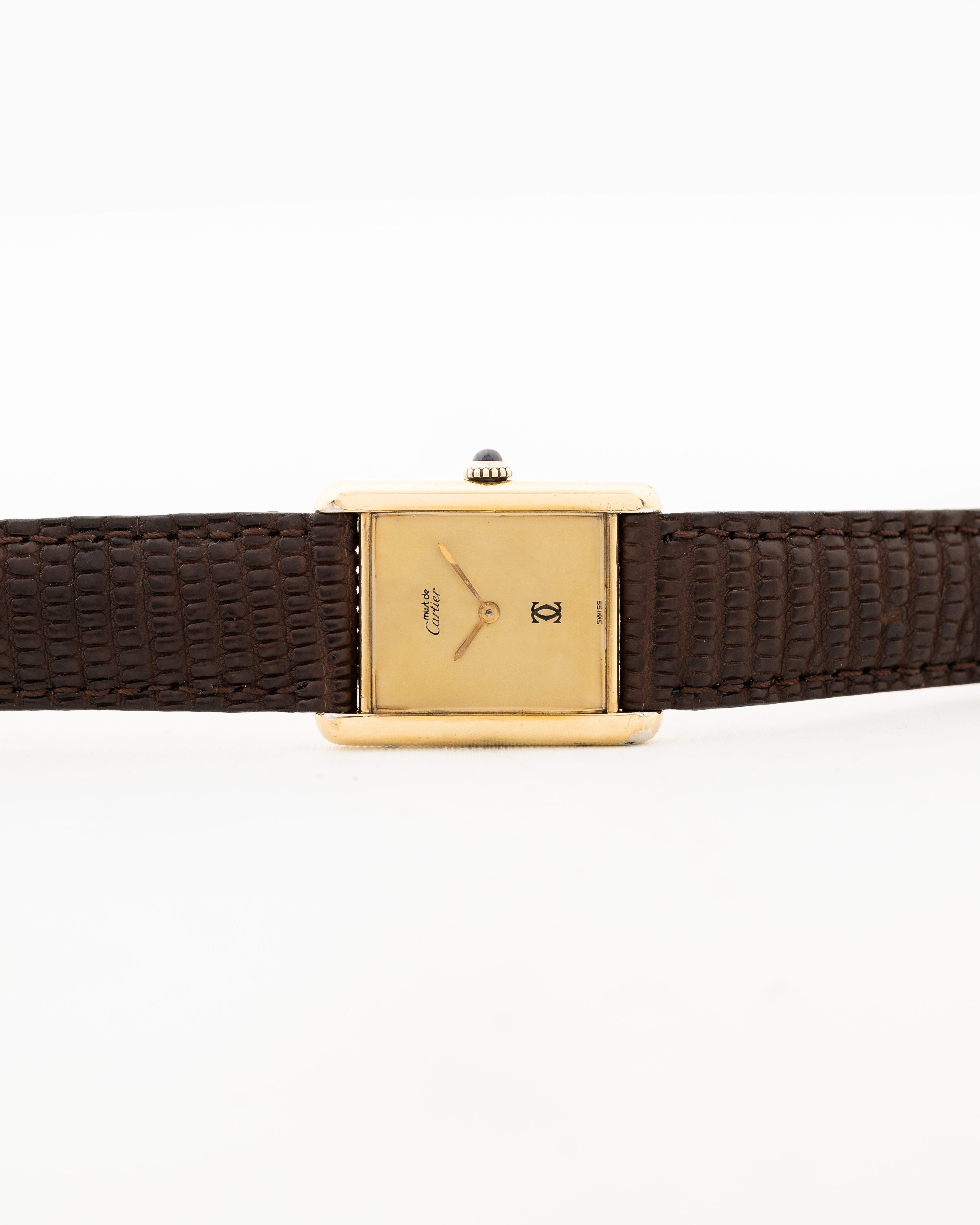 Here we have a vintage Cartier Tank Vermeil manual wind with a gold colored dial from the 1980s. It features a 925 silver case with gold plating, the original blue cabochon crown and a dial in perfect condition.