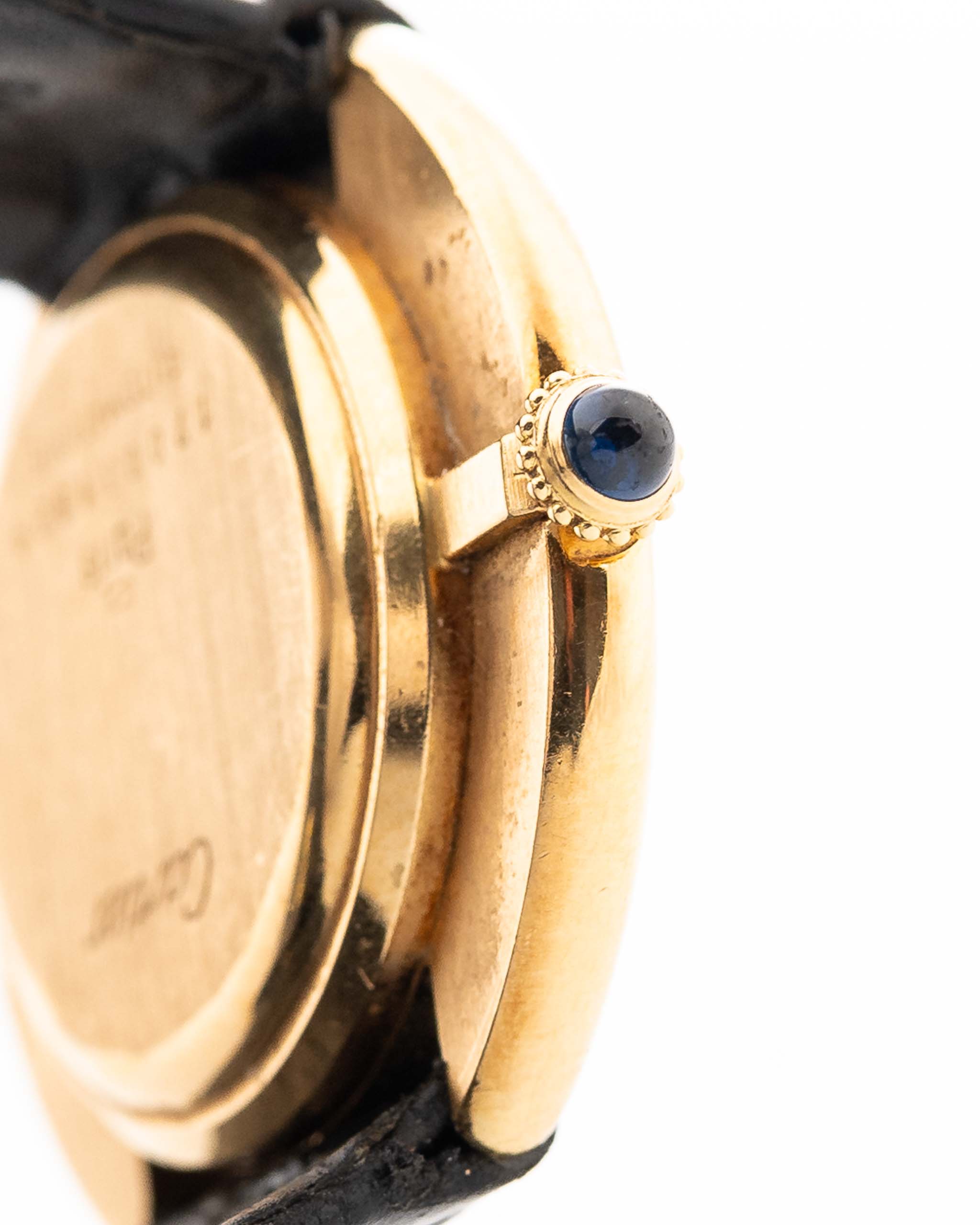 • original blued steel hands & crown with blue sapphire cabochon