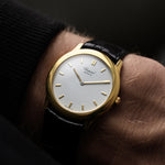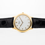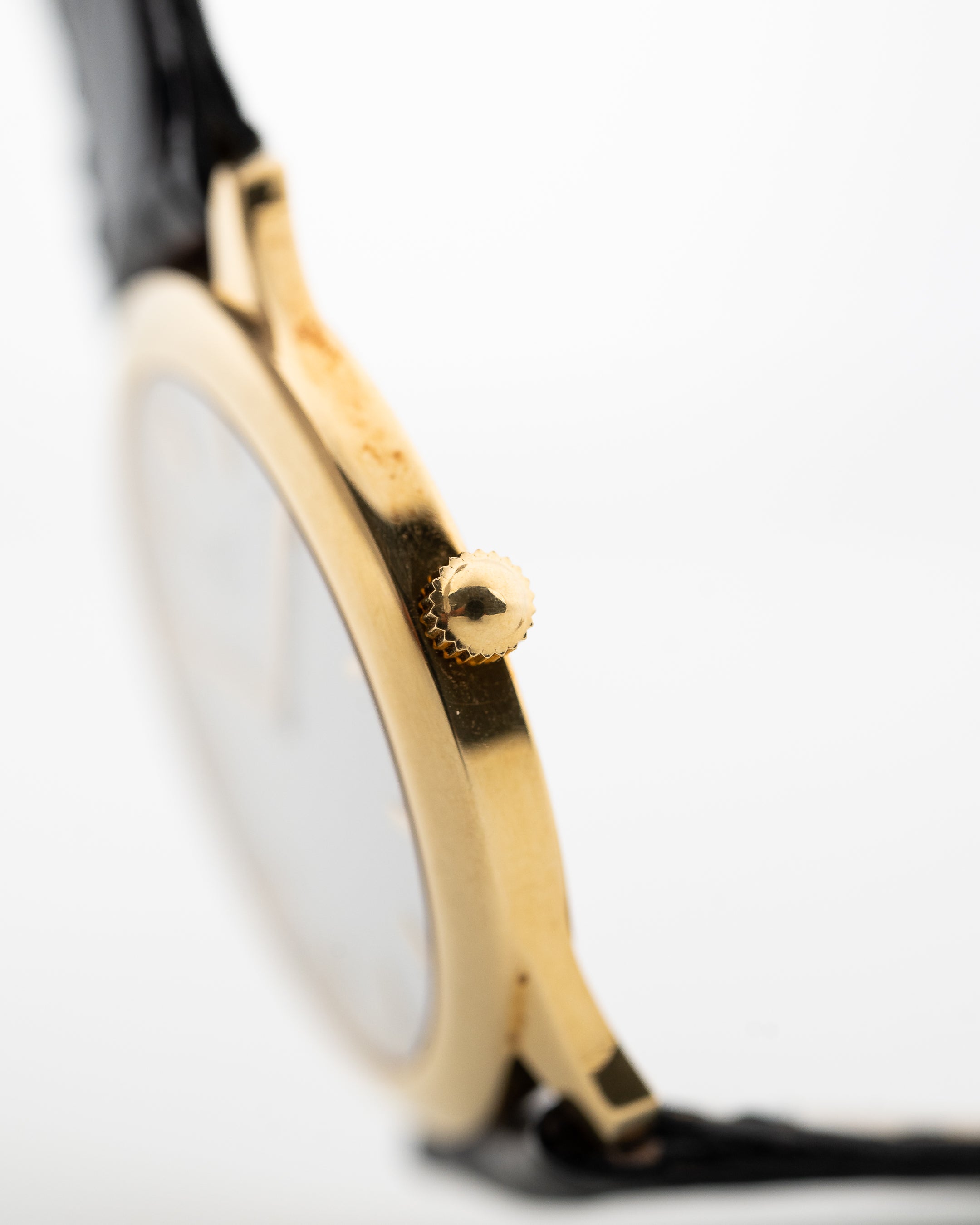 Our model features a 33 mm yellow gold case with short lugs, a unique white dial in flawless condition and classic 18k hands and hour markers.