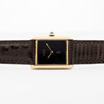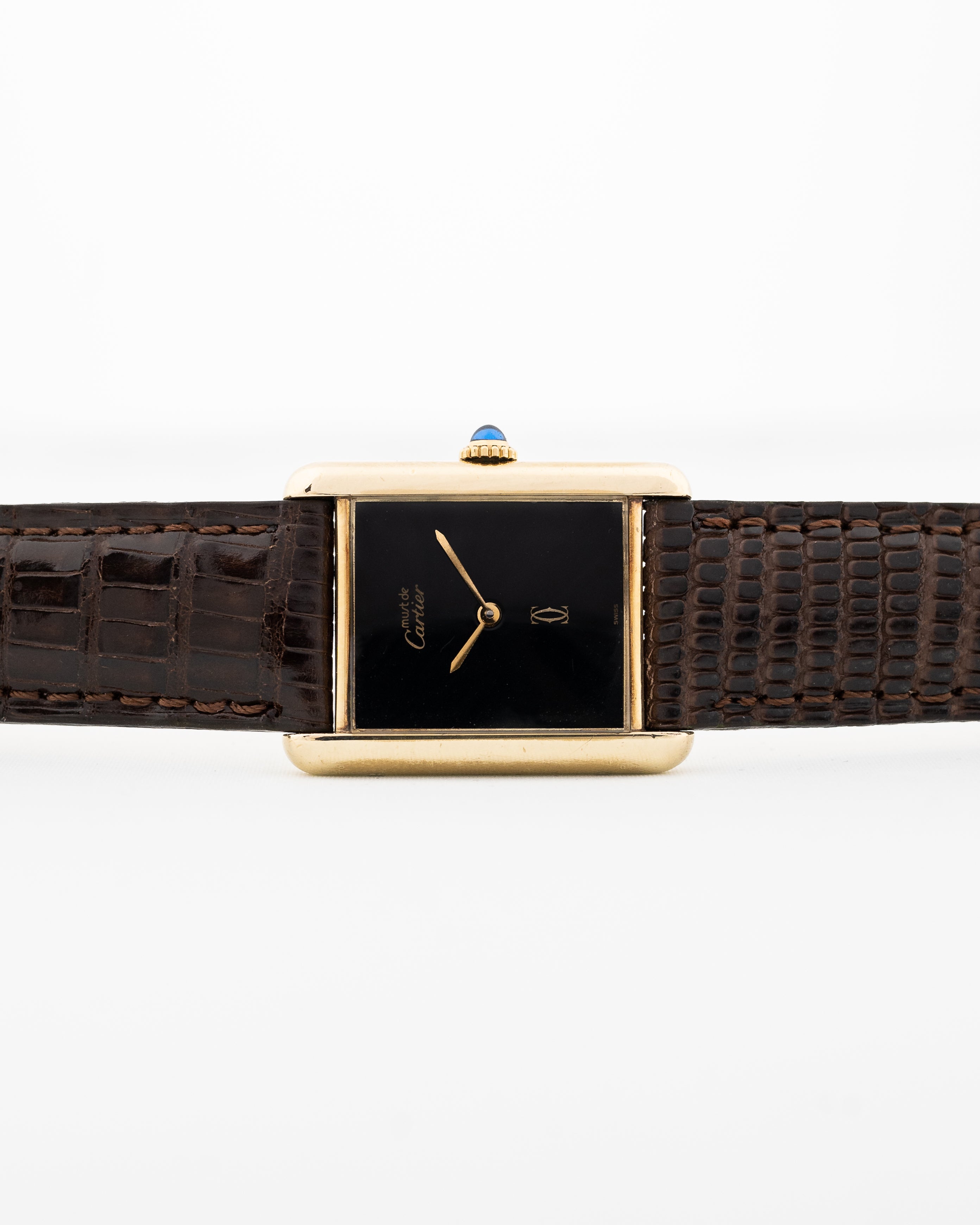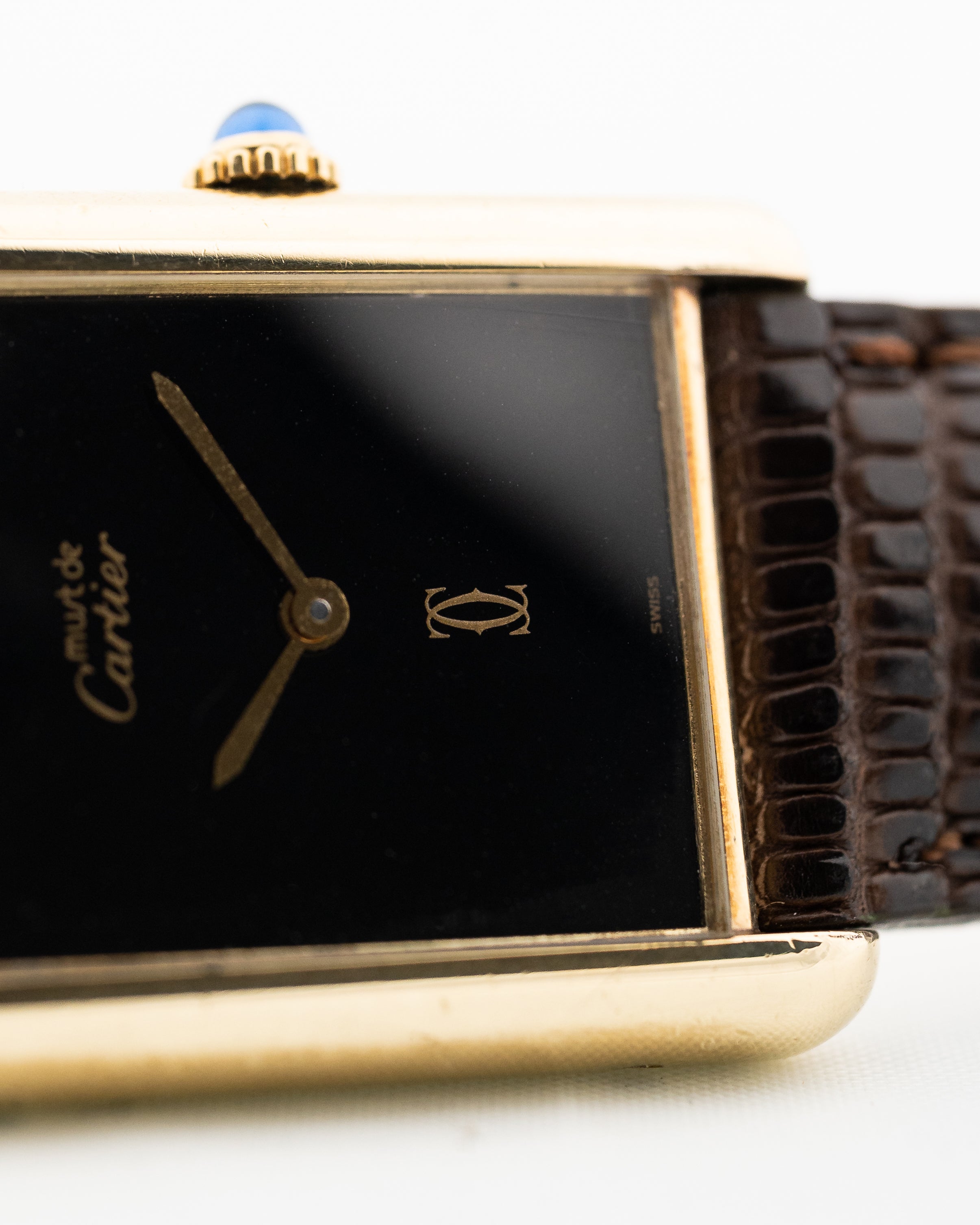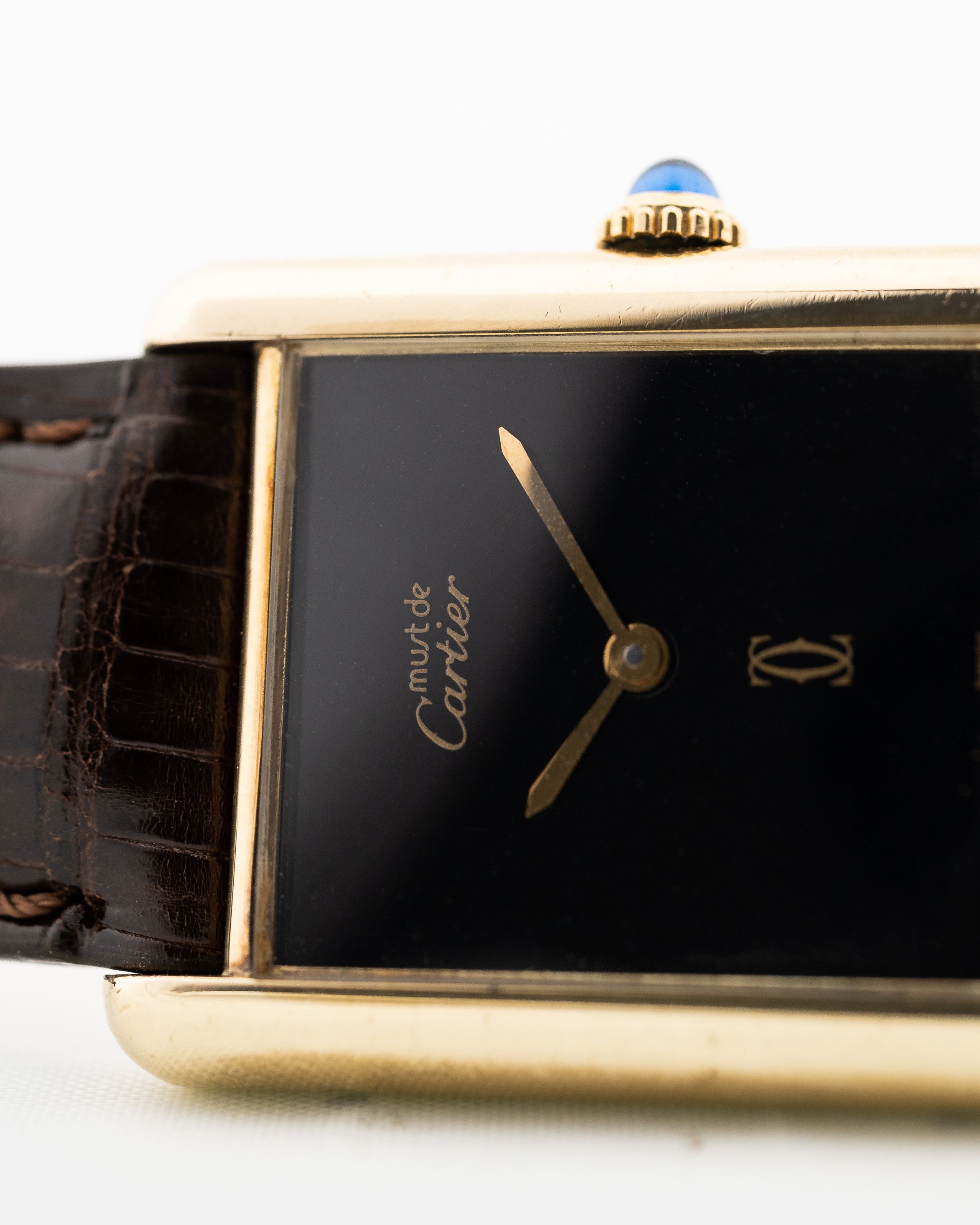 Here we have a vintage Cartier Tank manual wind with a black onyx dial from the early 80s. It features a 925 silver case with gold plating, the original blue cabochon crown and the black Onyx dial is in perfect condition.