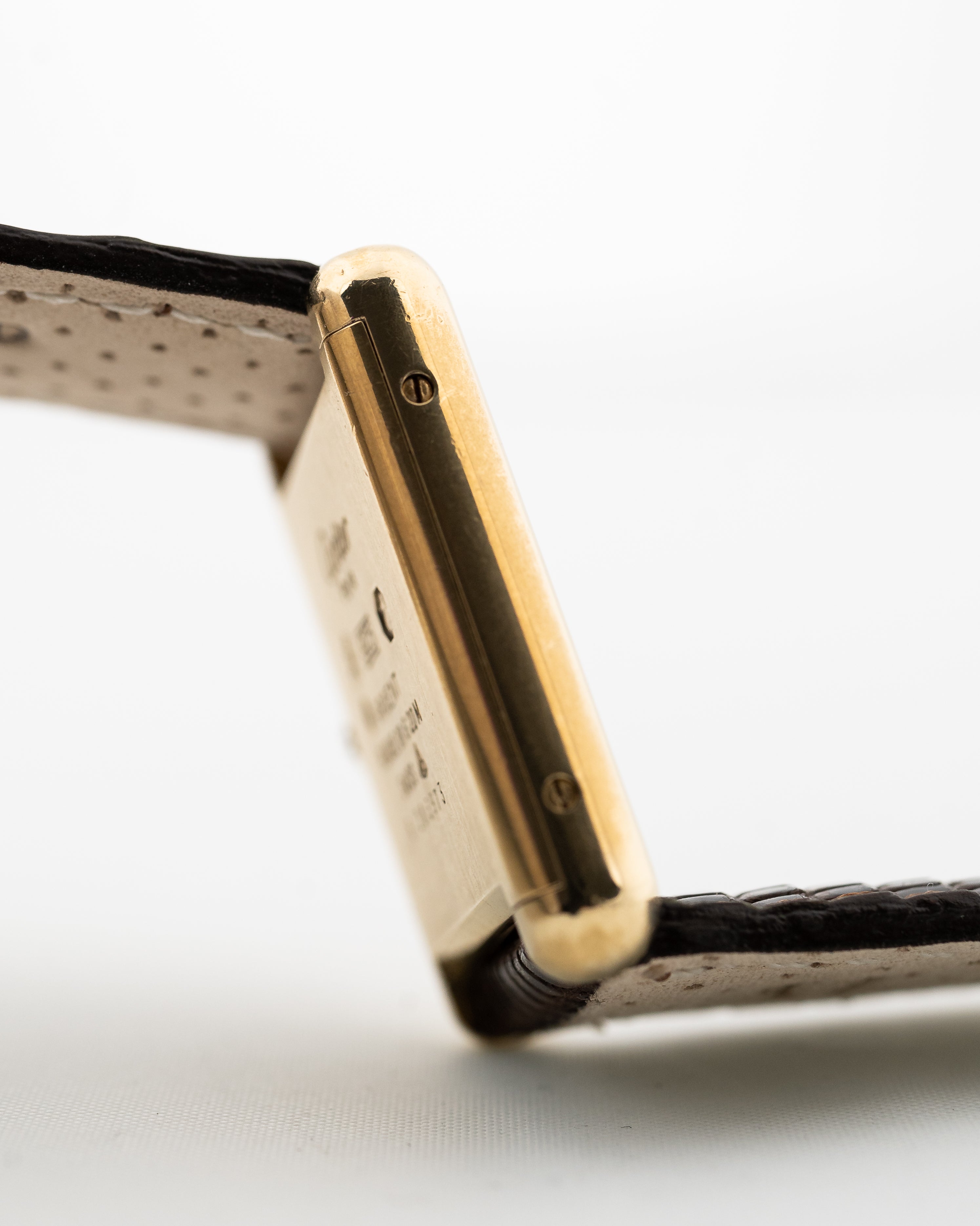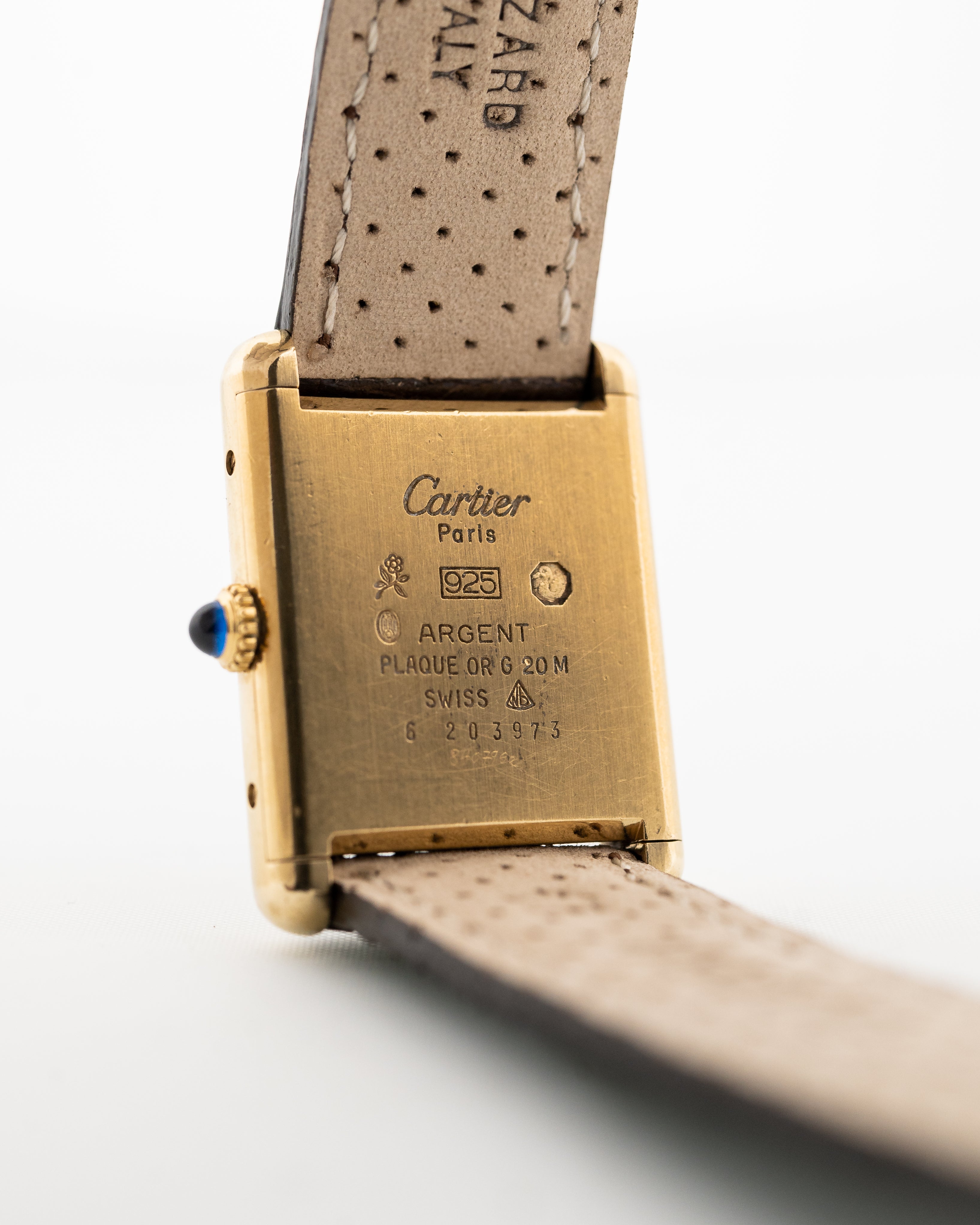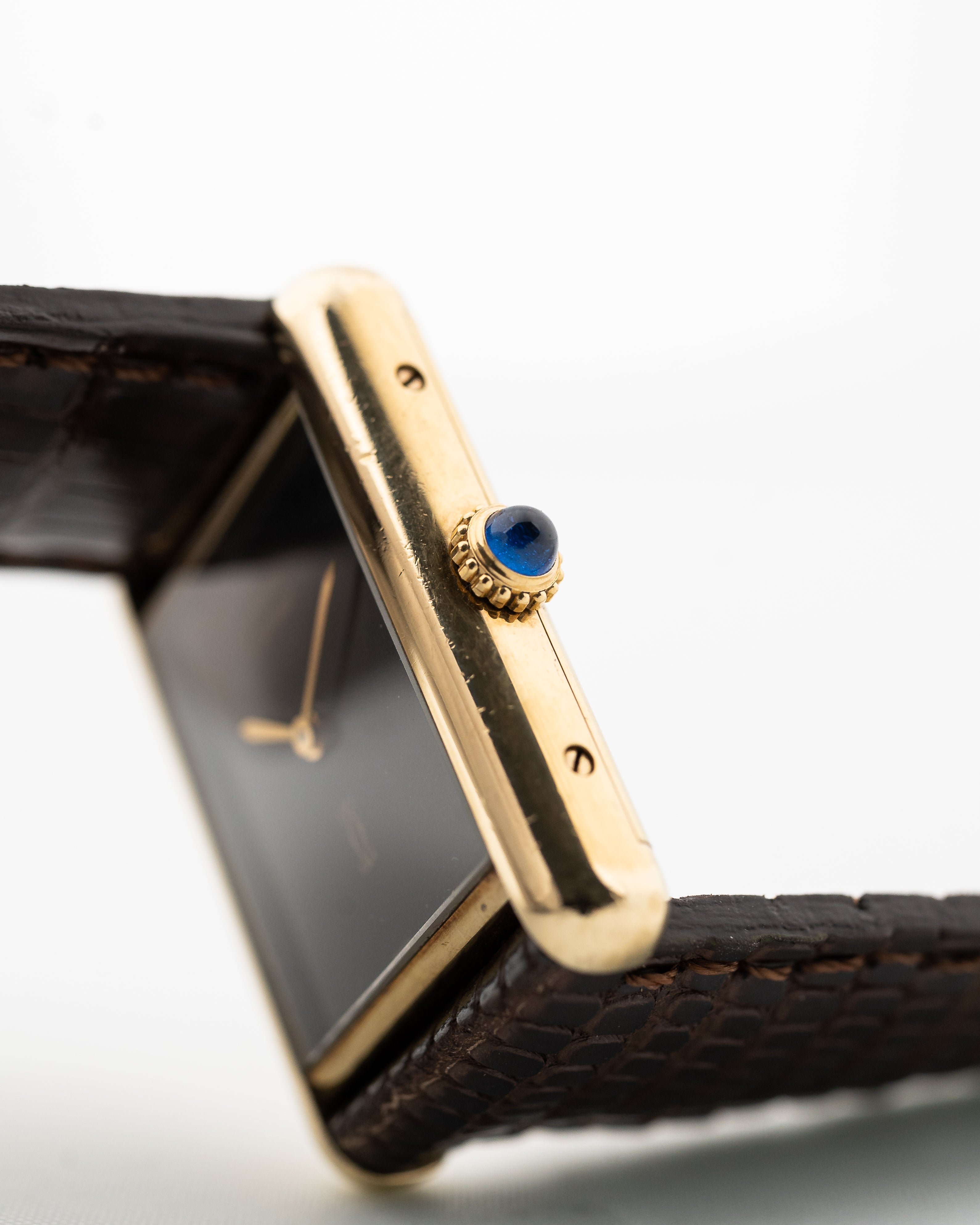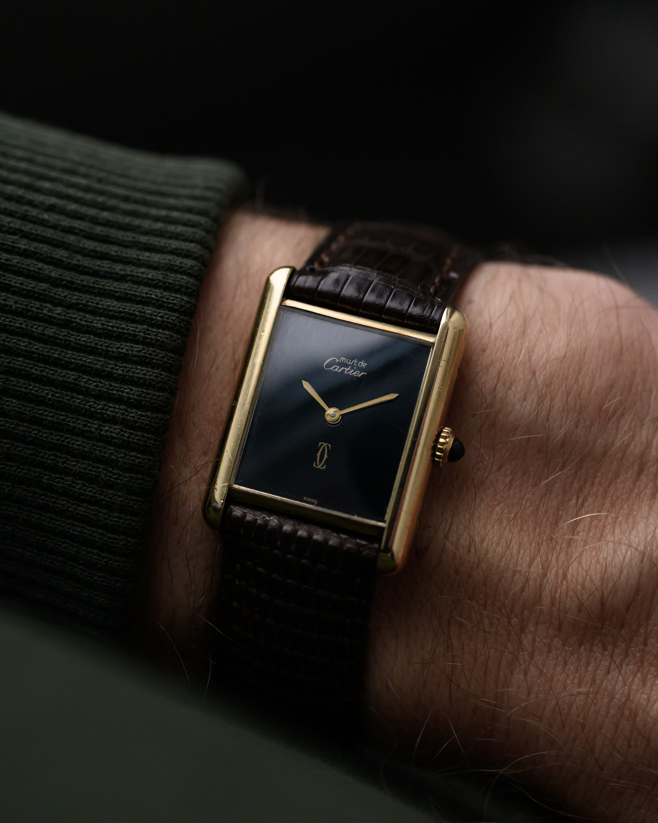 Here we have a vintage Cartier Tank manual wind with a black onyx dial from the early 80s. It features a 925 silver case with gold plating, the original blue cabochon crown and the black Onyx dial is in perfect condition.