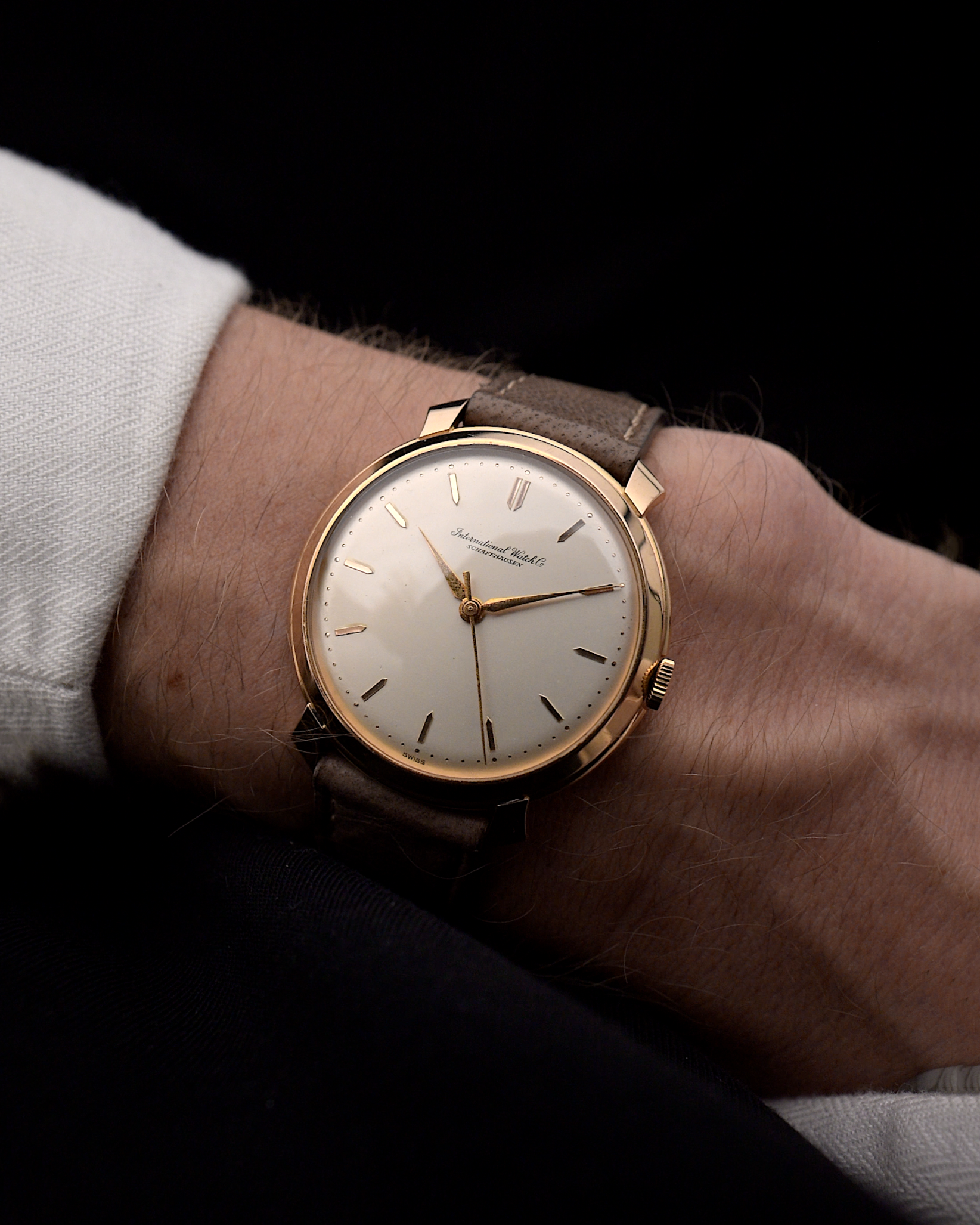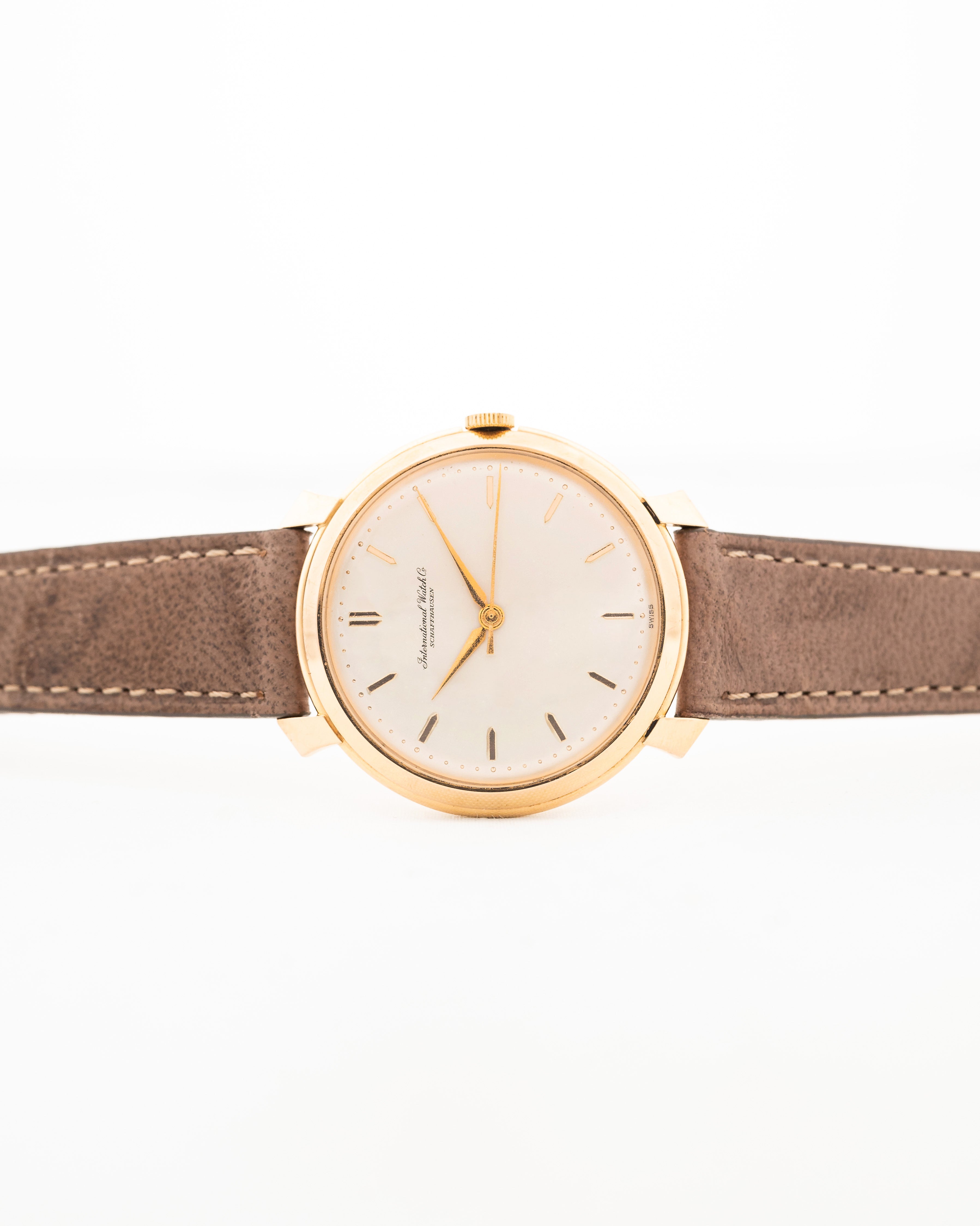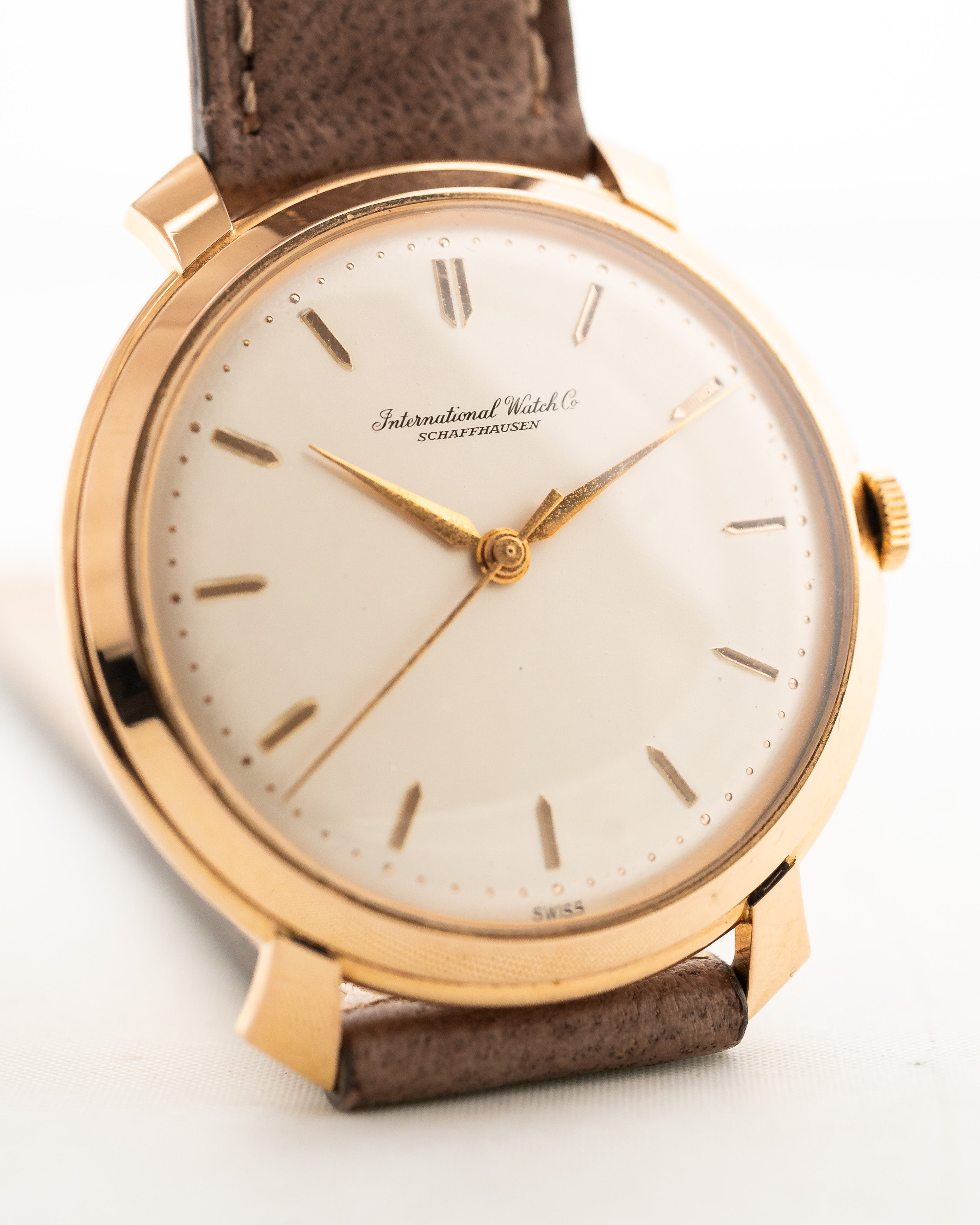 IWC has produced a very wide variety of wristwatches from an early time ranging from dress watches to aviation watches. This example, in 18k rose gold with it's white/silver dial would remain a constant in anyone's collections, especially as it comes with beautiful shark fin lugs.