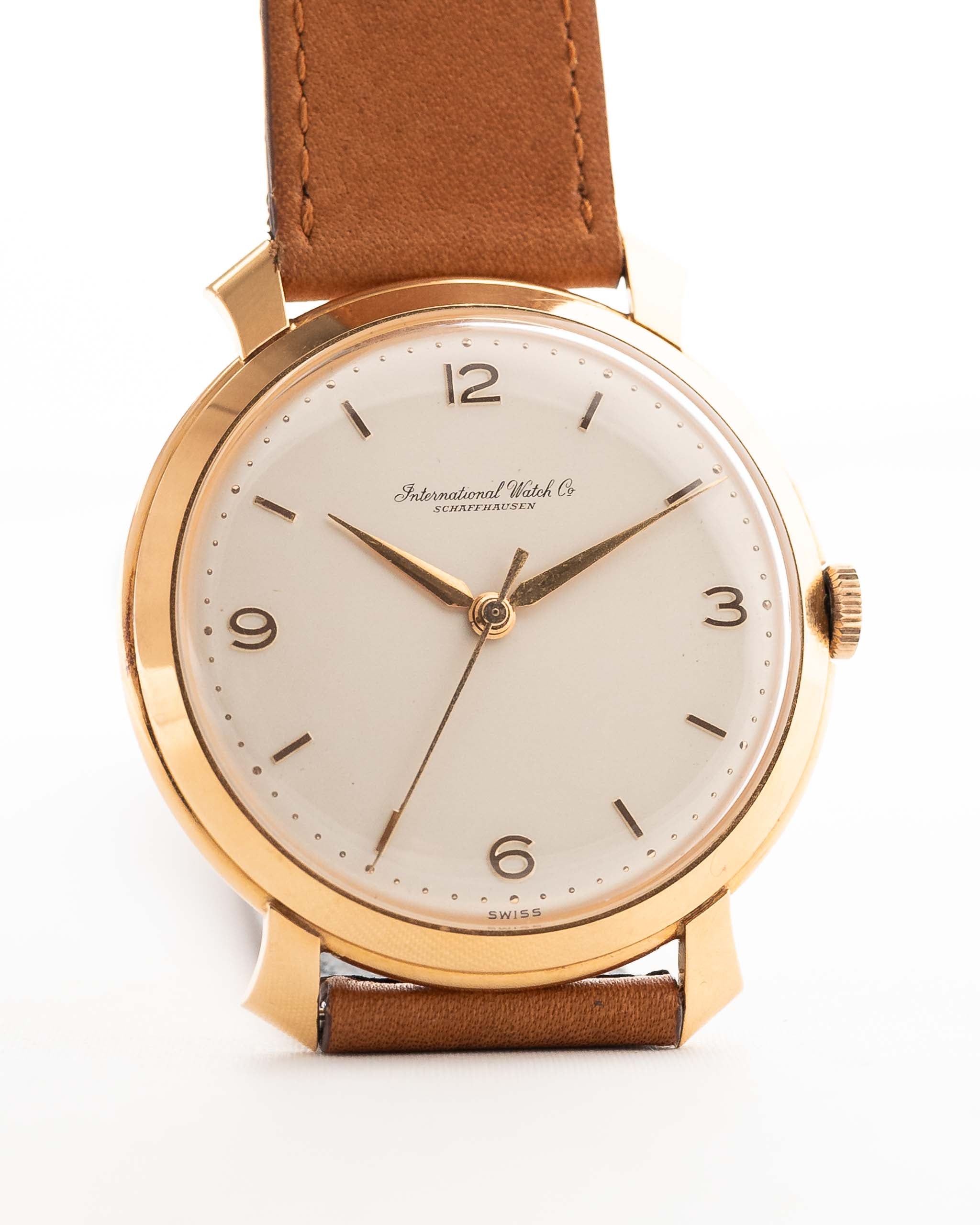 This rare IWC Caliber 89 dress watch from 1960 offers an exceptional blend of understated sophistication and striking case architecture. Crafted in 18k rose gold, the standout feature is undoubtedly the sculptural “shark fin” lugs, lending a bold, architectural touch to the clean, minimalist aesthetic.