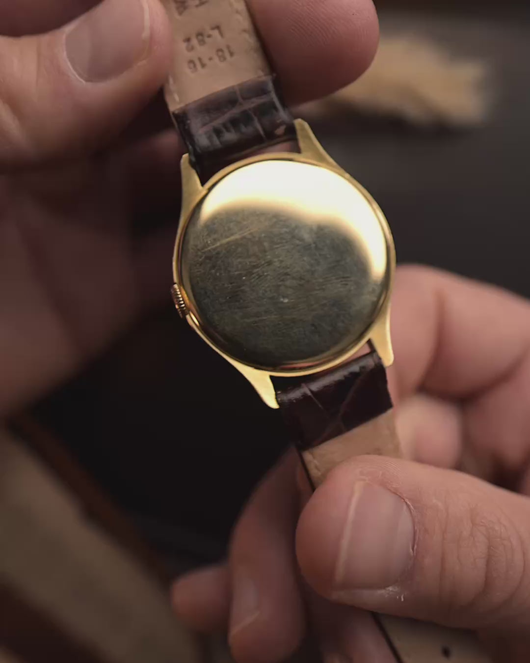 Elegant, oversized, and nearly impossible to find — this 1937 IWC Pre “Hermet” is a remarkable artifact from the golden age of Swiss horology. With a large-for-its-time 36.5 mm solid 14k yellow gold case, it was designed with both innovation and aesthetics in mind.