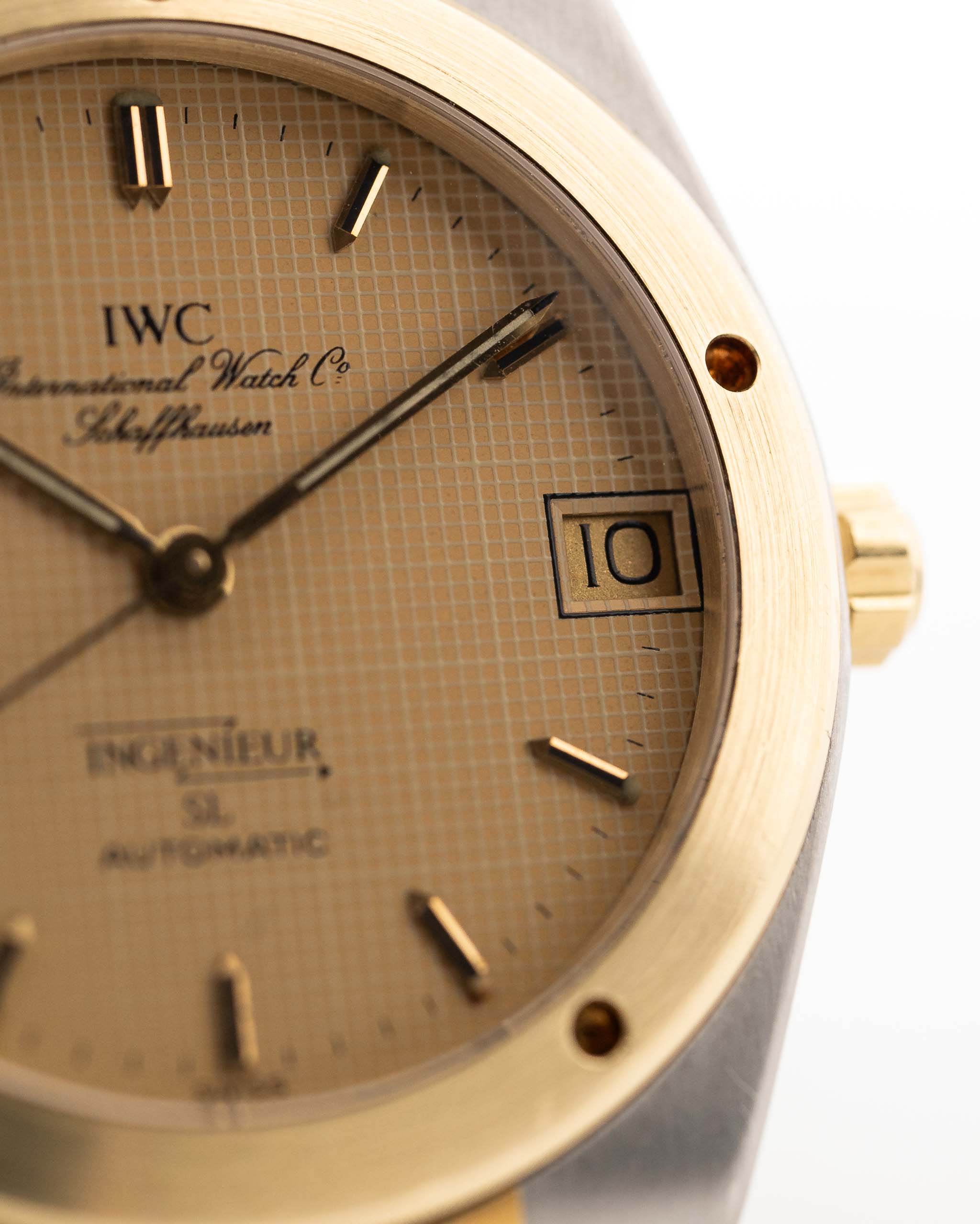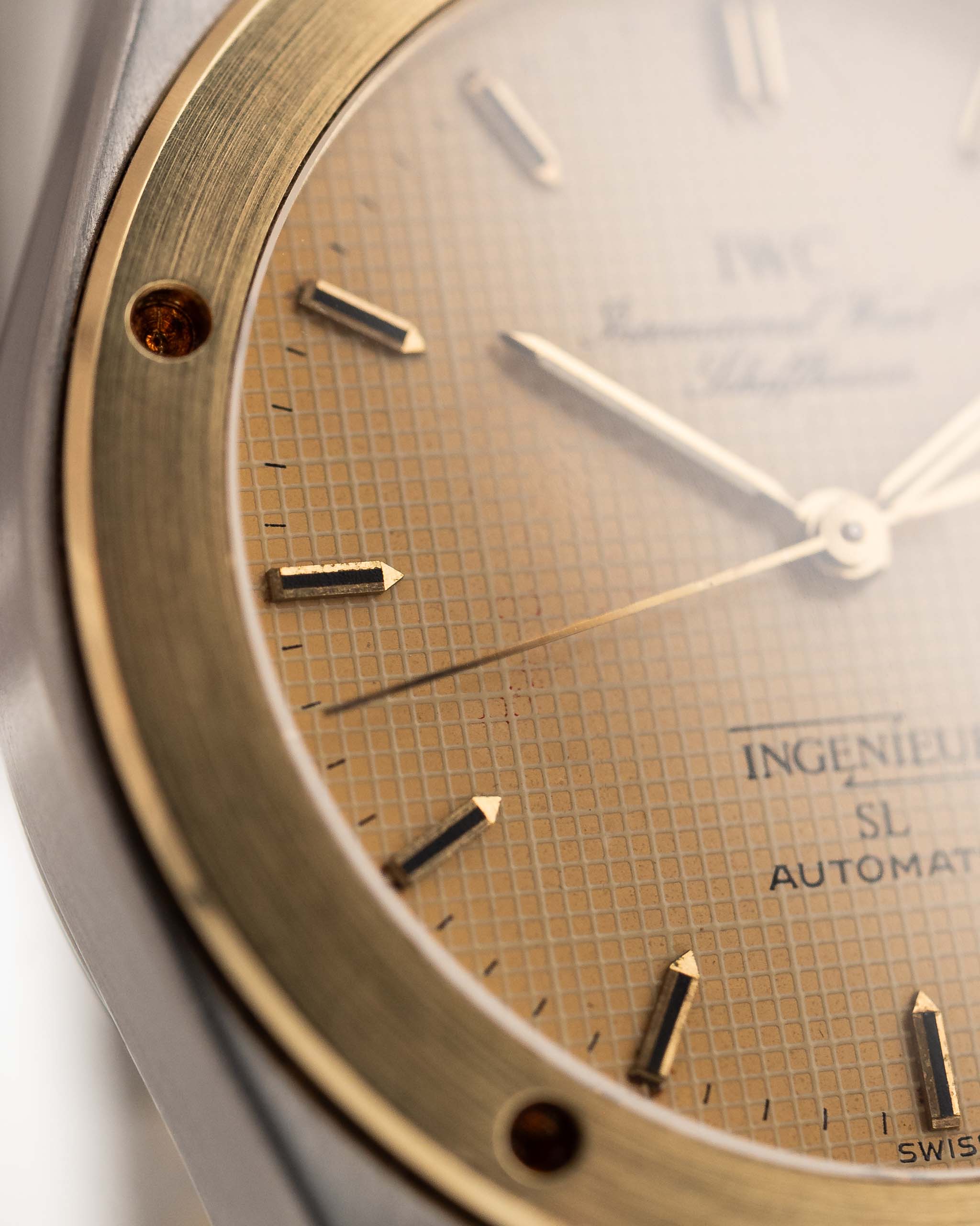 Vintage IWC Ingenieur 3505 SL Two Tone watch from 1987. 34mm in Stainless Steel & 18k Yellow Gold with Automatic Movement, Golden Papergraph Dial and Two Tone Bracelet.