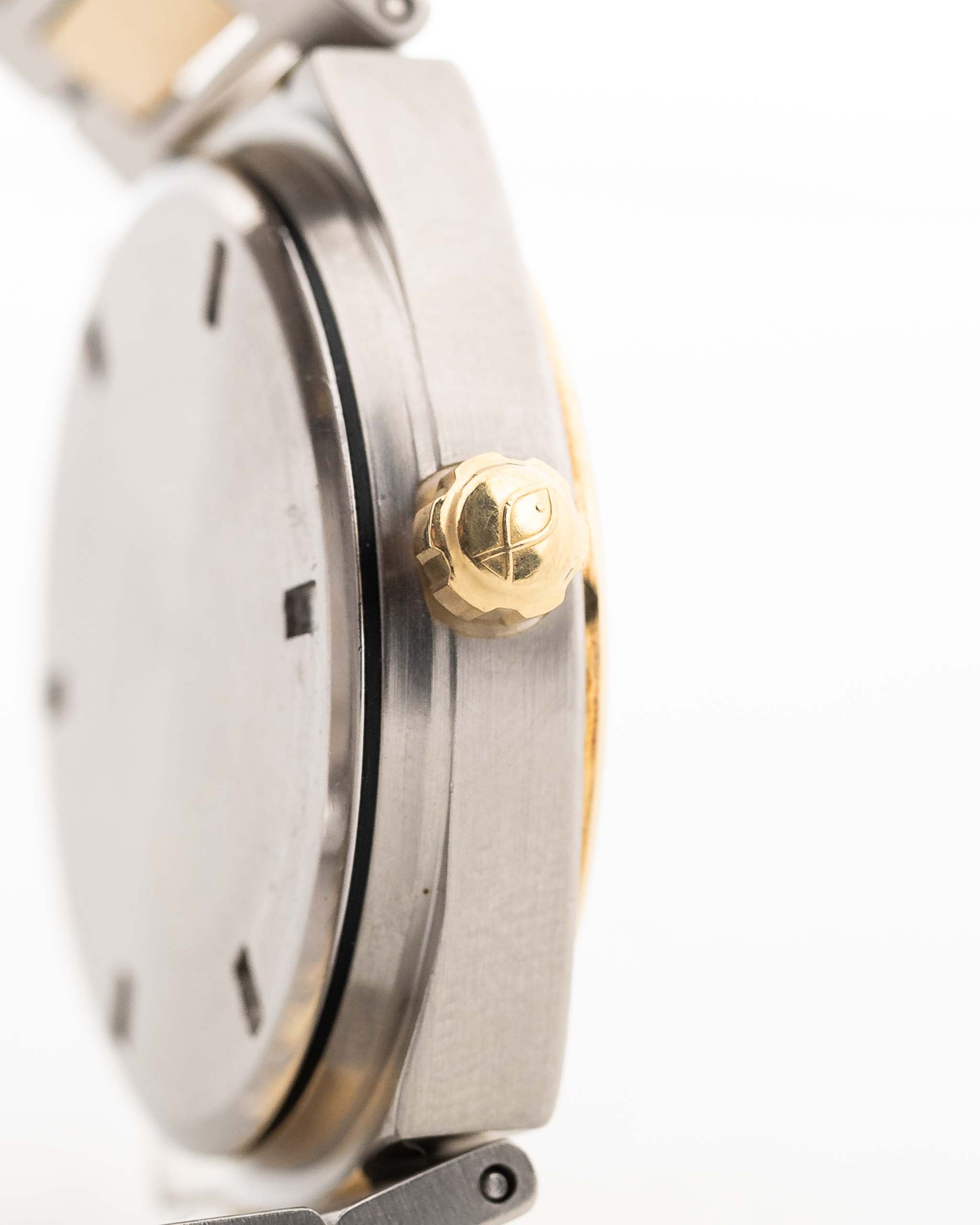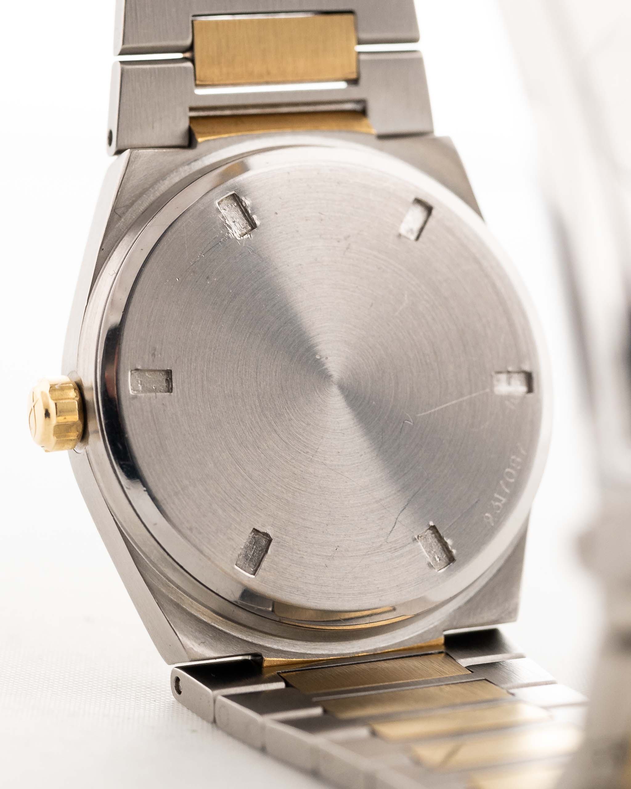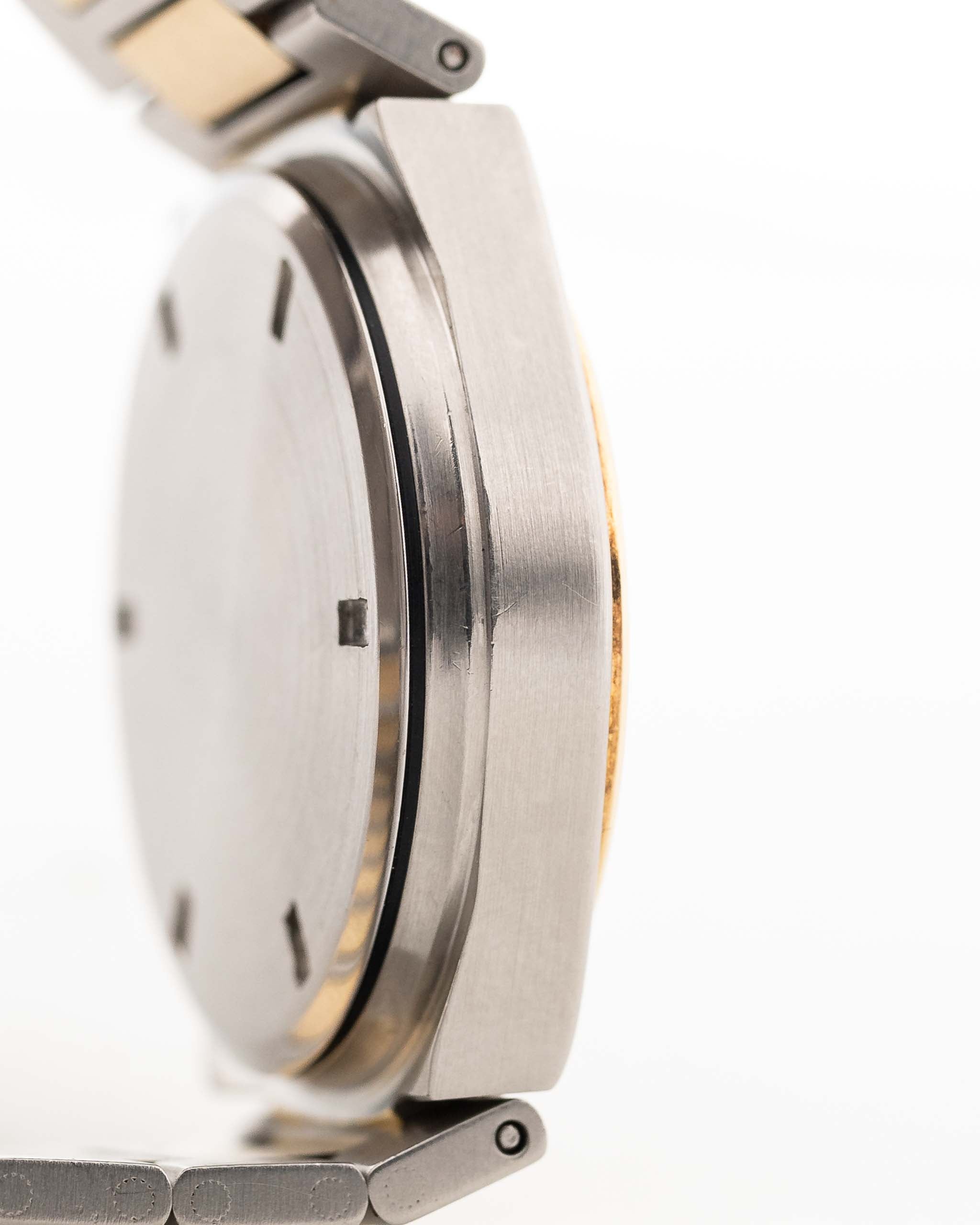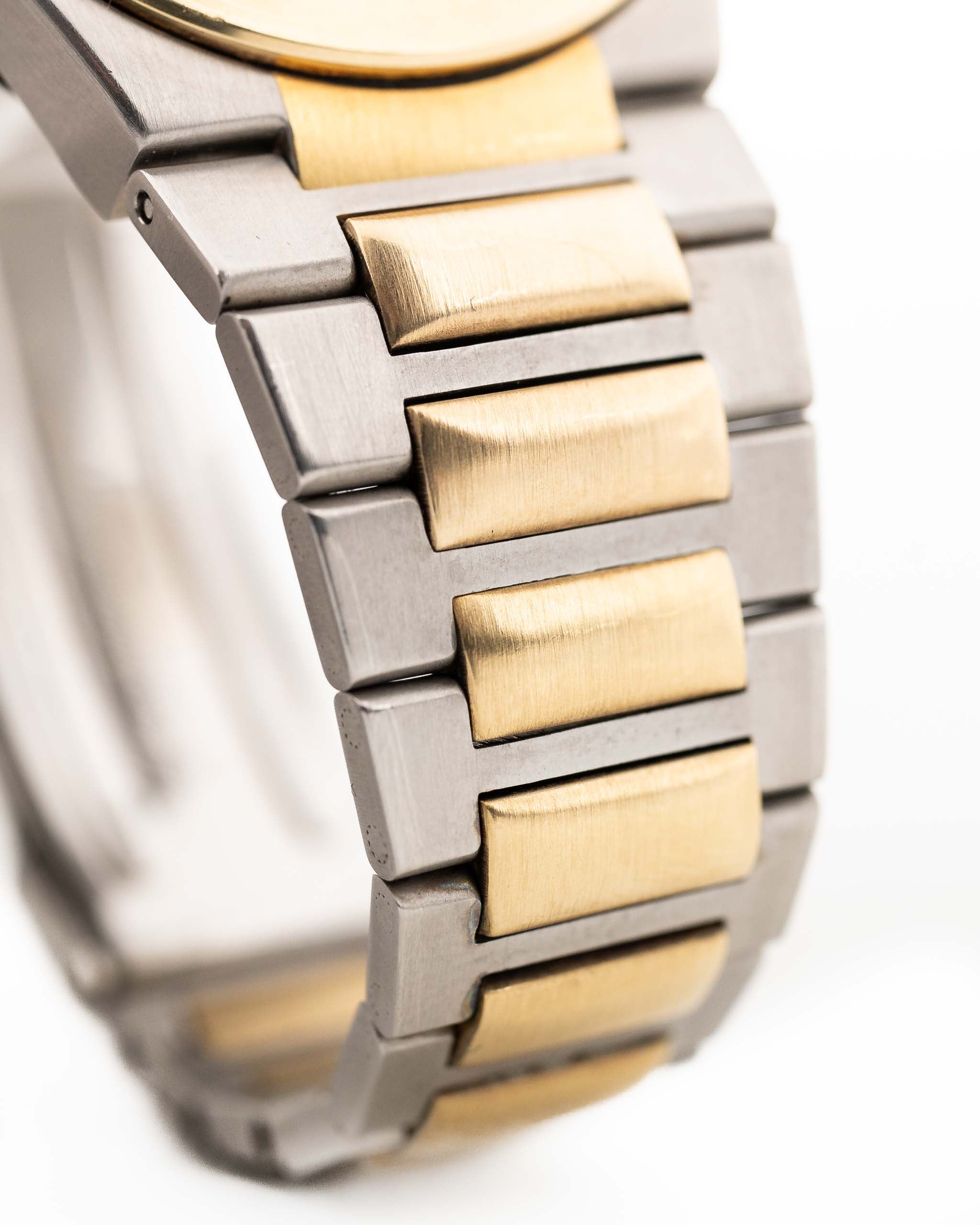 Produced for just a few short years between 1985 and 1989, reference 3505 is an elusive gem—especially in this two-tone variant with its 18k yellow gold bezel and original golden papergraph dial. The integrated bracelet and tonneau case echo Gérald Genta’s design language, while refined touches like gold indices, drilled bezel portholes, and a flawless original dial elevate the piece into collectible territory.