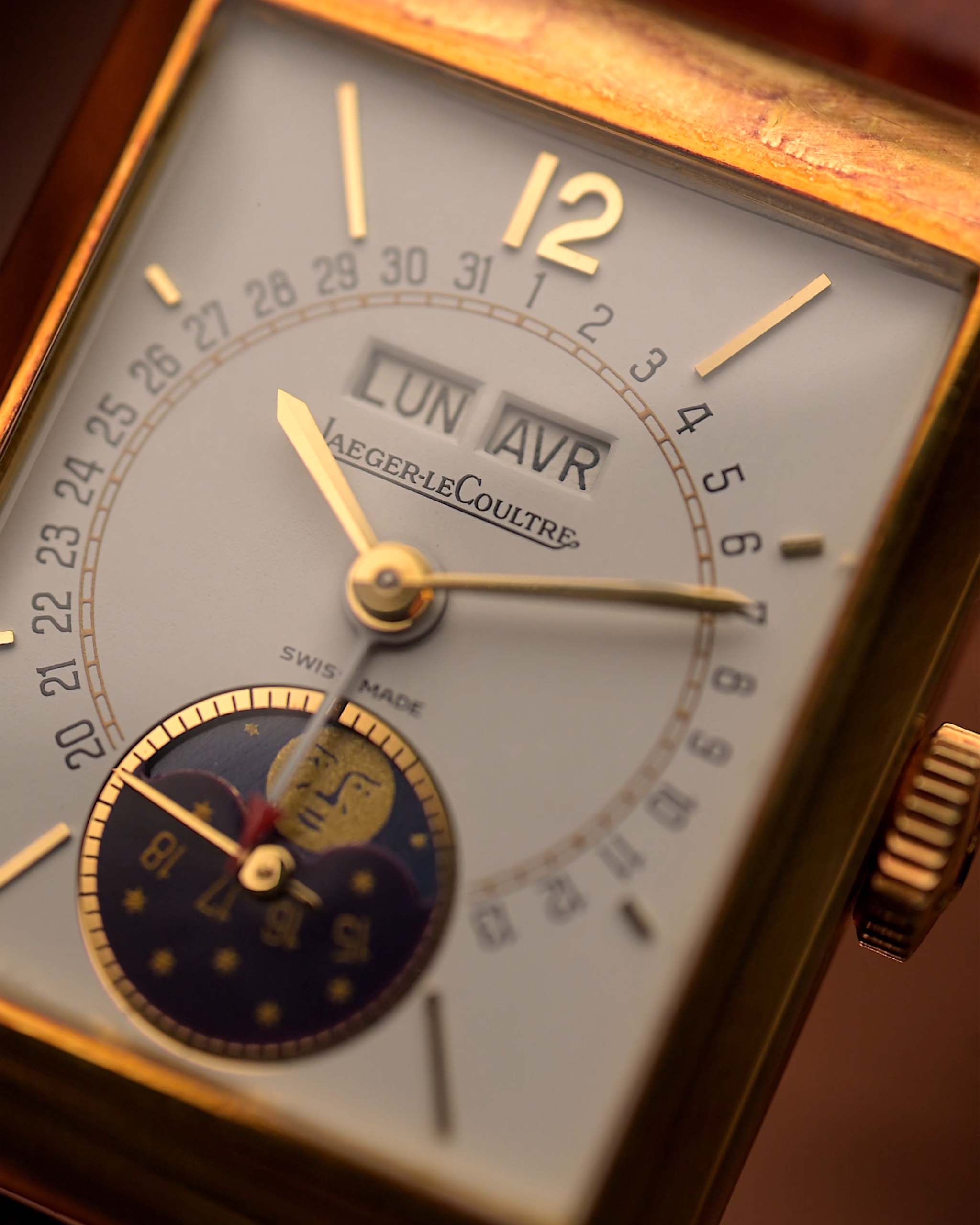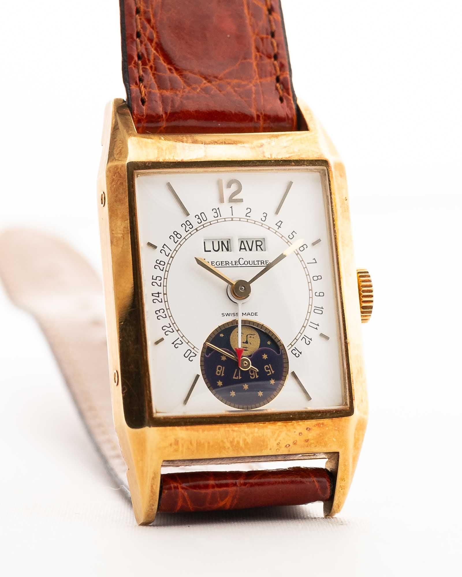 Produced in 1983 to celebrate 150 years of Jaeger-LeCoultre, this Ref. 141.010.1 is a rare Série Unique limited edition wristwatch, made in only 600 pieces. Crafted in 18k yellow gold, it features a refined rectangular case and a sophisticated triple calendar with moonphase, a hallmark of classical haute horlogerie.