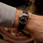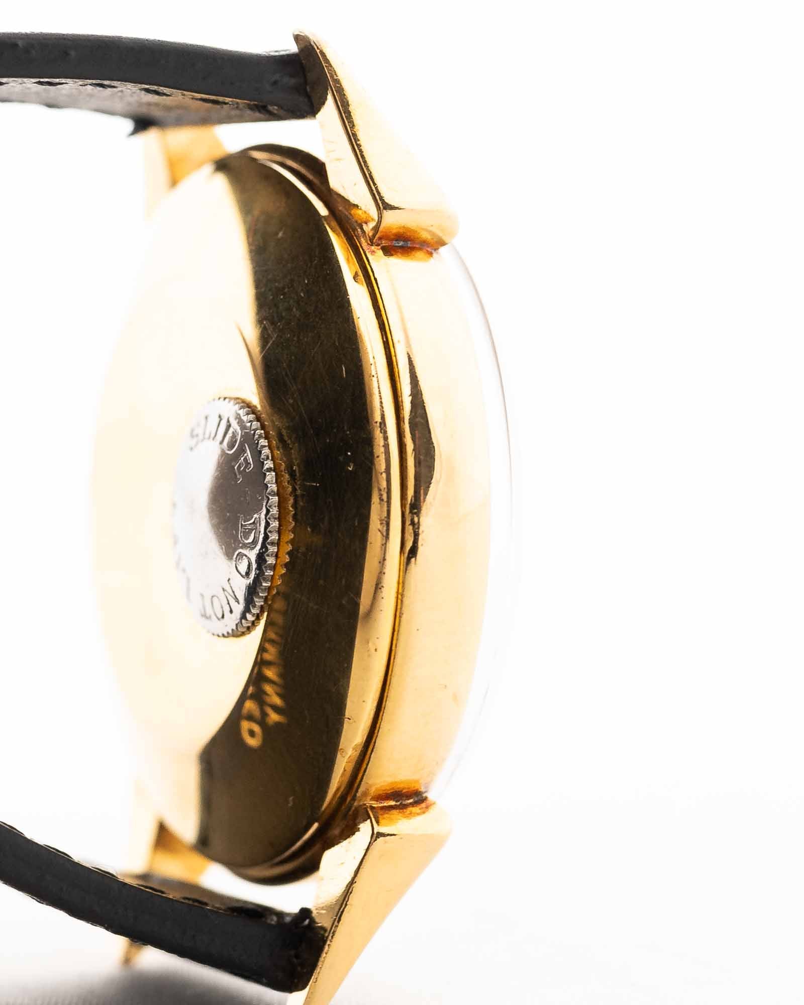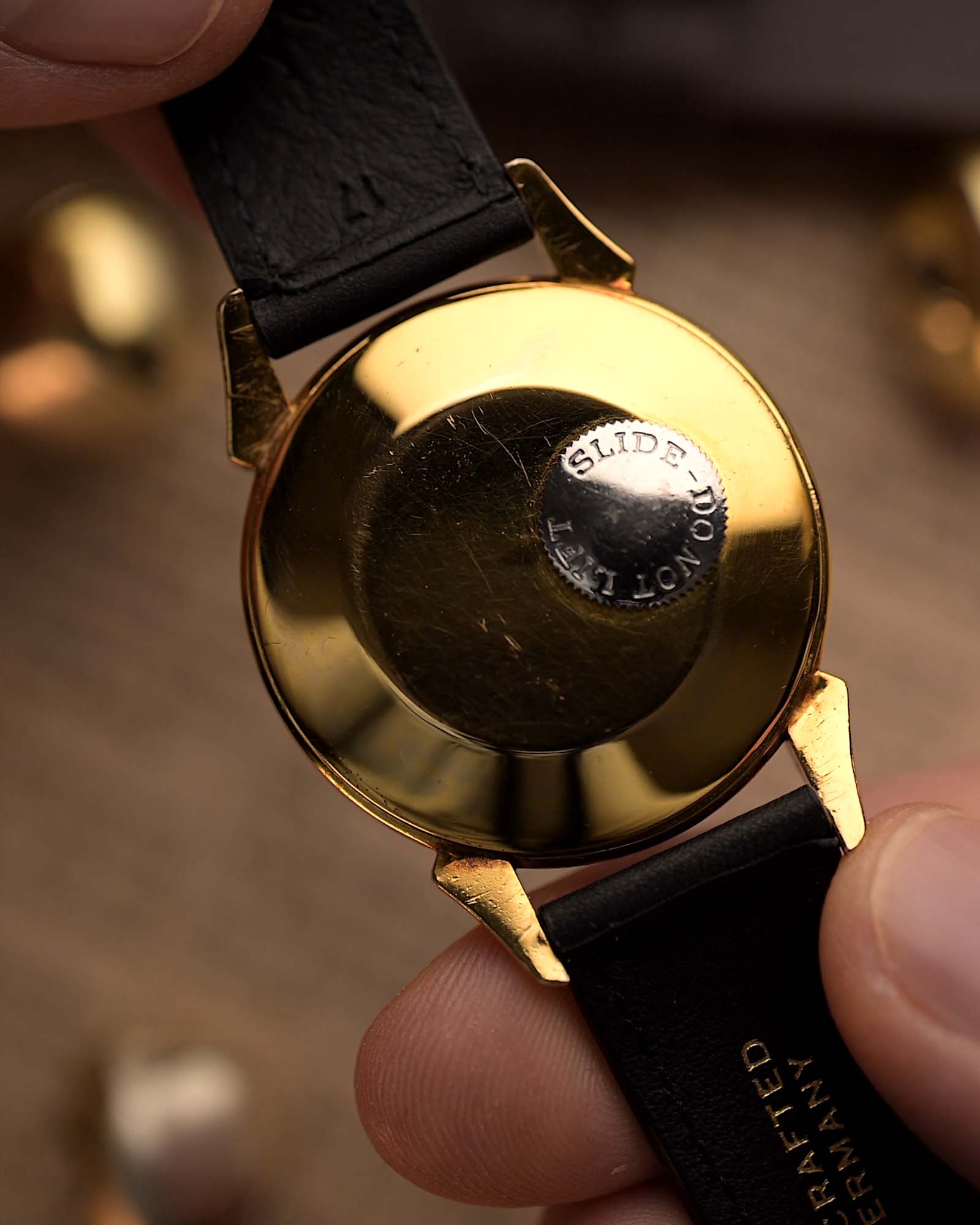This example stands out with its striking black dial, applied markers, and elegant dauphine hands — a pure expression of mid-century modern aesthetics. The yellow gold-filled case offers strong wrist presence while remaining refined and wearable.