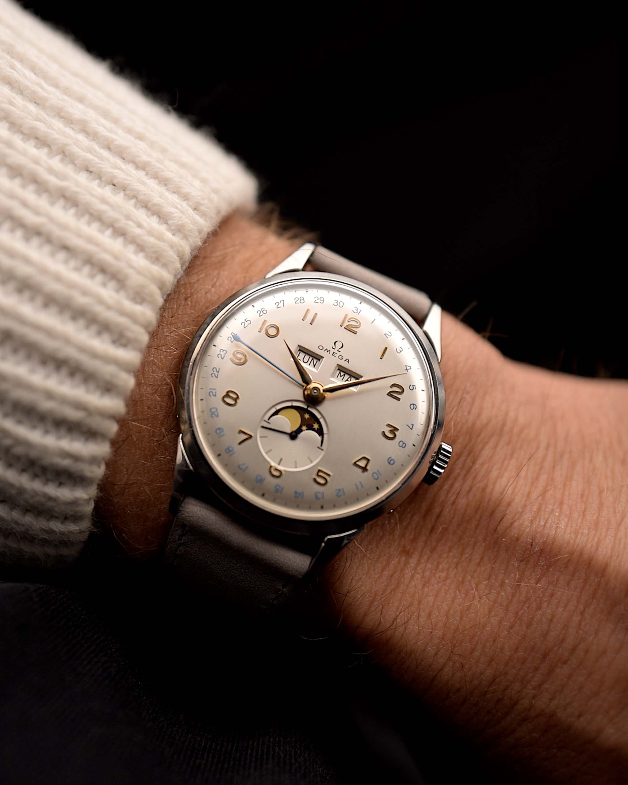 The Omega Cosmic was introduced in 1947 as the most prestigious model in Omega’s post-war catalogue — and this Reference 2486 shows exactly why. Housed in a rare 37 mm stainless steel case, it features a complete calendar with moonphase complication.