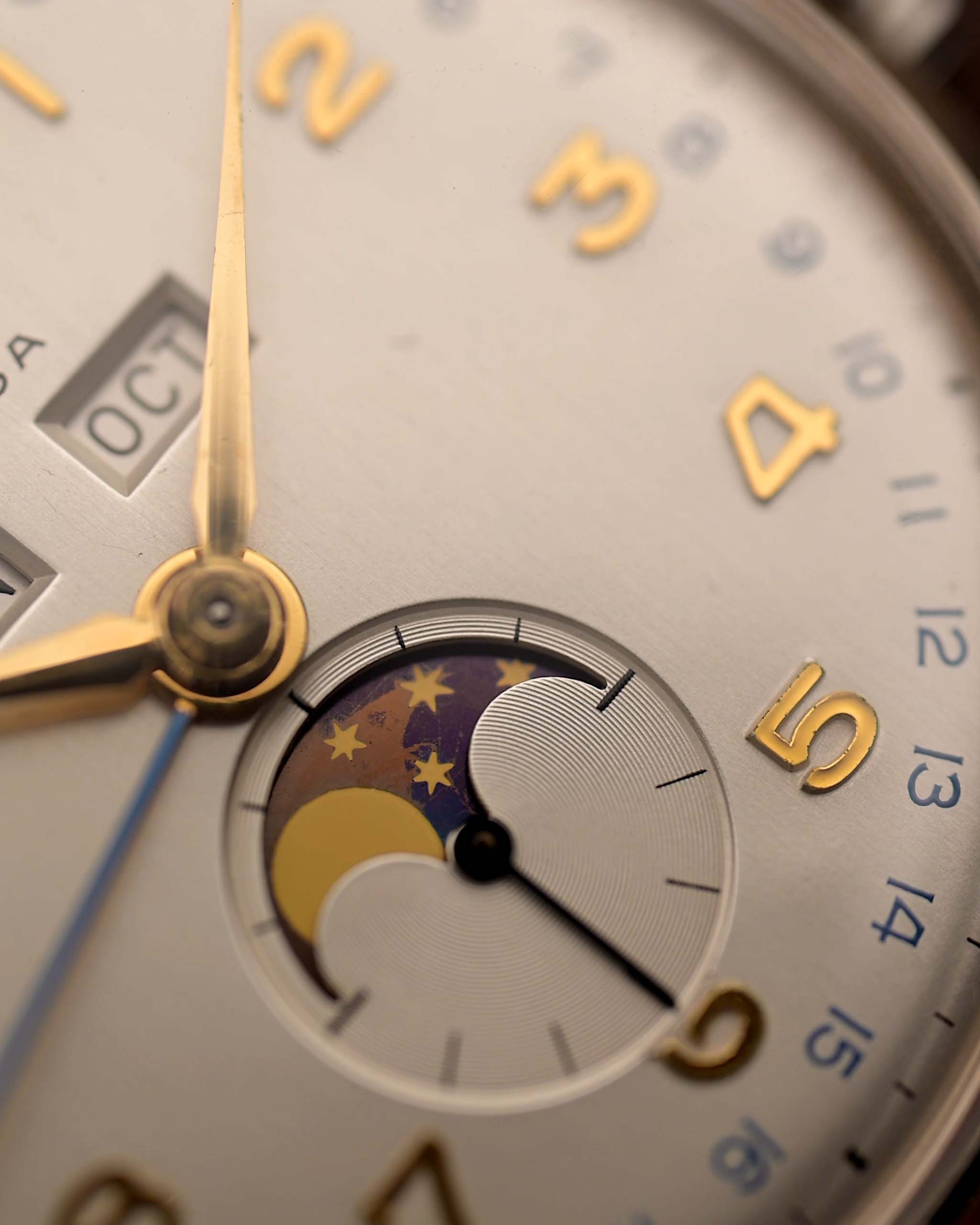 The elegant dial showcases day and month windows at the top (French language wheels), a moonphase within the sub-seconds at six, and a vibrant blue date track encircling the design. Combined with gold hands, a blue date hand, and the warm patina of time, this piece has undeniable charisma.
