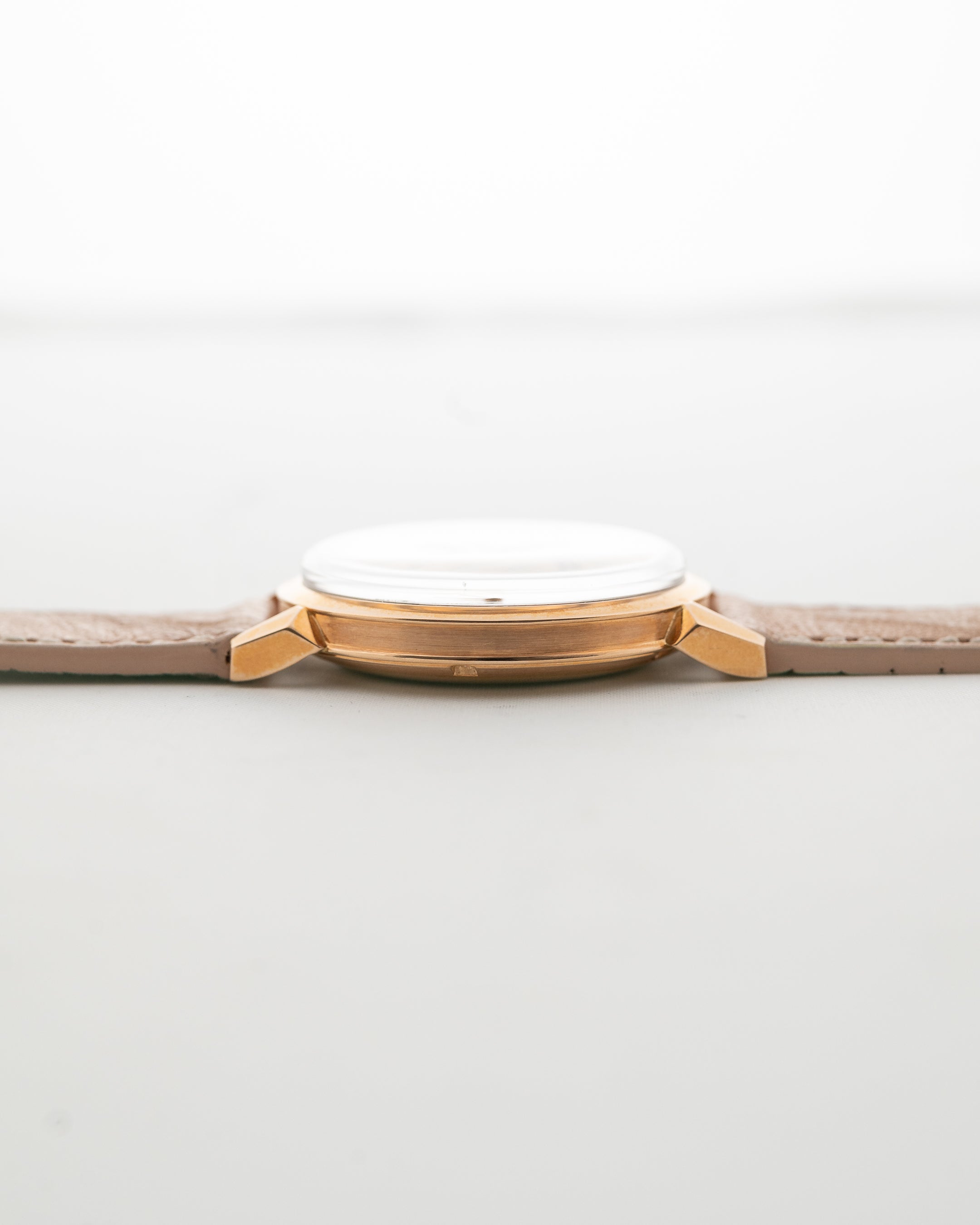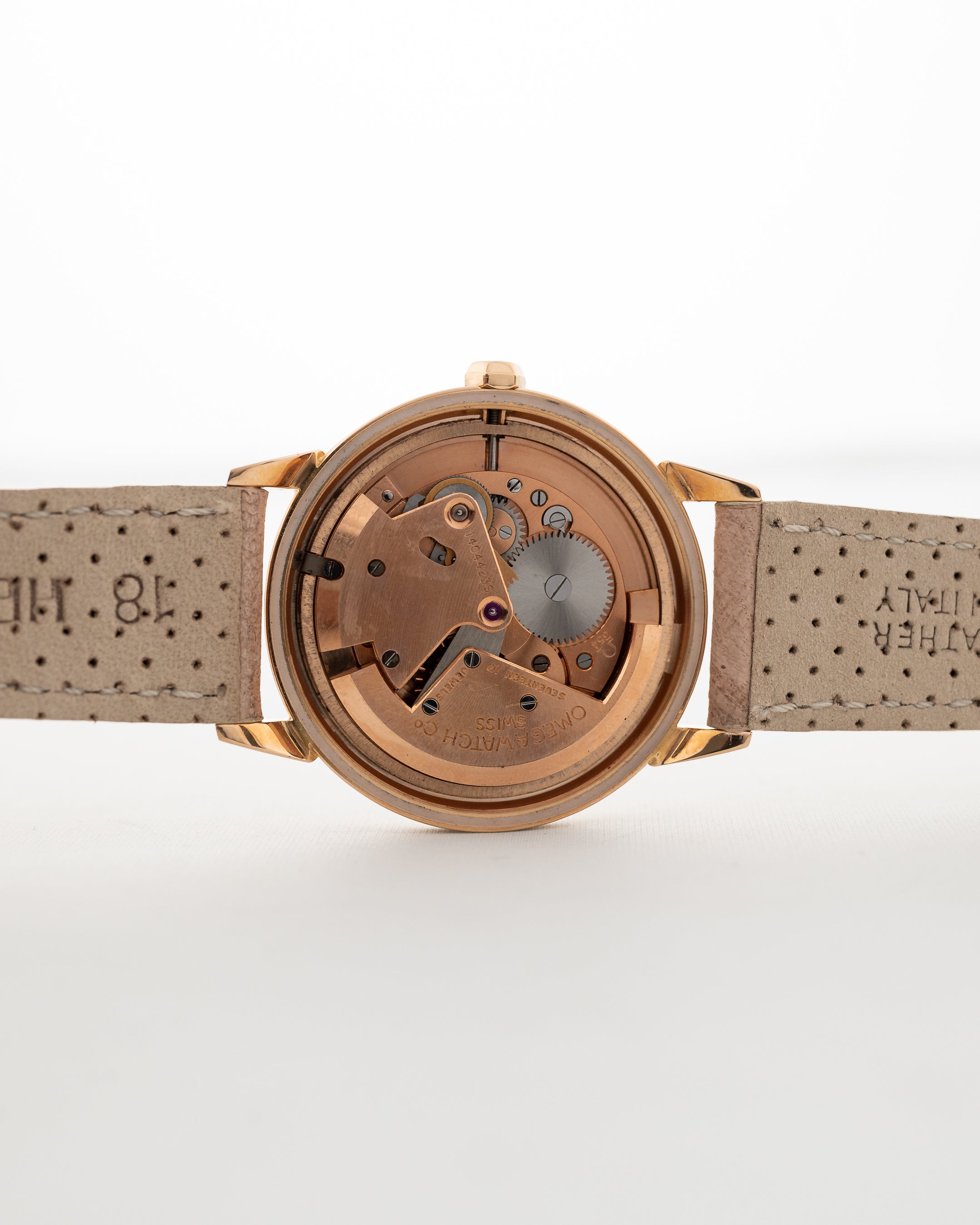Here you can see a fascinating dress watch made by Omega in 1954. It features a 35,5 mm 18k rose gold case with thin and great angled lugs and a stunning two tone silver dial with even leopard patina and rose gold arrow hour markers, a piece that take your breath away.