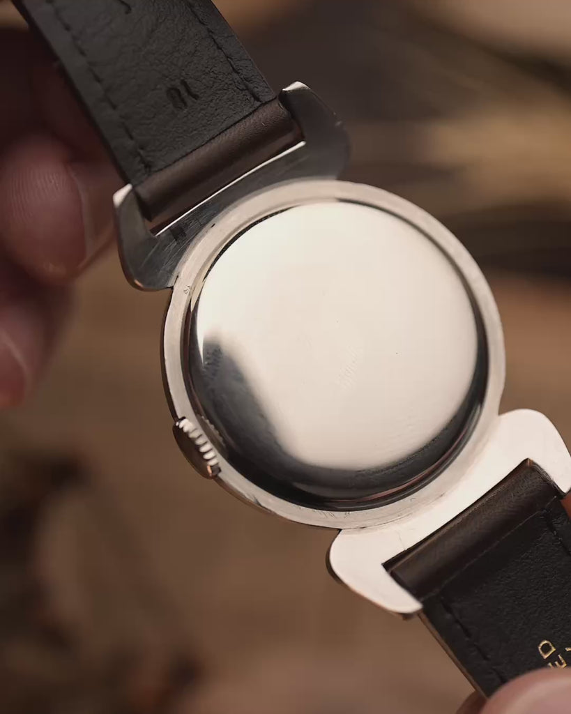 This rare and stunning Omega from 1939 showcases one of the most dramatic case designs of the pre-war era: the oversized “scarab” lugs, extending the case to nearly 50 mm lug-to-lug and giving it the wrist presence of a modern 37–38 mm watch.