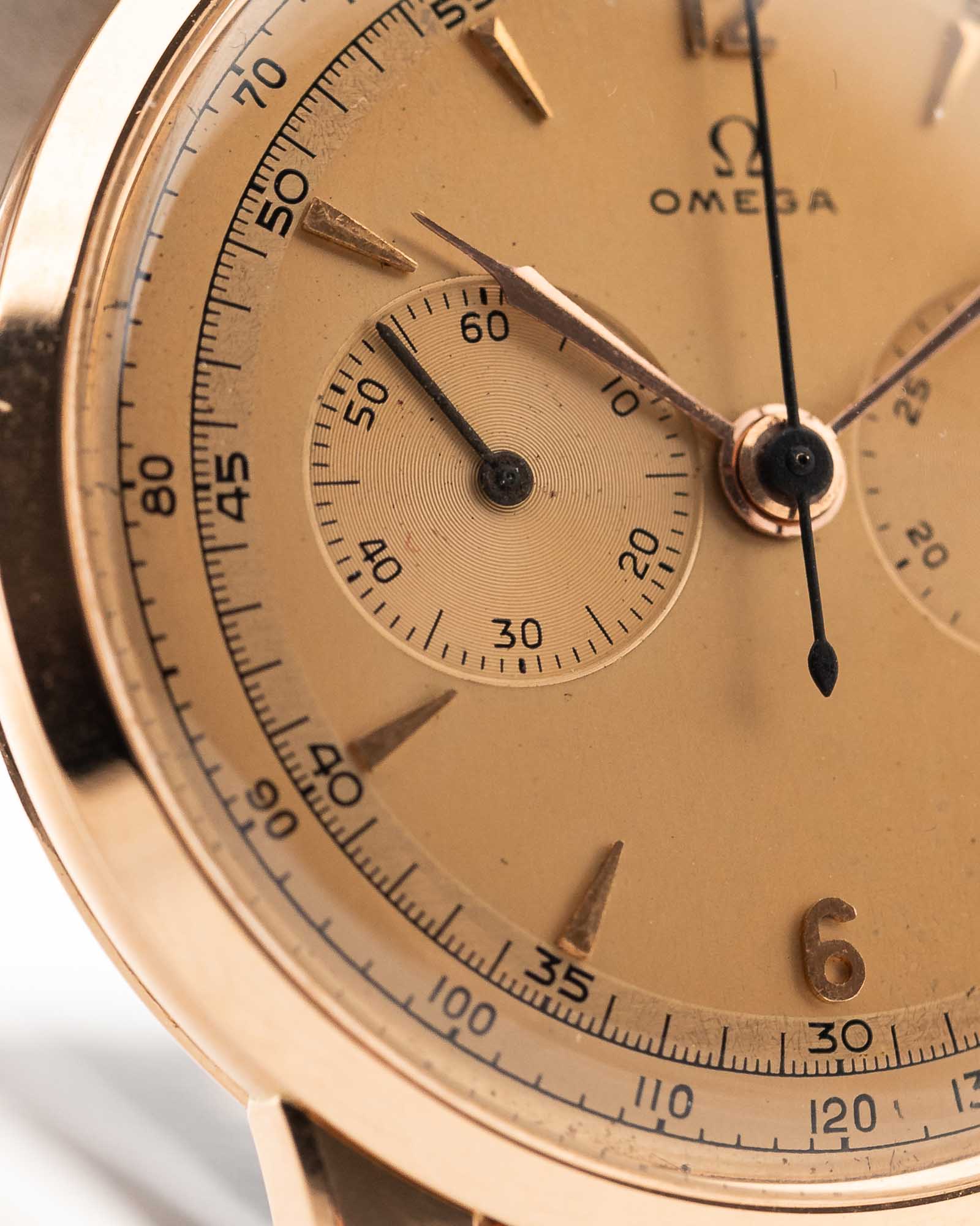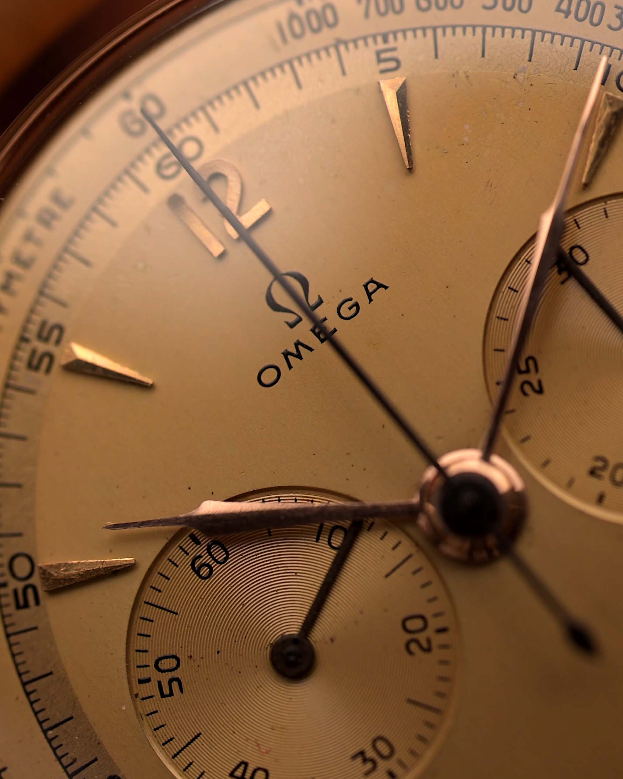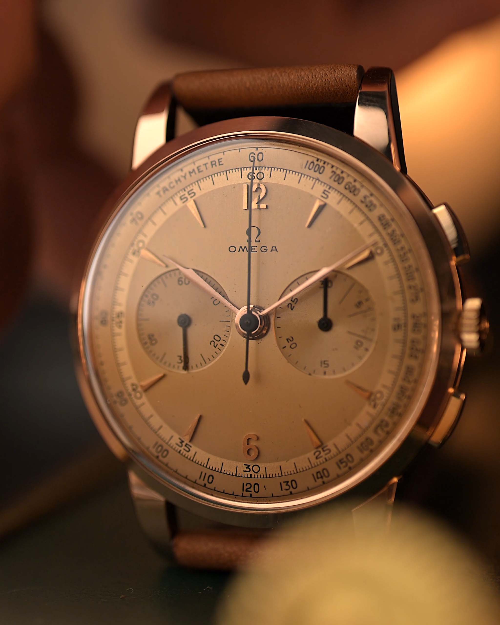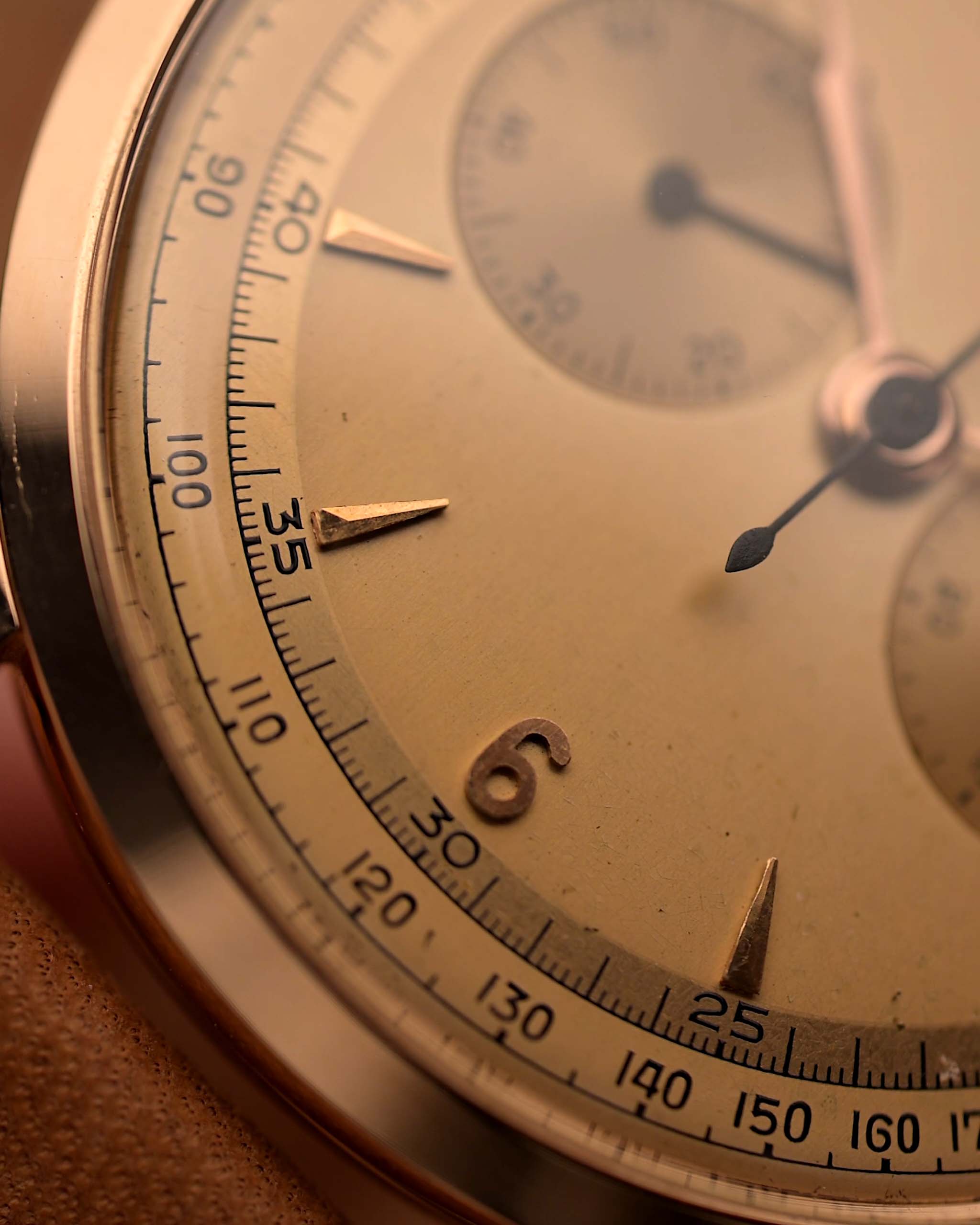 A true collector’s gem from the golden age of chronographs — the Omega Chronograph Cal. 320 Jumbo in 18k rose gold.