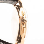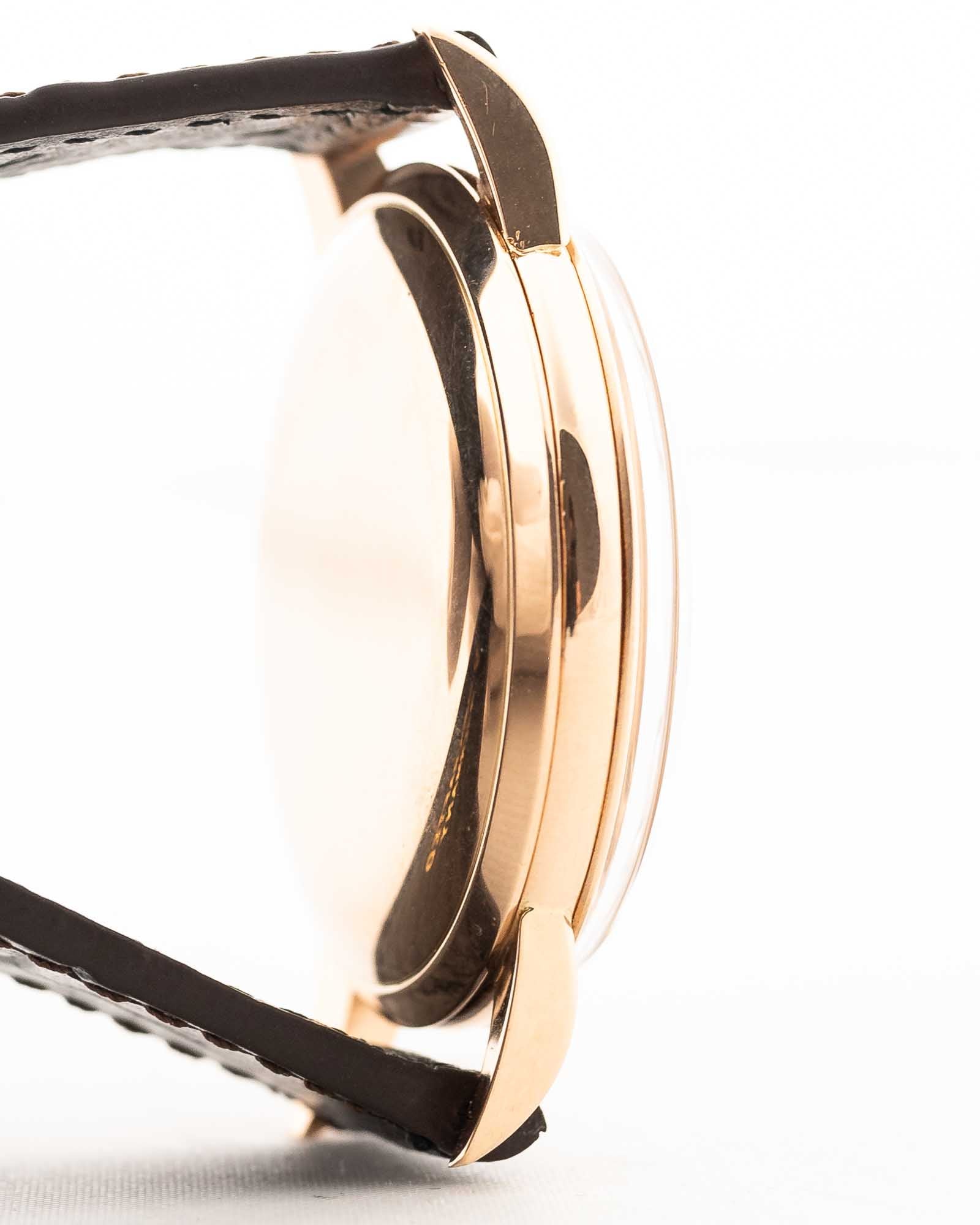 This example dates to 1944 and is housed in a striking 37.5 mm 18k rose gold jumbo case with elegant, slightly downturned lugs. The silver dial, now showing a warm rose-hued patina, pairs beautifully with rose gold hands and hour markers.