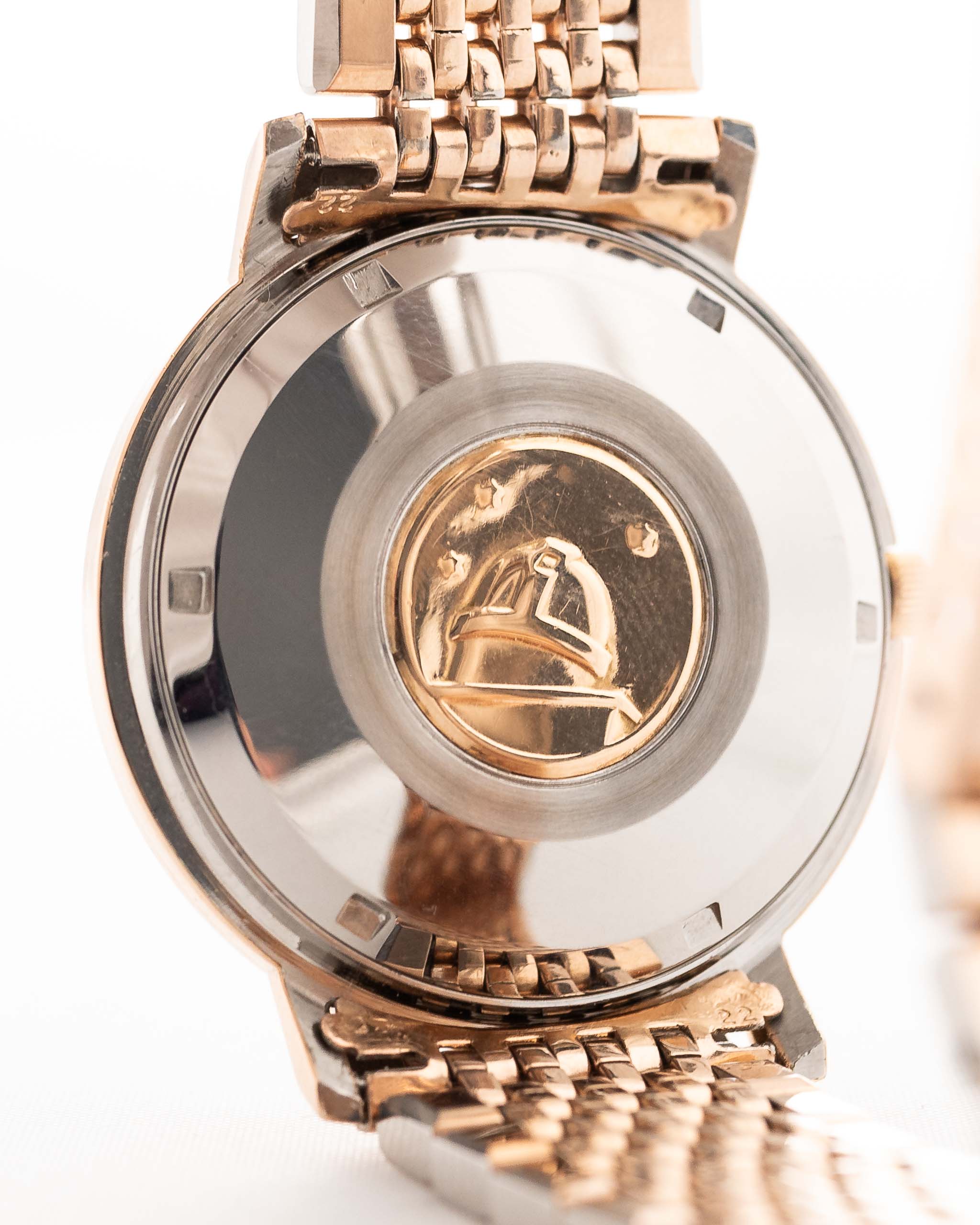 The 35.5 mm rose gold plated case displays sharp geometry and elegant contours, balanced by the signature pie pan dial in silver sunburst finish — an unmistakable hallmark of early Constellations. Slim baton indices with onyx inlay and faceted dauphine hands complete the picture, capturing the mid-century ideal of refined understatement.