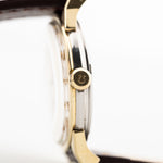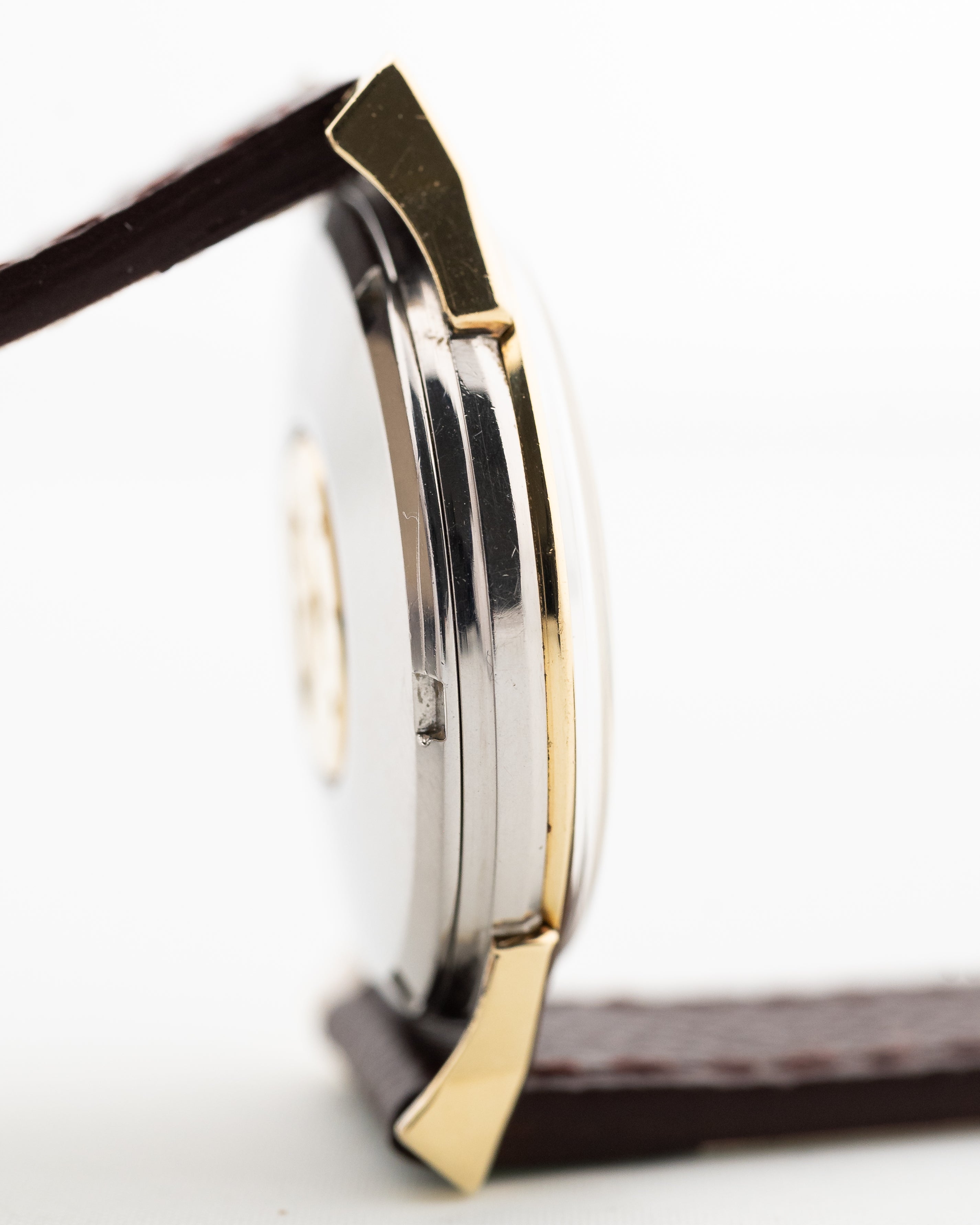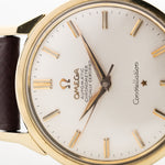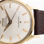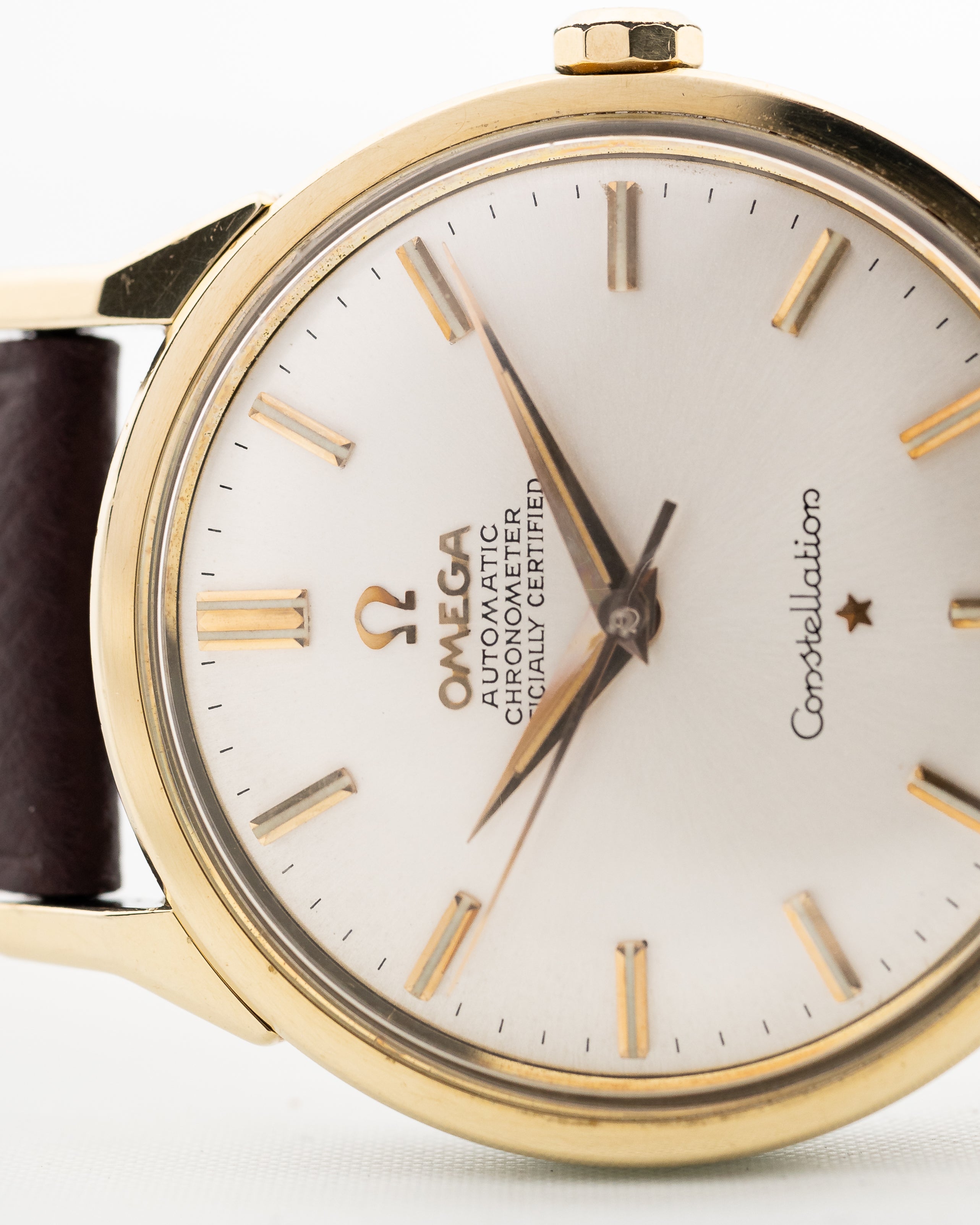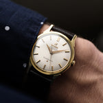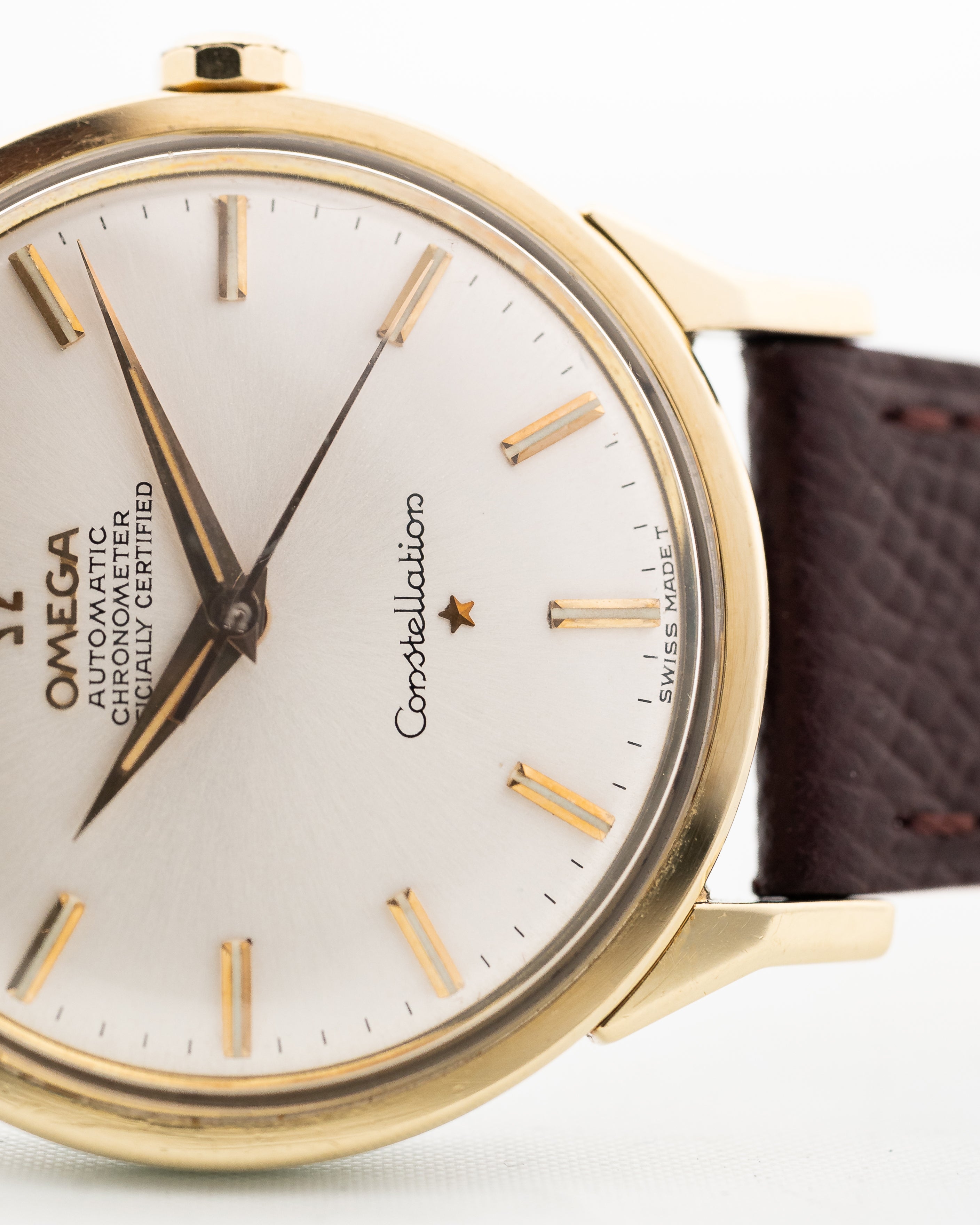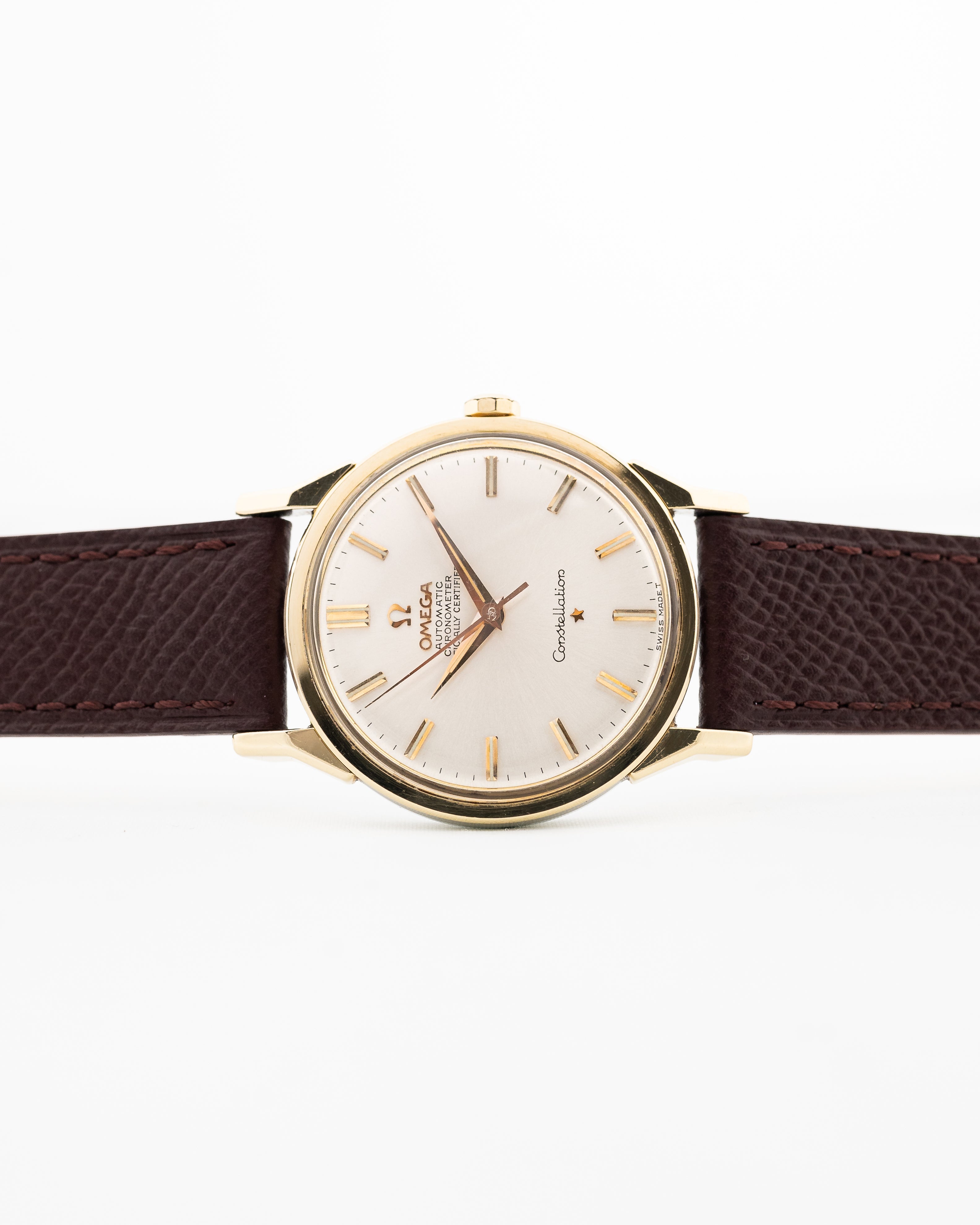 This compact and beautiful Omega Constellation automatic chronometer has everything you want in a dress watch: 34 mm yellow gold plated case, center seconds, a very beautiful white dial and rare slim baton hour markers with tritium inlay. First released in 1952, the Constellation was Omega's answer to the Rolex Datejust.
