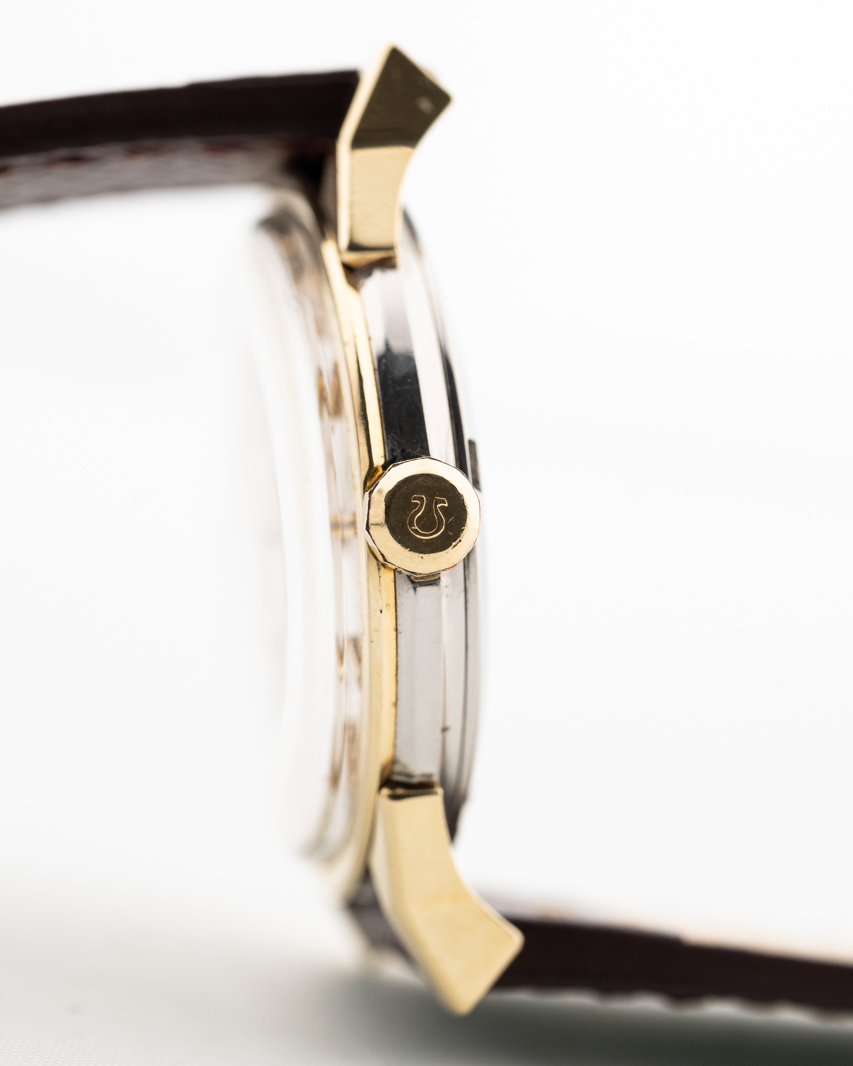 Well-proportioned, simple, and classic, this Constellation features a screw-down case back, Omega automatic chronometer Caliber 551 and great slightly down turned lugs in nearly unworn condition.