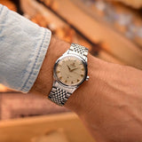 The 35 mm stainless steel case is well-proportioned and timeless, with gently downturned lugs and a clean snap-on case back. This particular piece also retains its original Omega “beads of rice” bracelet, a highly collectible and comfortable addition.