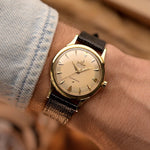 Launched in 1954, the Omega Constellation was created to compete with the Rolex Datejust — and this early reference 2782 is a fantastic example of that mission. With its 35 mm 18k yellow gold case, classic two tone dial, and striking dagger markers, it’s a wearable piece of horological history.