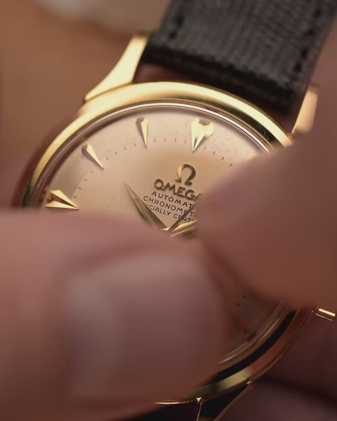 This reference houses Omega’s early Caliber 354 bumper automatic chronometer movement, offering mechanical charm and smooth operation in equal measure. The case was produced by Antoine Gerlach SA, and its slim profile and downturned lugs ensure a comfortable, elegant wrist presence.