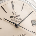 This compact and beautiful Omega Constellation Date automatic chronometer has everything you want in a daily dress watch: 34 mm stainless steel C-Shape case, center second, a very beautiful champagne colored sunburst dial and rare black stick hour markers and handset. First released in 1952, the Constellation was Omega's answer to the Rolex Datejust.