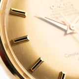 This compact and beautiful Omega Constellation automatic chronometer has everything you want in a dress watch: 35 mm 18k yellow gold case, center seconds, a very beautiful gold colored dial and rare slim baton hour markers with onyx inlay. First released in 1952, the Constellation was Omega's answer to the Rolex Datejust.