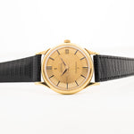 This compact and beautiful Omega Constellation automatic chronometer has everything you want in a dress watch: 34,5 mm 18k yellow gold case, center seconds, a very beautiful yellow gold colored dial and rare slim baton hour markers with onyx inlay. First released in 1952, the Constellation was Omega's answer to the Rolex Datejust.