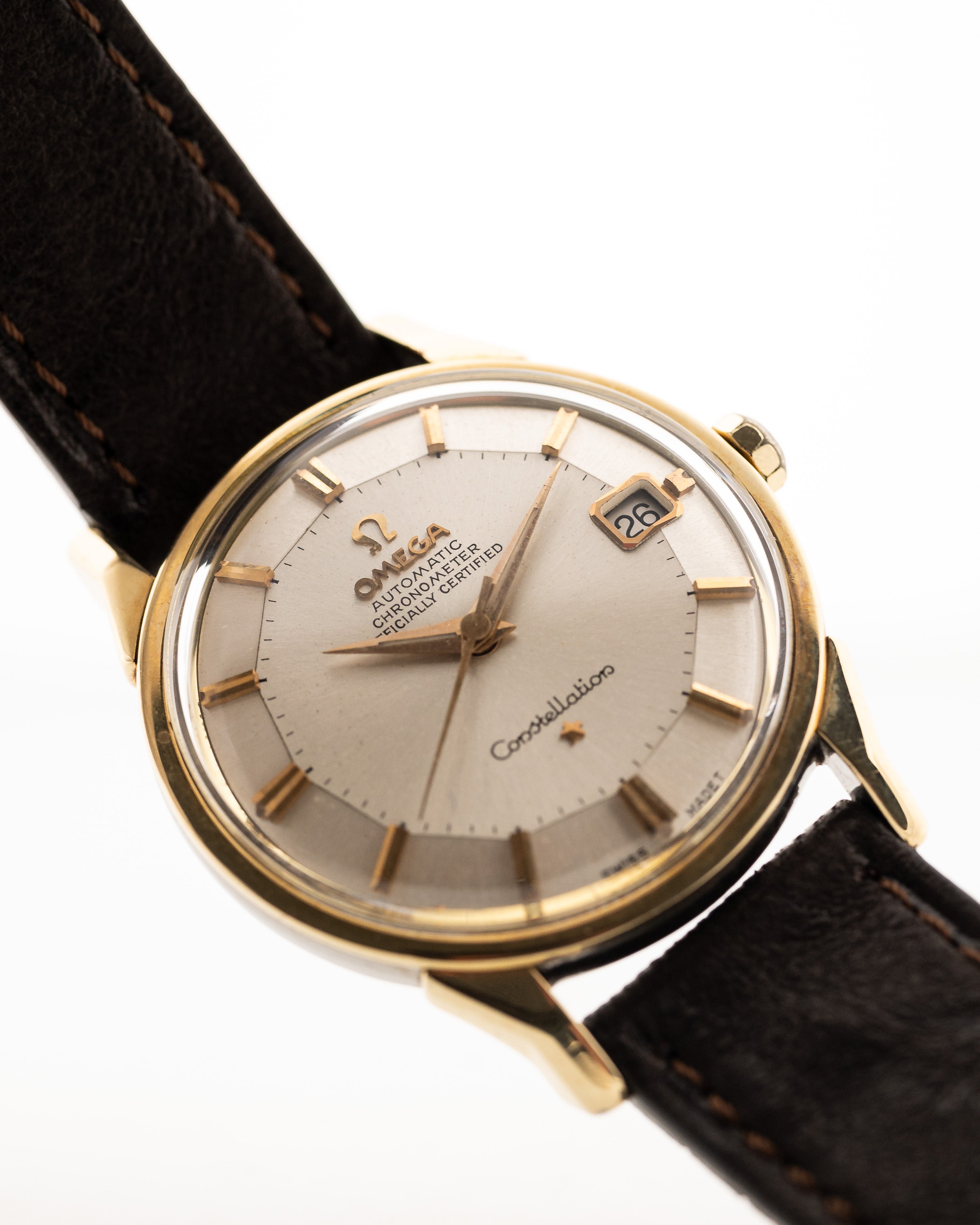 Well-proportioned, simple, and classic, this Constellation features a screw-down case back, Omega automatic chronometer Caliber 561 and great slightly down turned lugs.