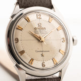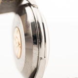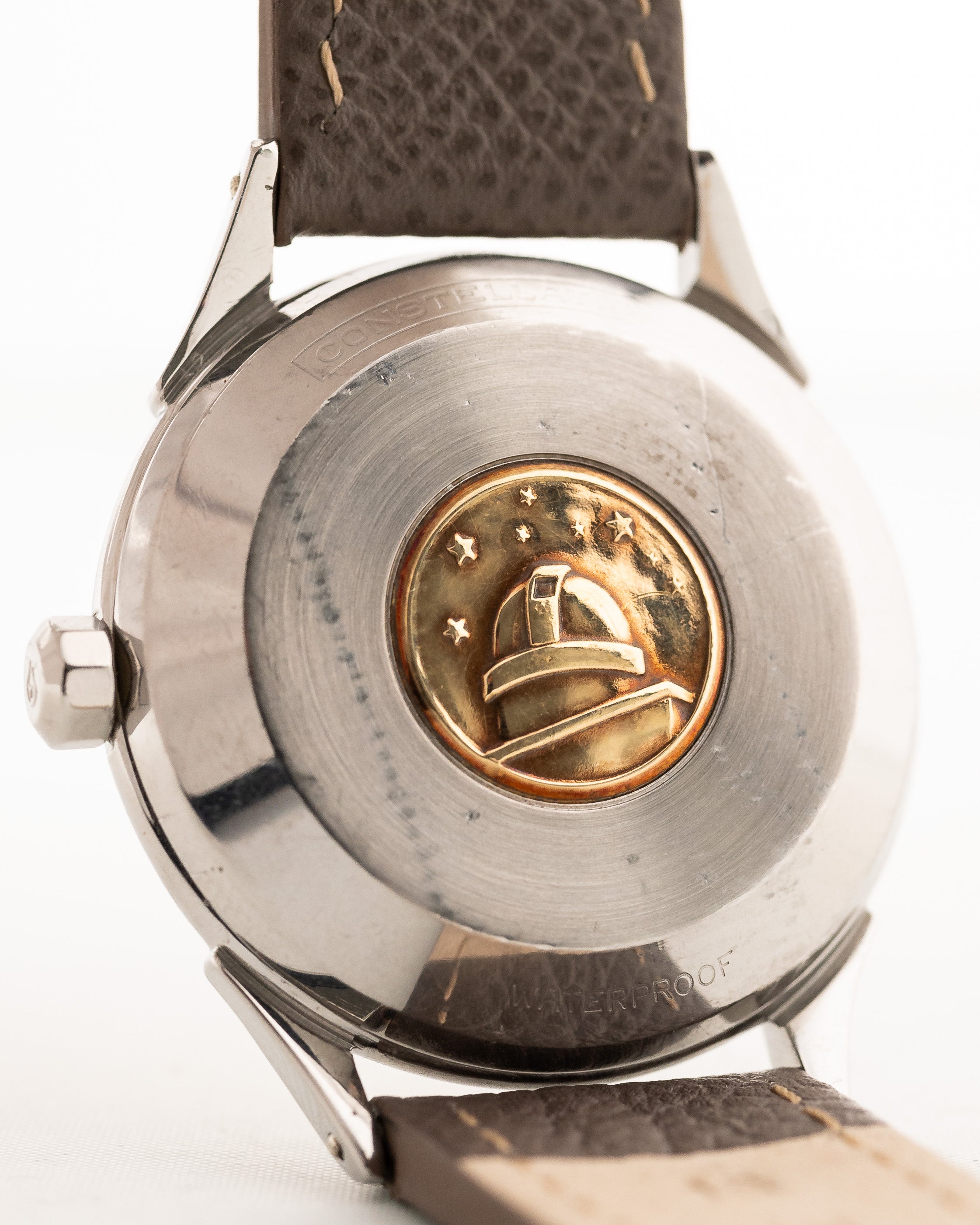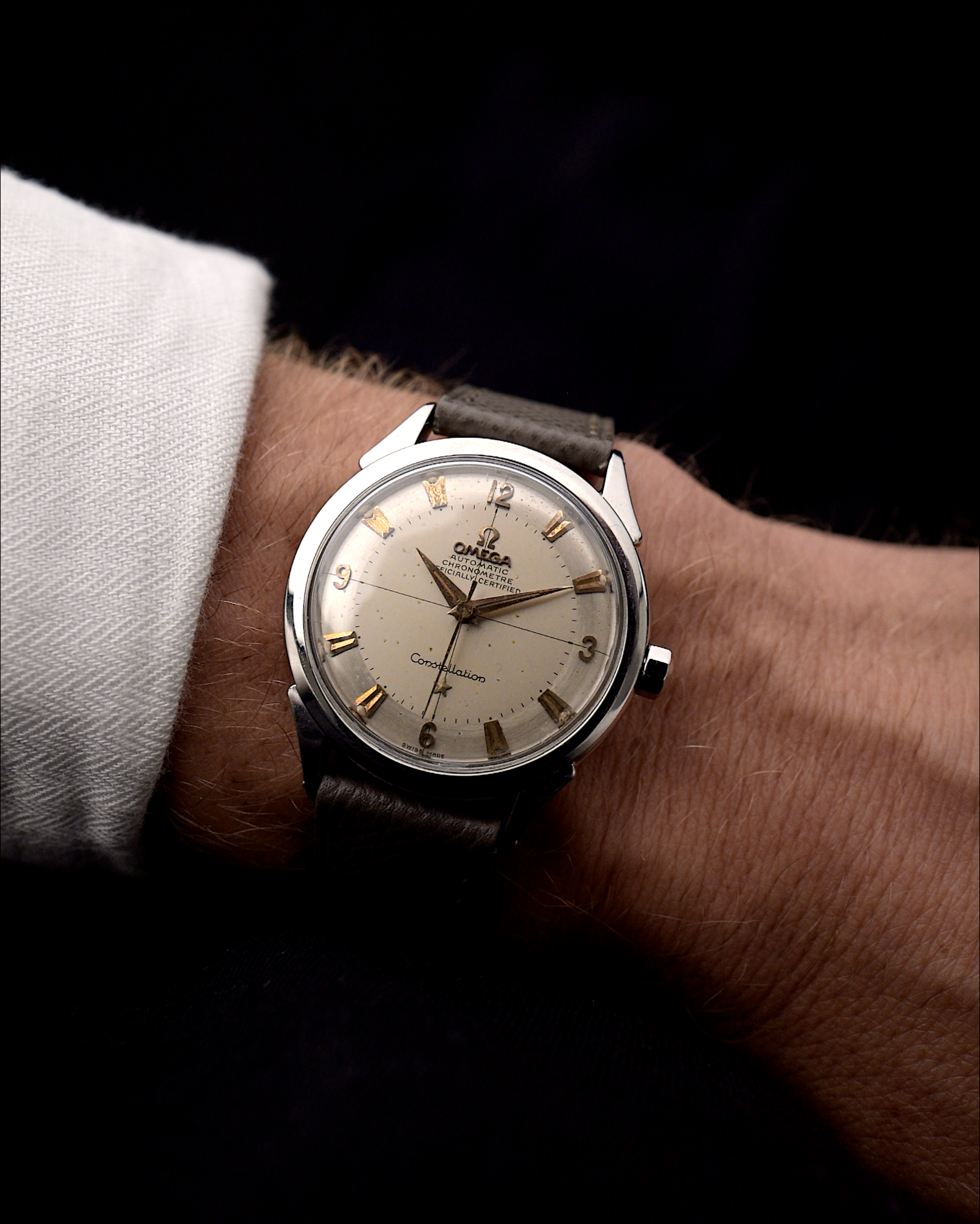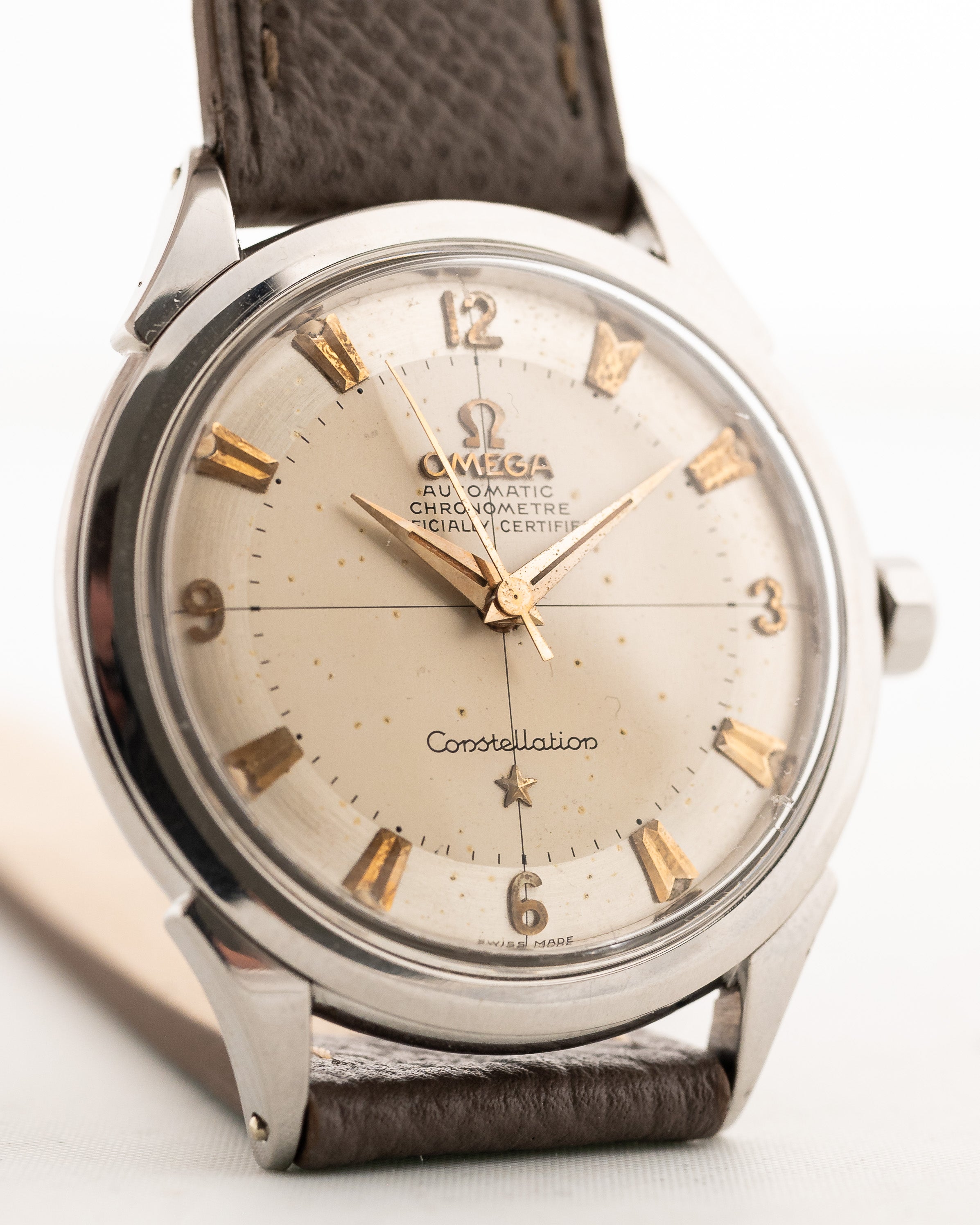 This compact and beautiful Omega Constellation automatic chronometer has everything you want in a dress watch: 35 mm stainless steel case, center seconds, a very beautiful silver two tone dial with crosshair, classic golden dauphine hands and golden hour markers. First released in 1952, the Constellation was Omega's answer to the Rolex Datejust.