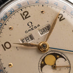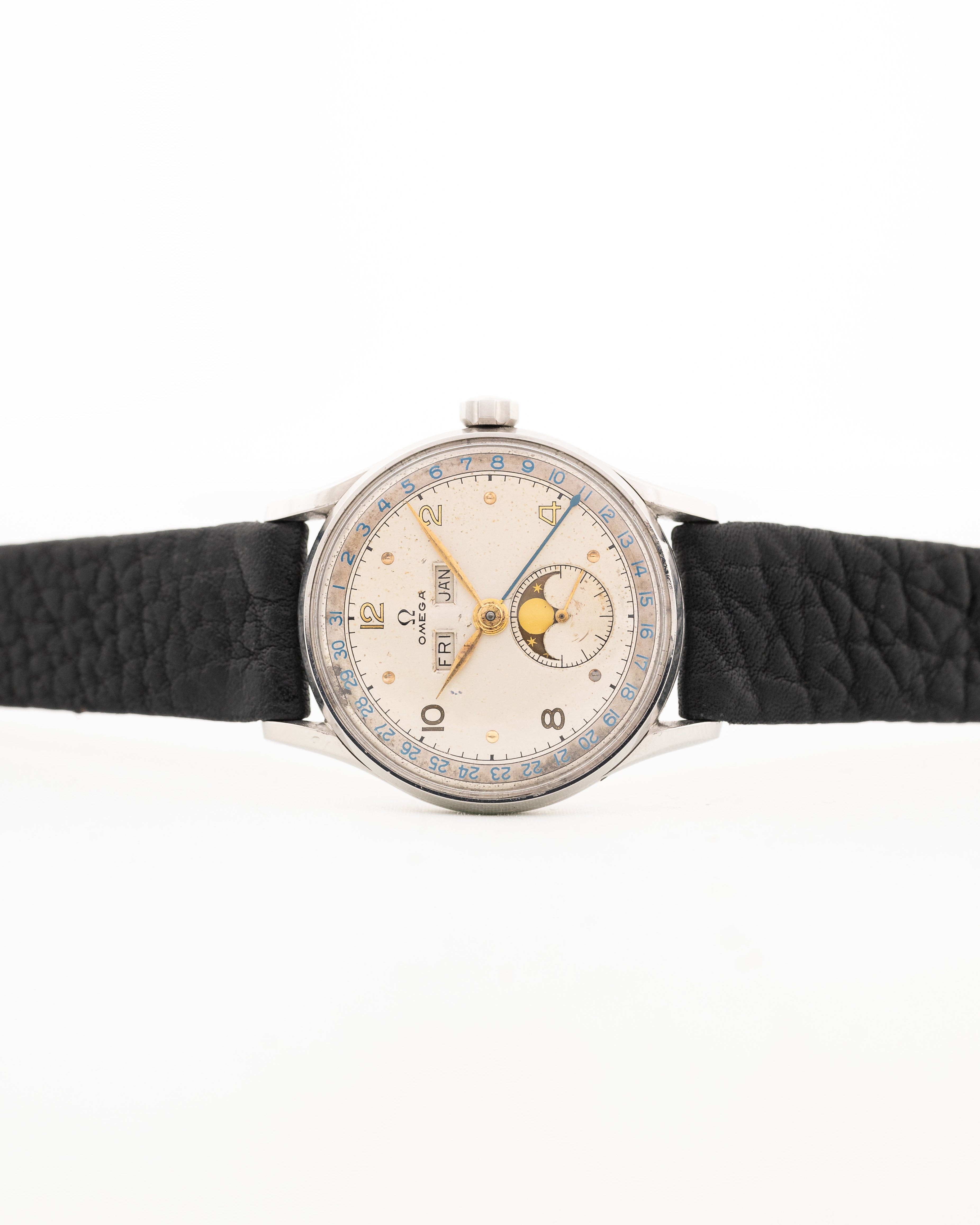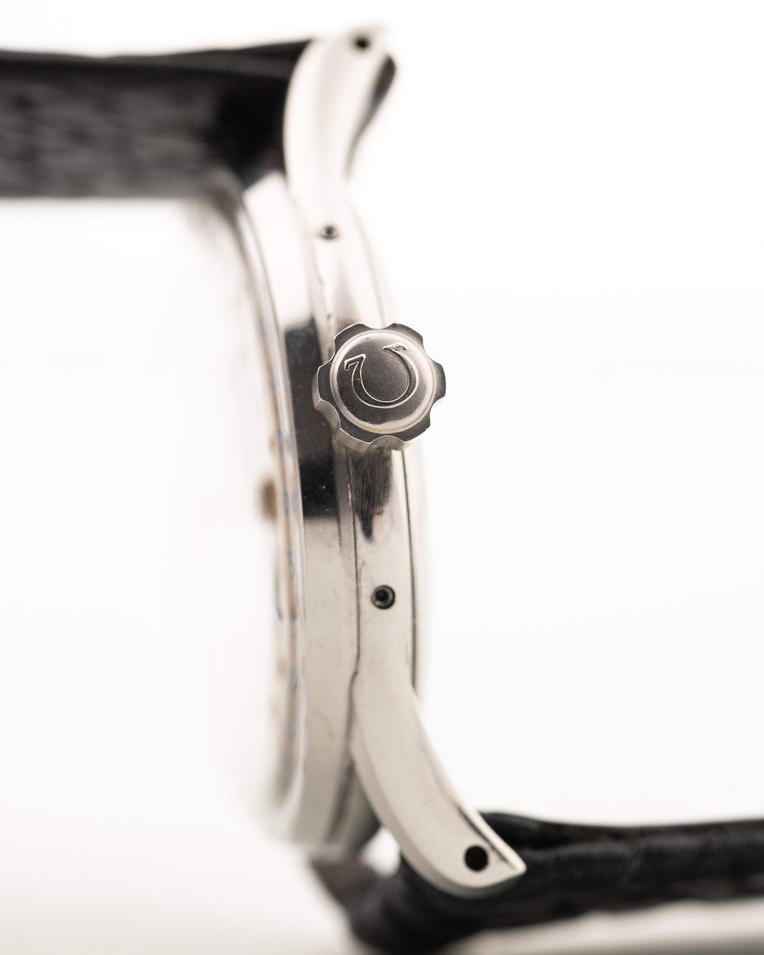The Omega Cosmic was introduced in 1947 and was in the catalogue until 1956 as the most prestigious watch in the brand’s catalogue. This example is a reference 2471-1 in stainless steel, measures 35mm and houses the Omega Cal. 27 DL PC moon phase movement.