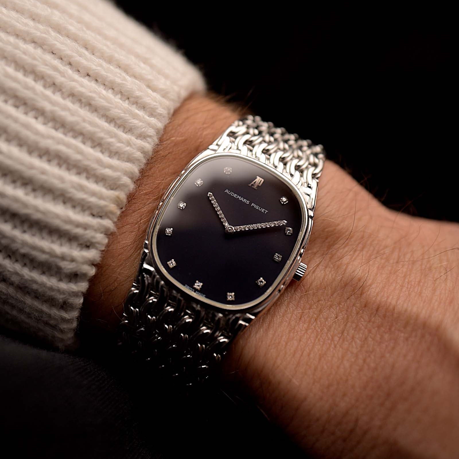 Classic vintage watch worn on a wrist above vintage watches and luxury watches on a desk.