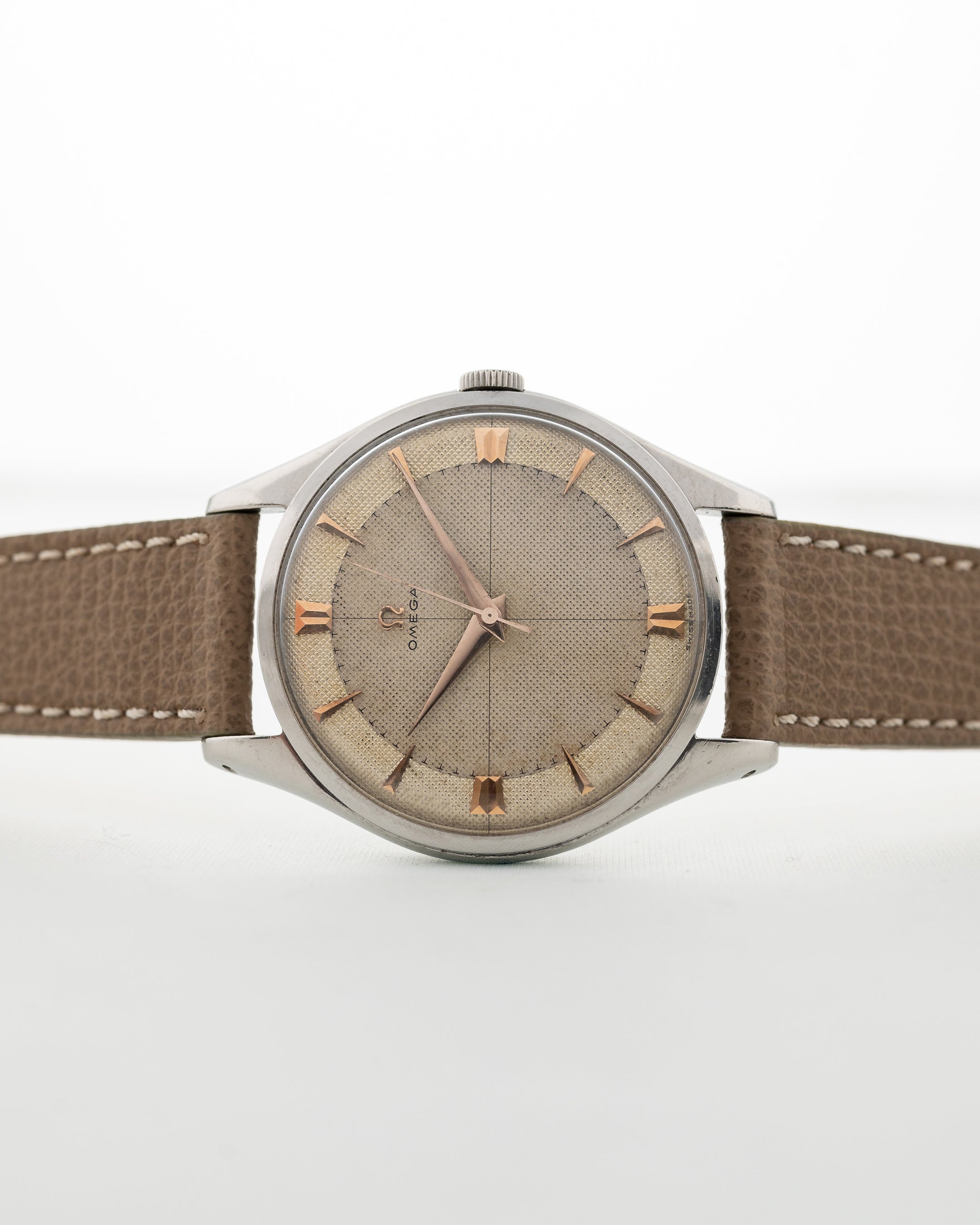 Vintage Omegas are king of the understated dress watch and this honeycomb version is no different. This 1952 Omega has everything you want in a dress watch - an oversized 38 mm case, a great honeycomb dial with subsidiary second and beautiful rose gold dauphine hands. Additionally, if features very elegant overlaid rose gold arrow indexes and the very precise Omega caliber 283.