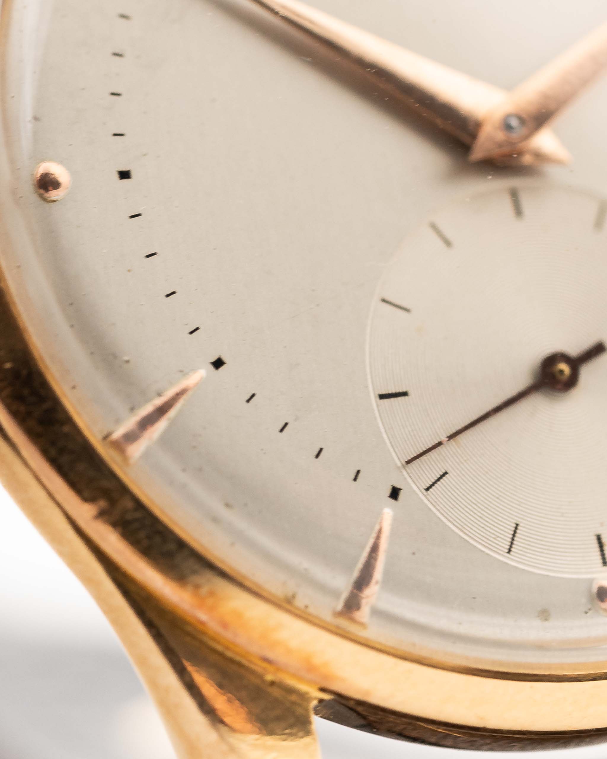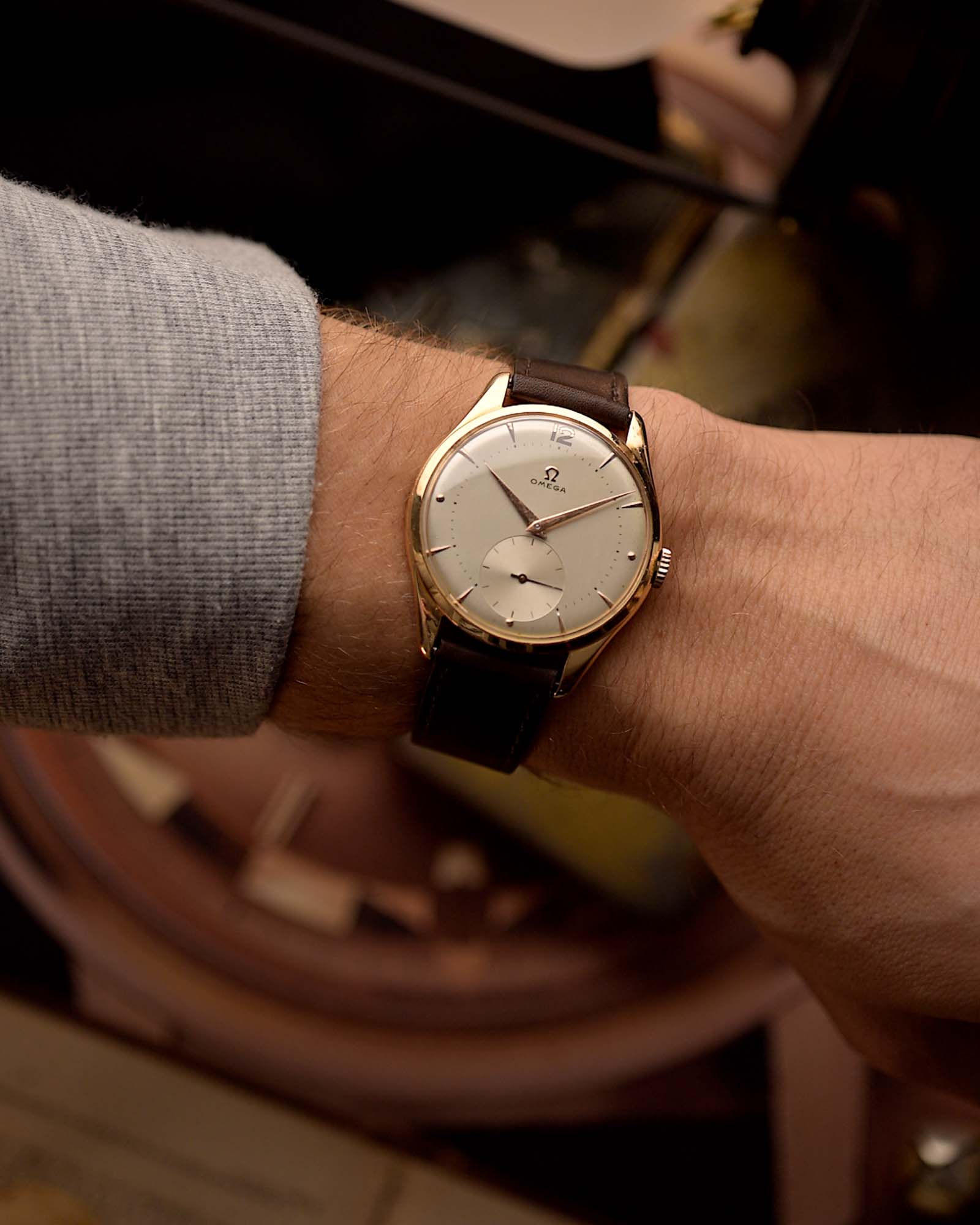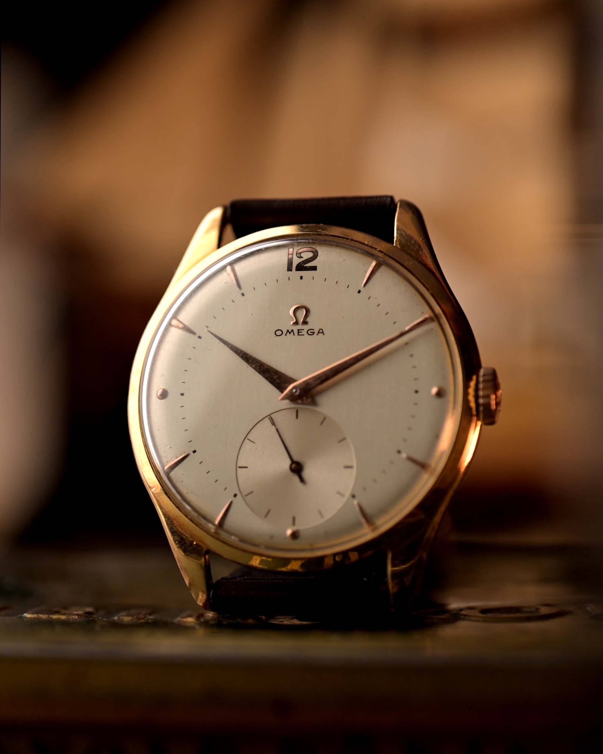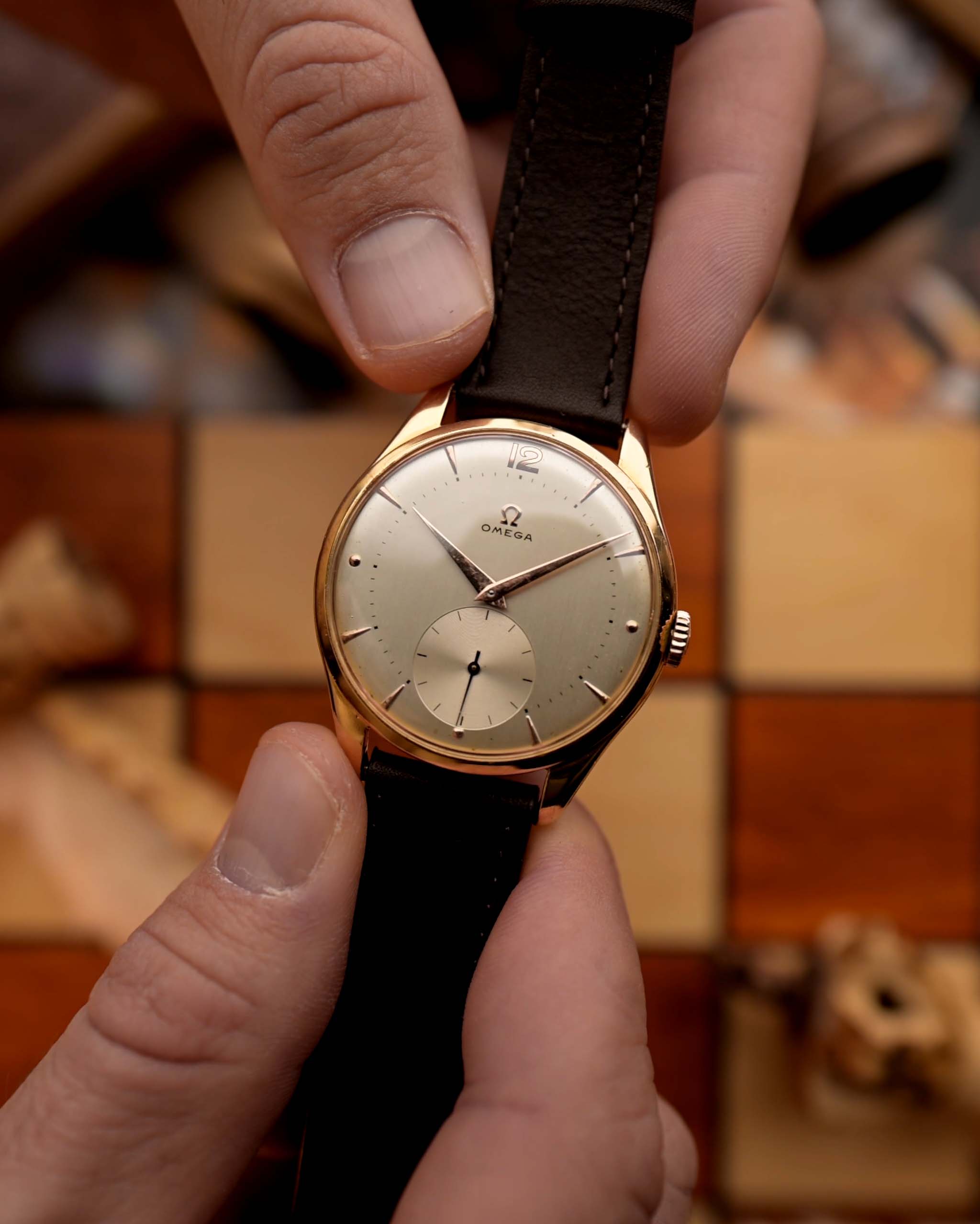 This Omega Ref. 2620 from 1947 is a striking example of the brand’s mid-century elegance, defined by clean geometry, refined details, and beautifully balanced proportions. The Jumbo 38 mm 18k rose gold case— large for its era — gives the watch a confident yet understated presence on the wrist.