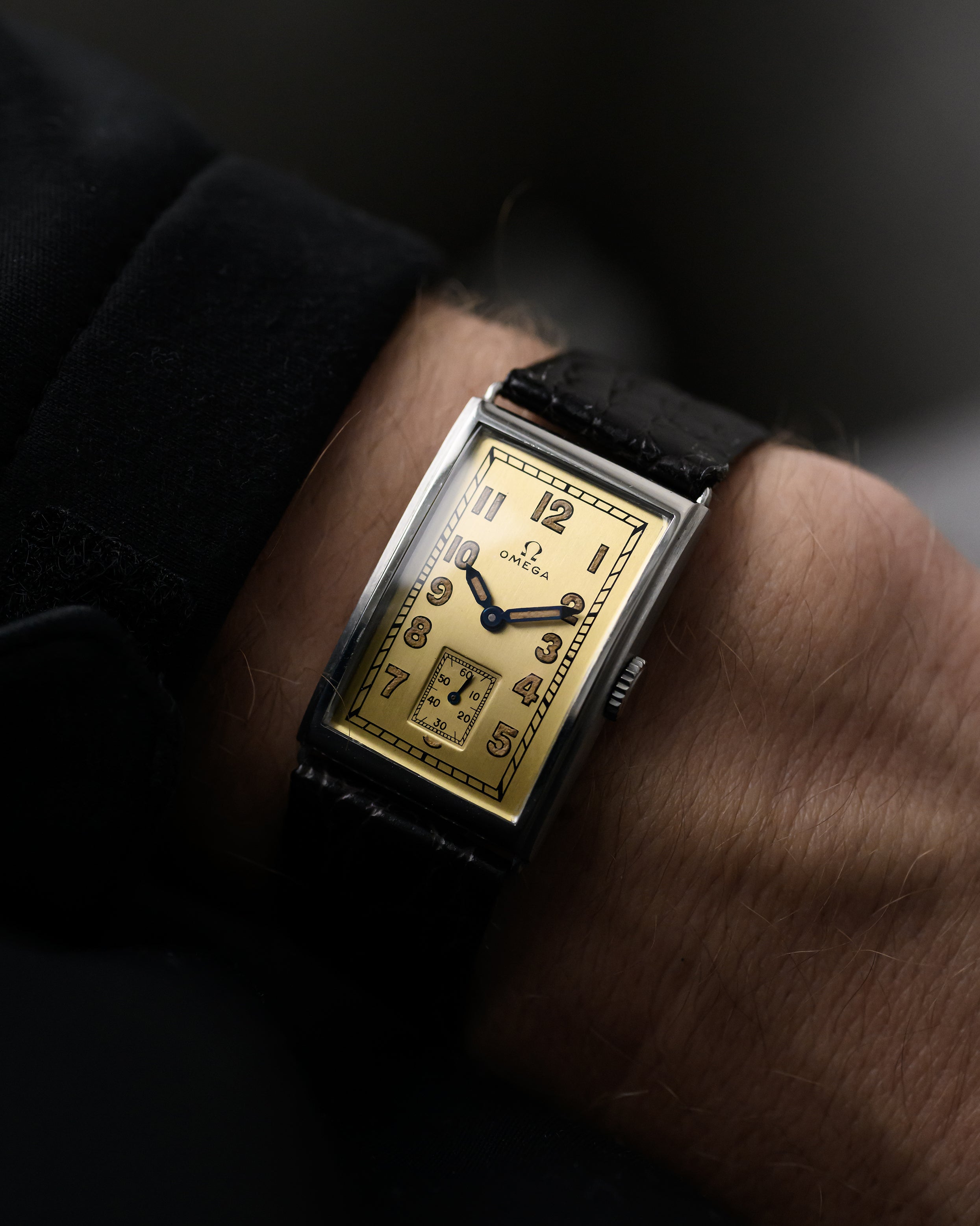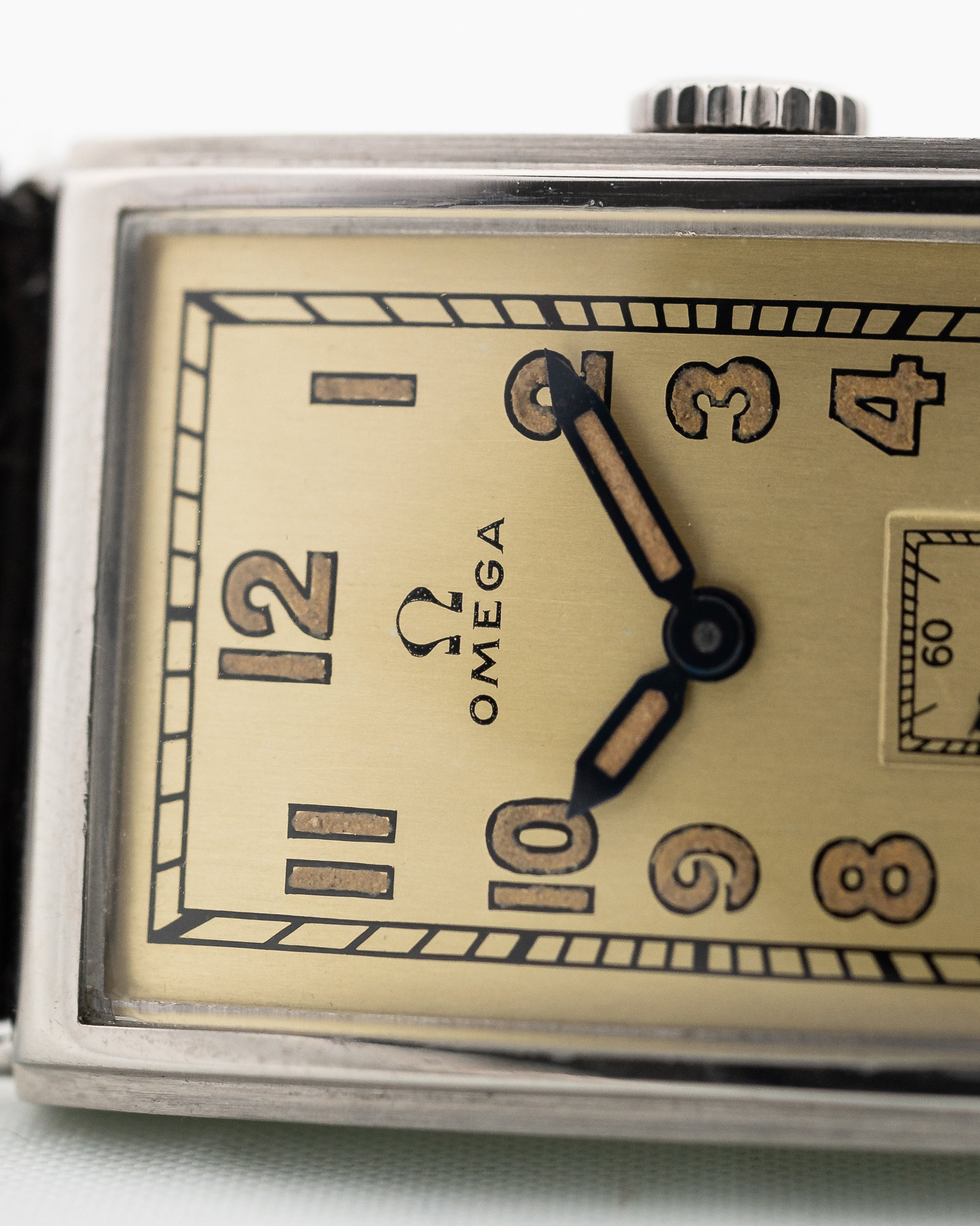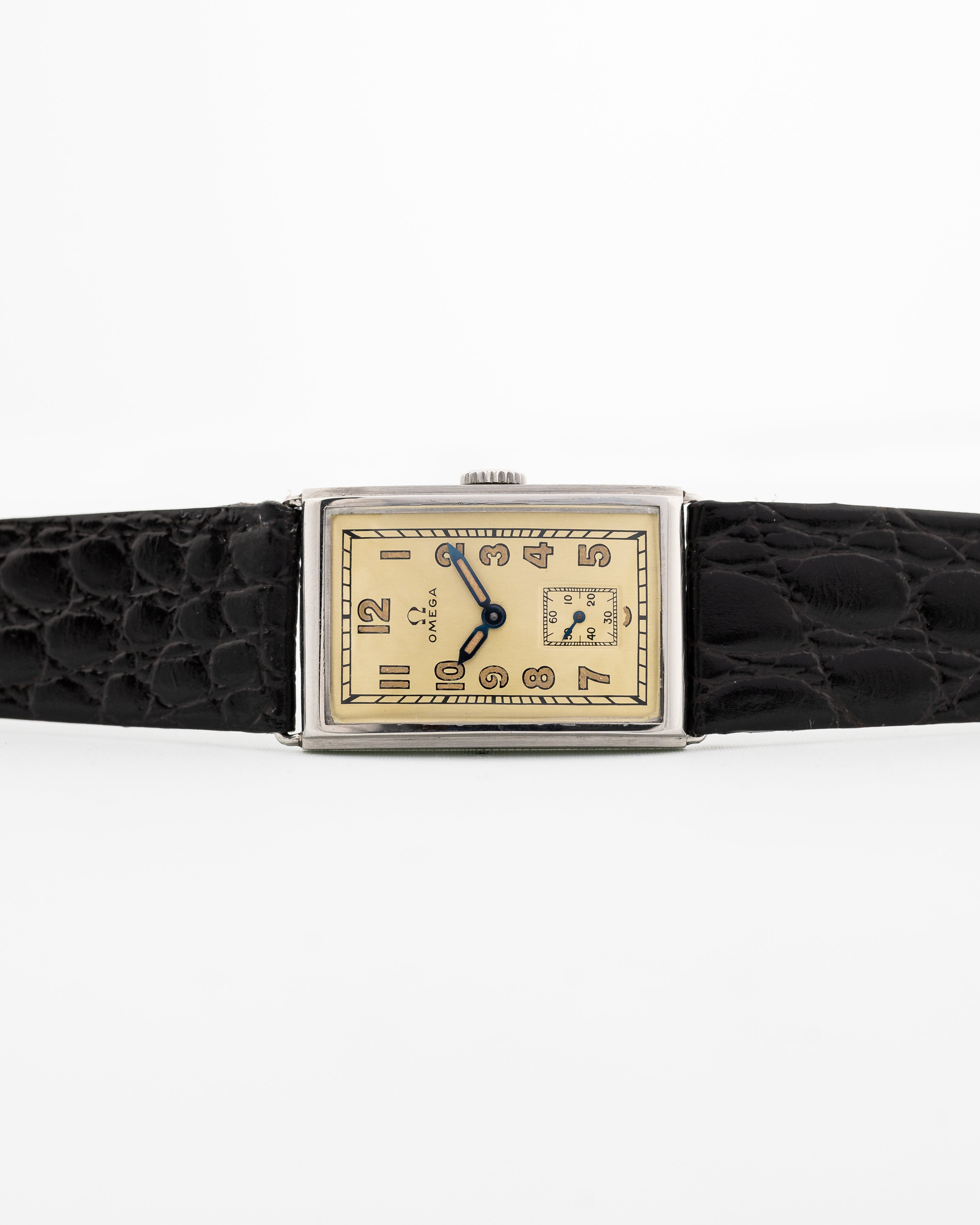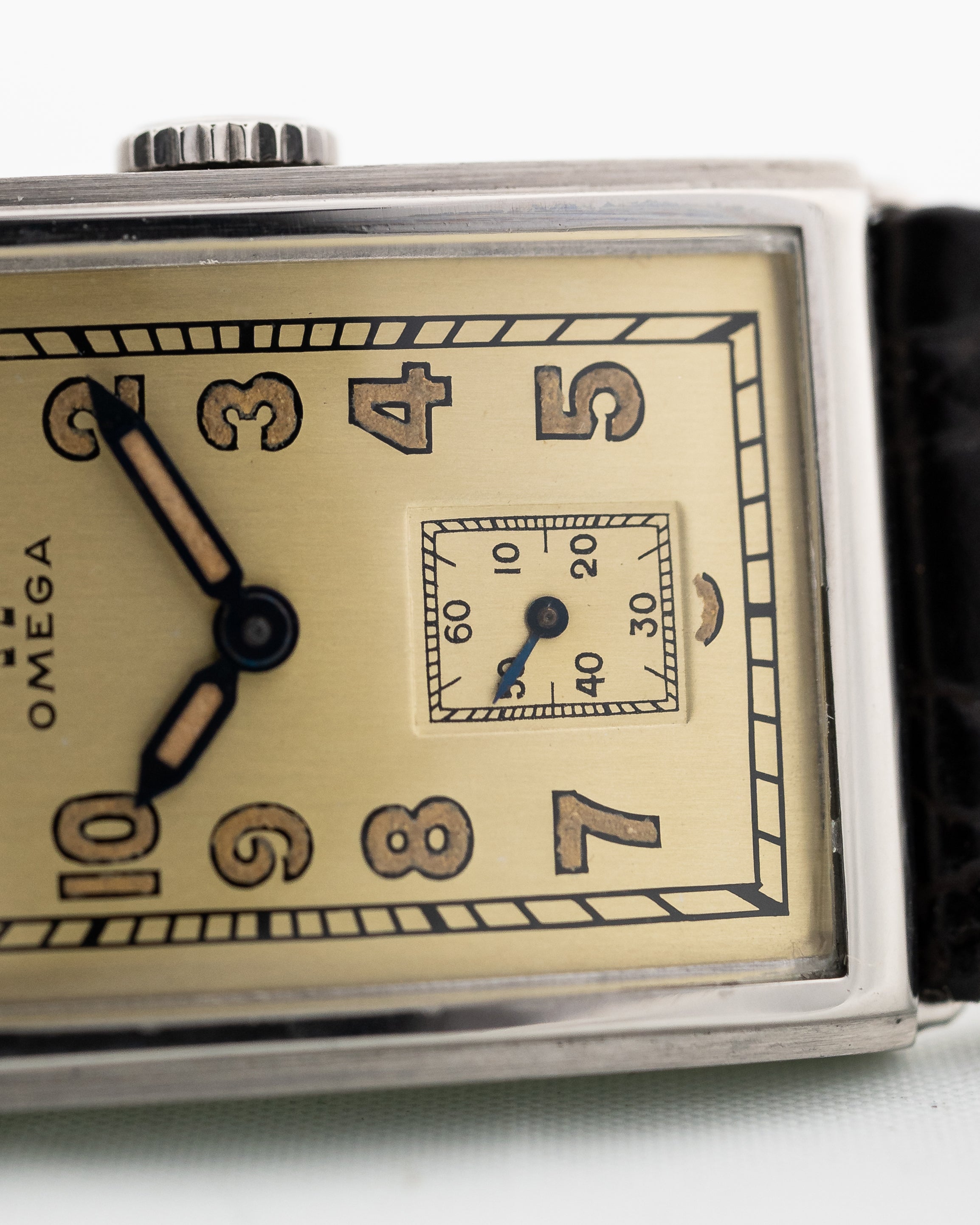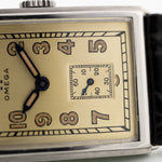 This isn't the first Omega Art Deco Dress Watch we have fallen in love with. This example features a huge rectangular steel case and is made even more attractive due to its gorgeous slightly golden colored dial with Art Deco Arabic numerals, subsidiary seconds and a wonderful unique blue handset. And the icing on the cake is the nos condition!