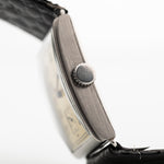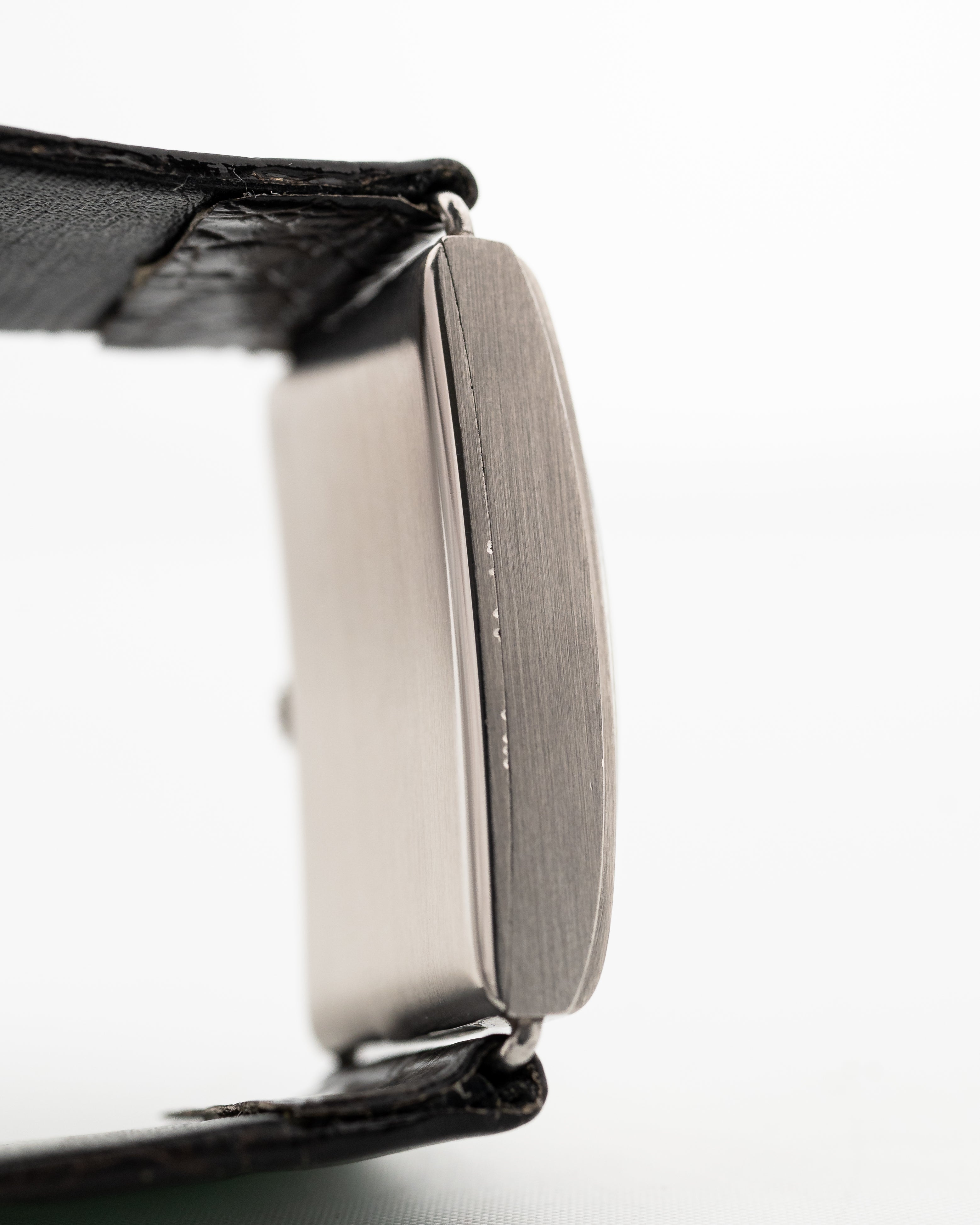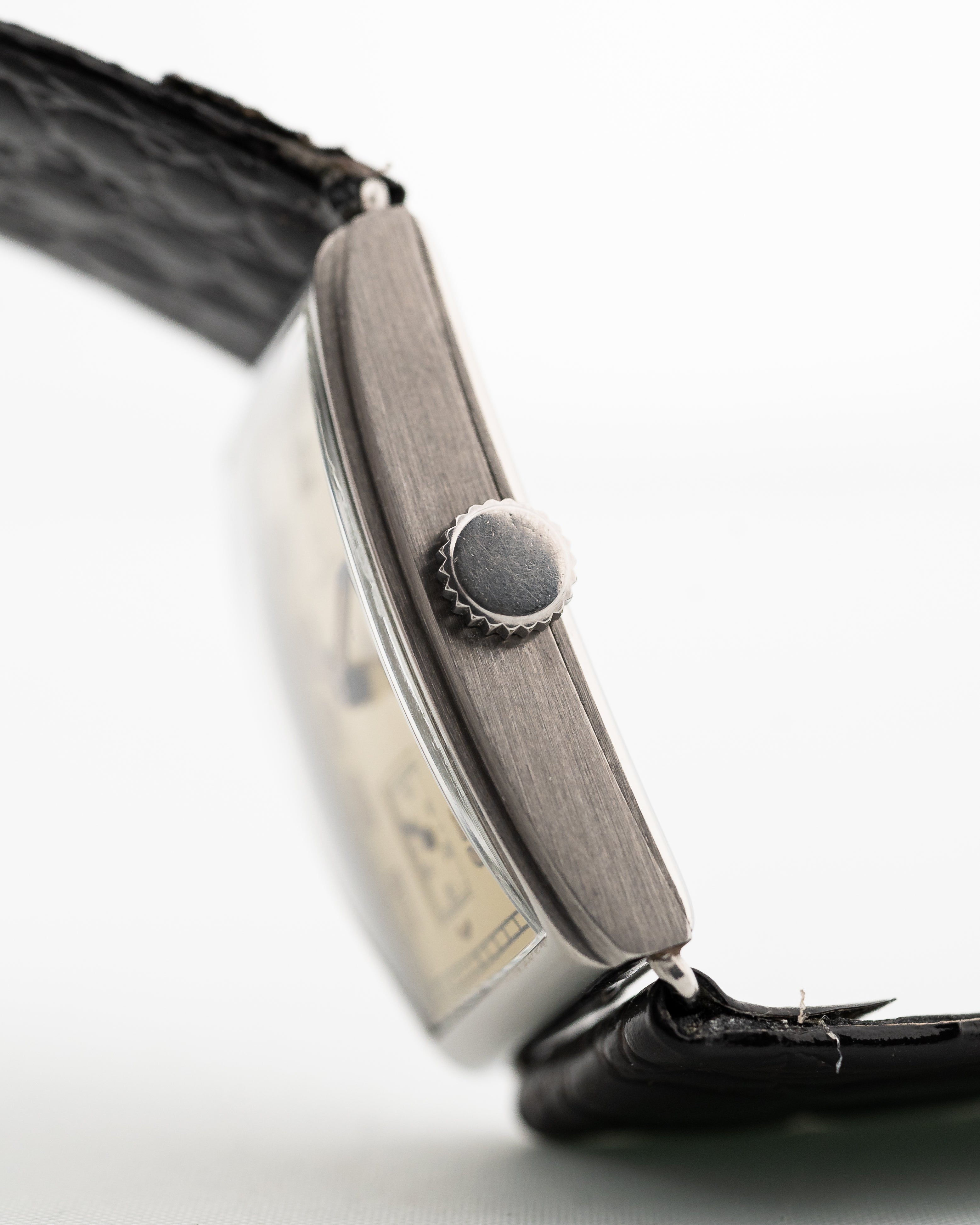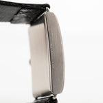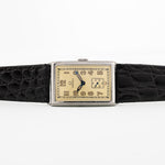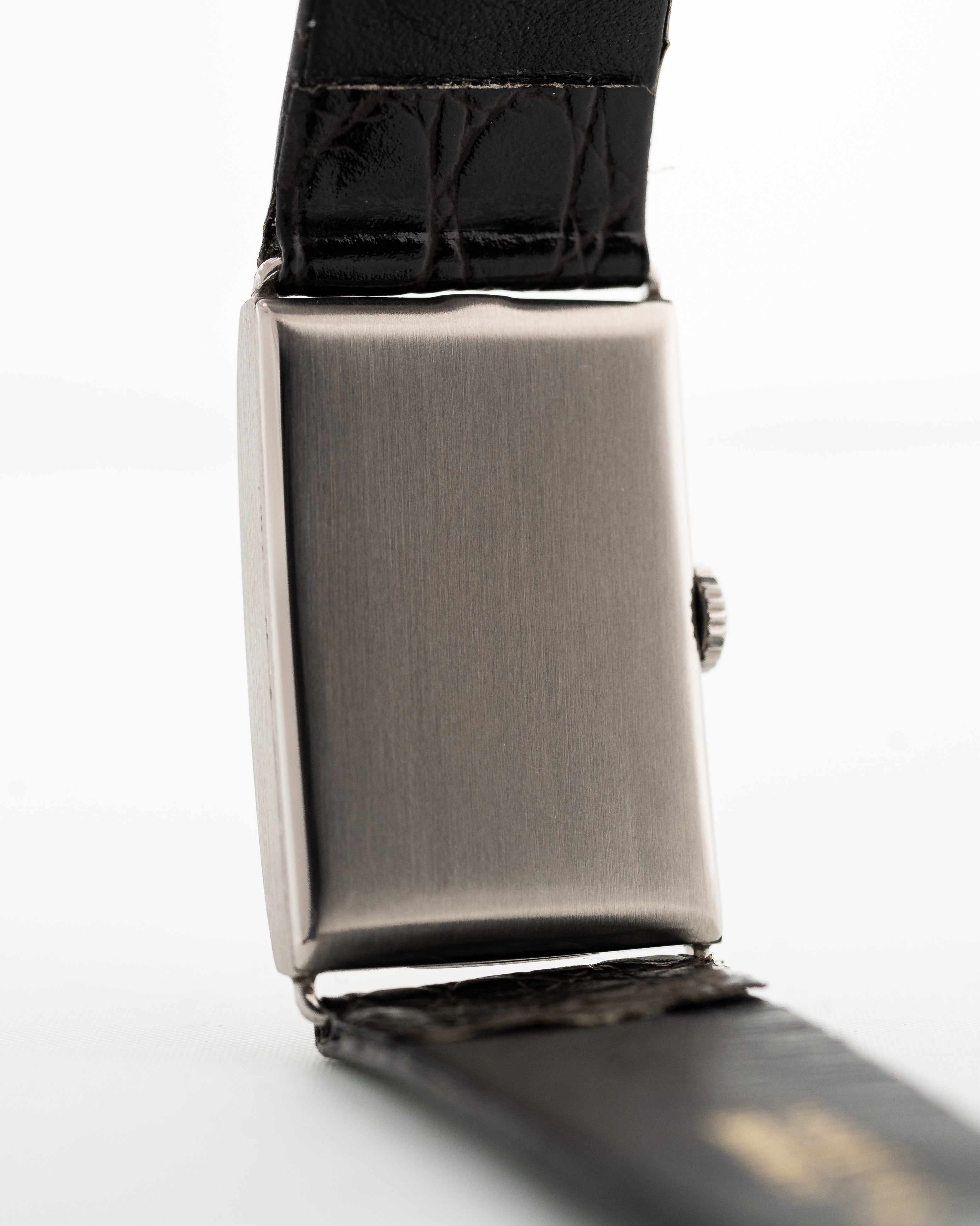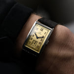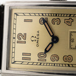 This isn't the first Omega Art Deco Dress Watch we have fallen in love with. This example features a huge rectangular steel case and is made even more attractive due to its gorgeous slightly golden colored dial with Art Deco Arabic numerals, subsidiary seconds and a wonderful unique blue handset. And the icing on the cake is the nos condition!