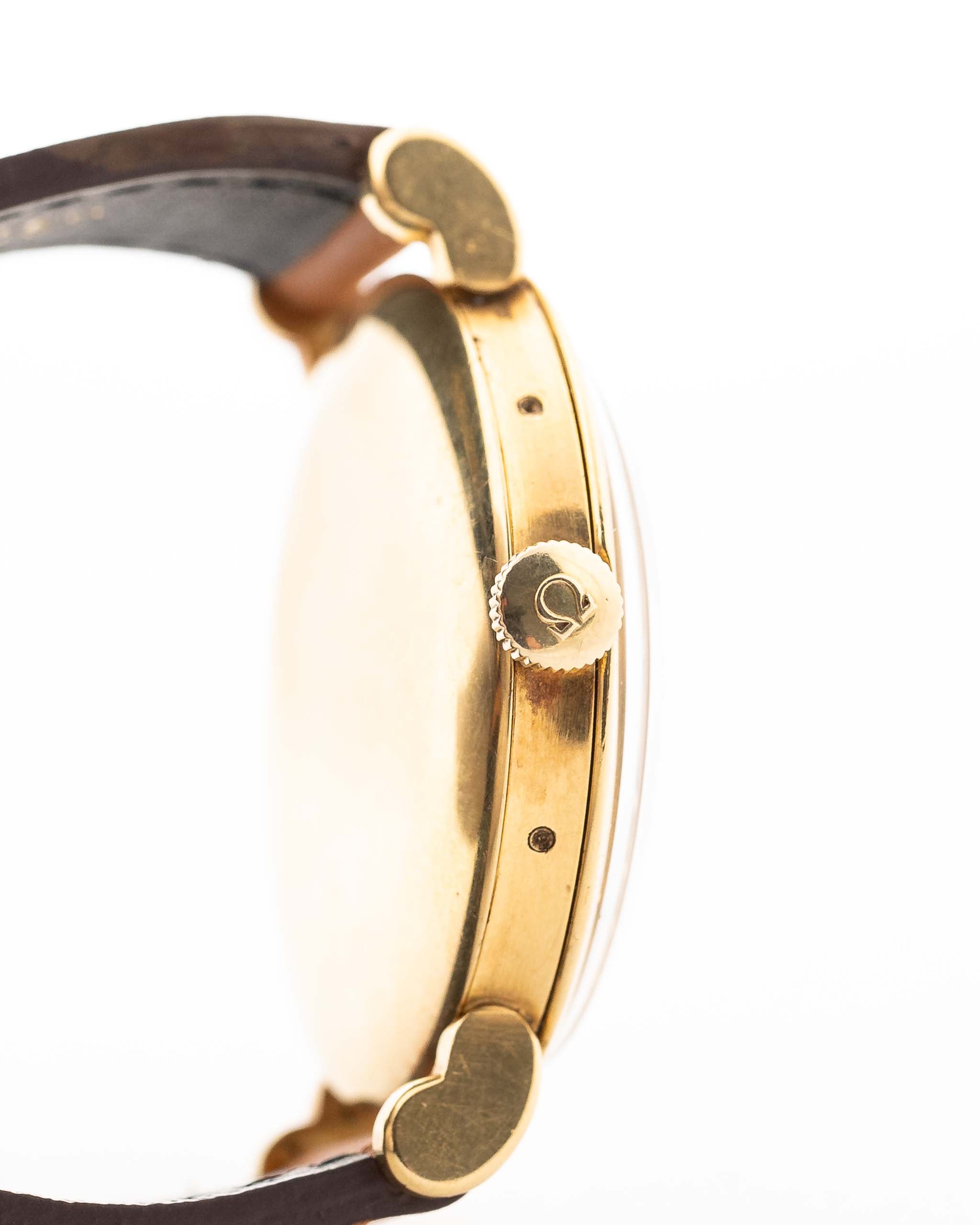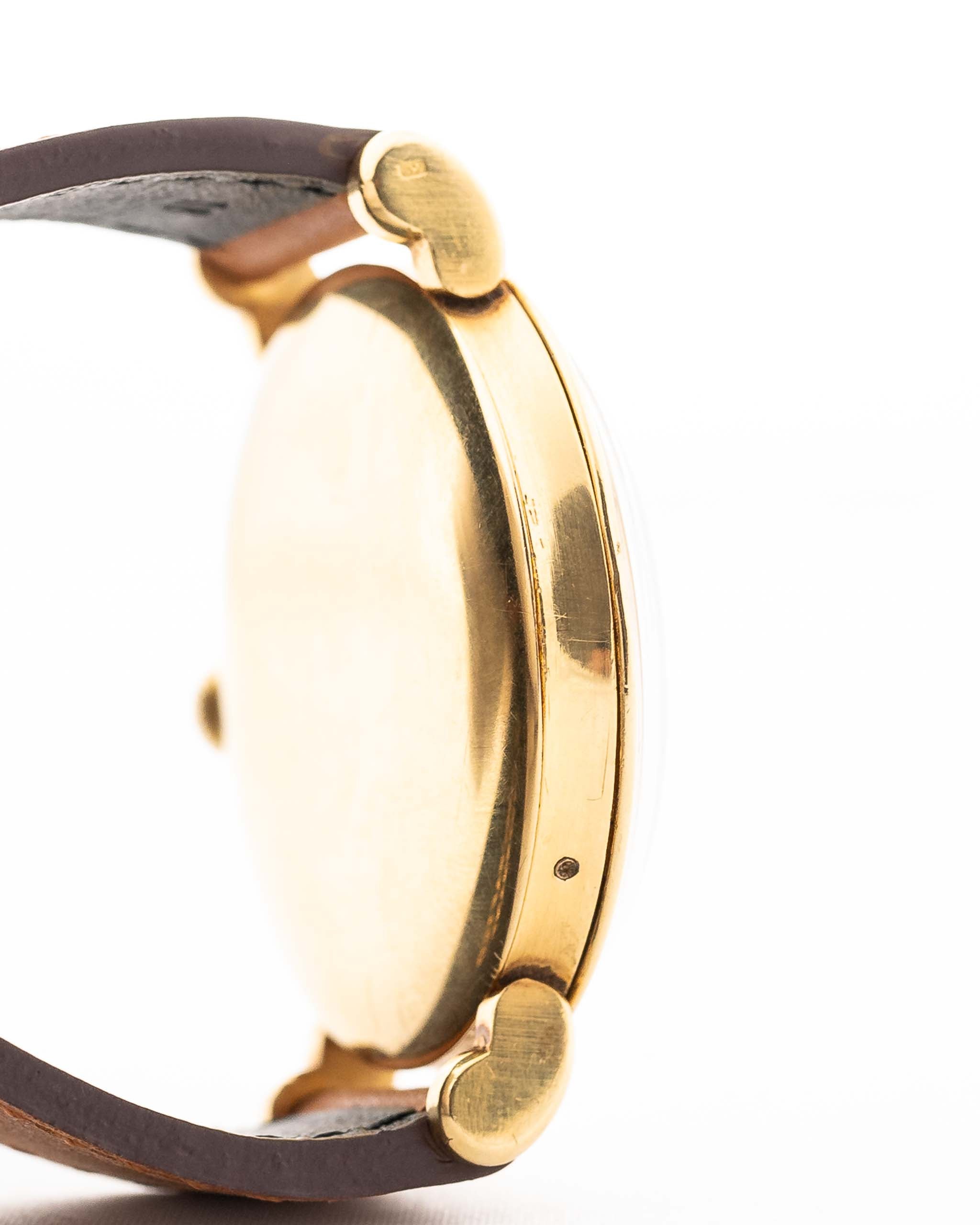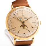 The Omega Cosmic was introduced in 1947 as the most prestigious model in Omega’s post-war catalogue — and this early Reference 2485 shows exactly why. Housed in a rare 37 mm 18k yellow gold case, it features a complete calendar with moonphase complication, powered by the revered Caliber 381, based on a Lemania ébauche.