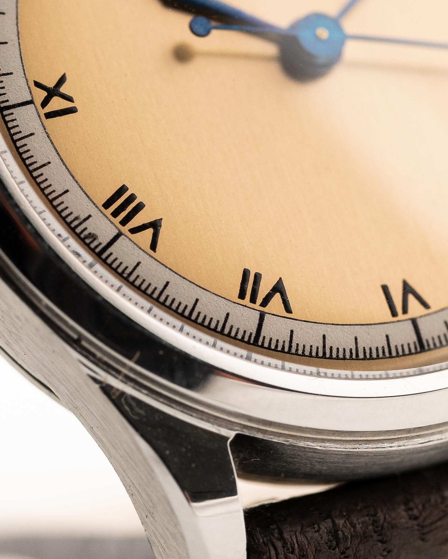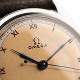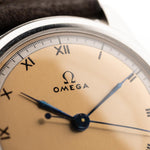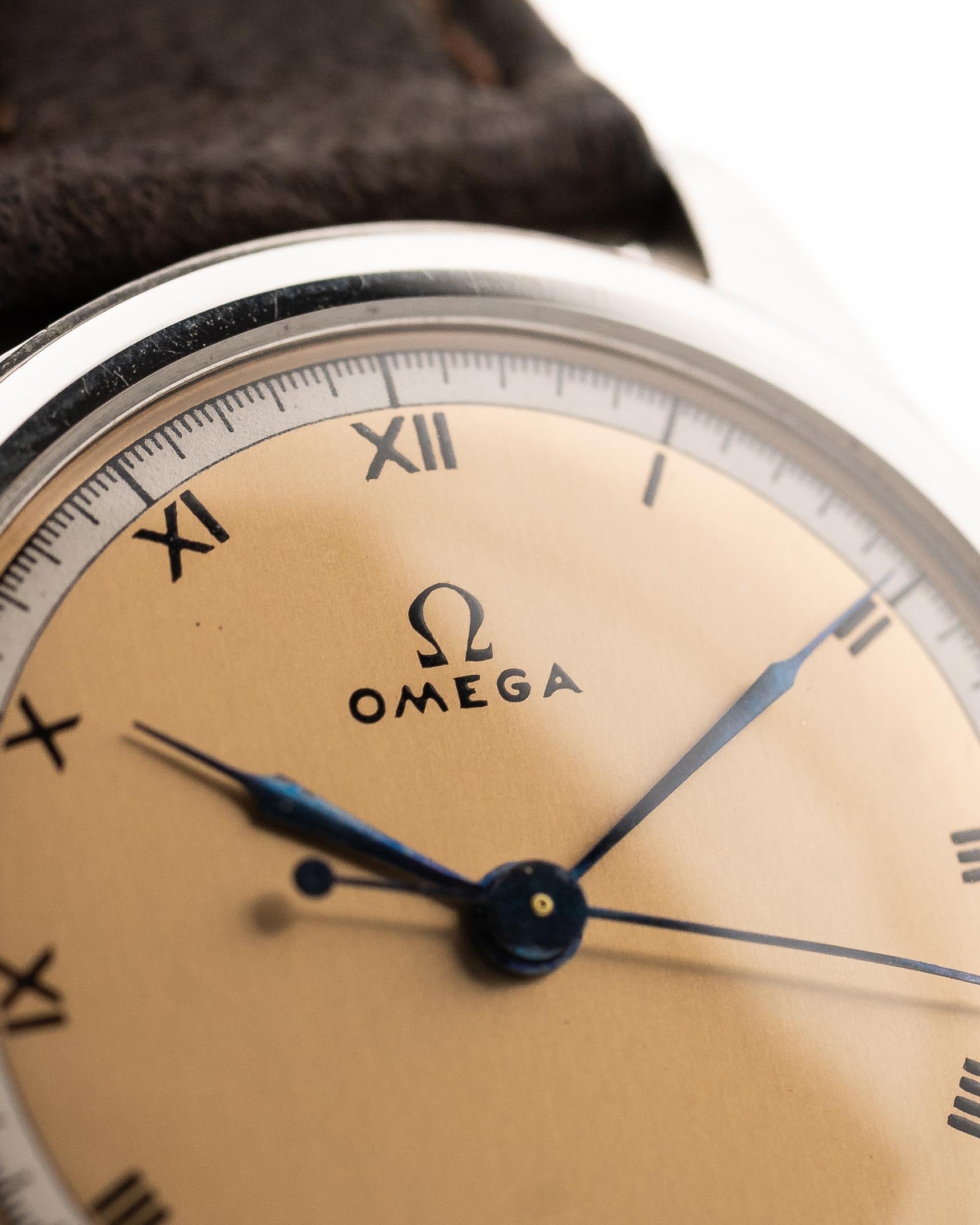 Finding an Omega from the 40s in great condition is difficult, but to find one with a beautiful two tone dial with roman numerals and blued steel syringe hands is nearly impossible.
