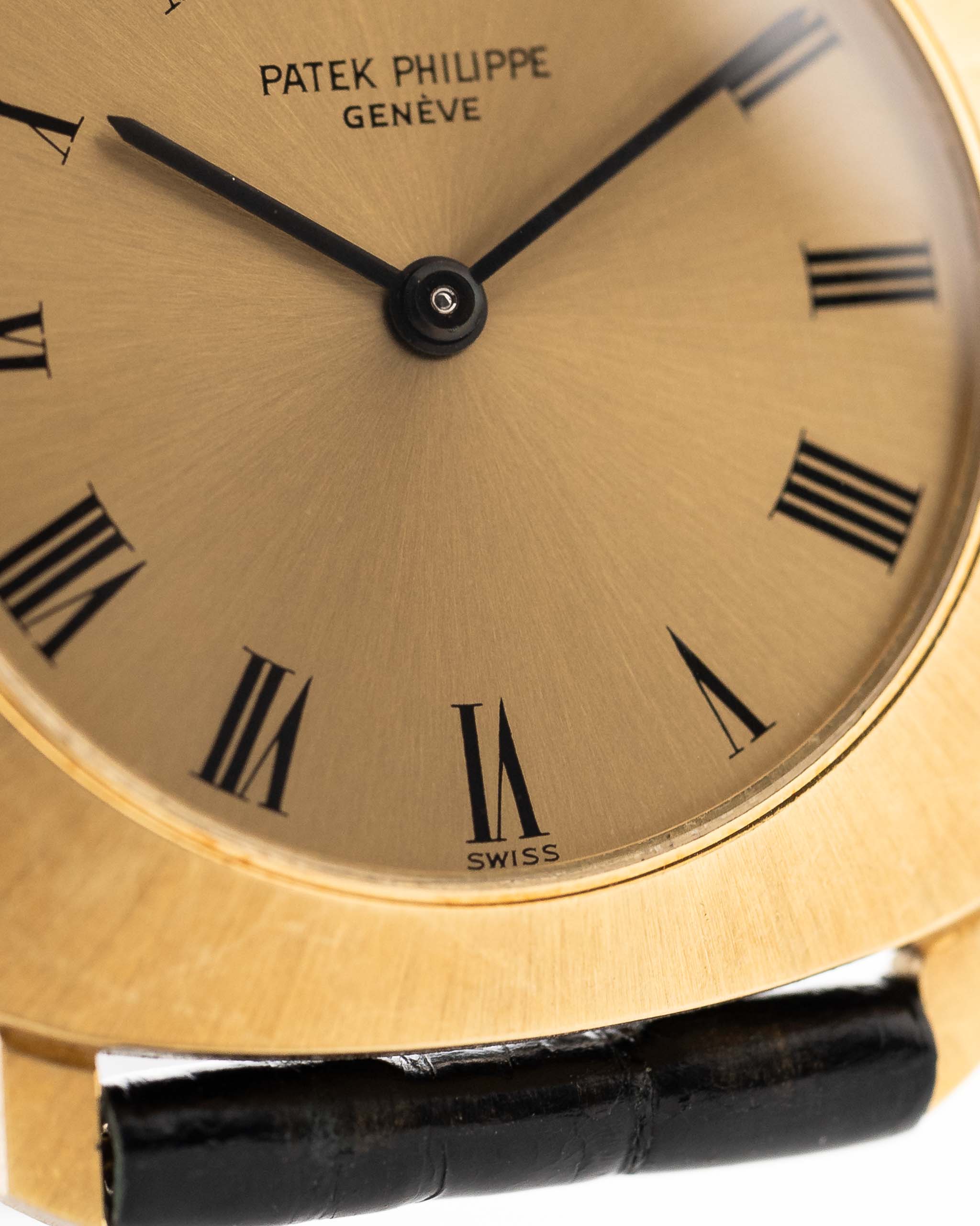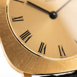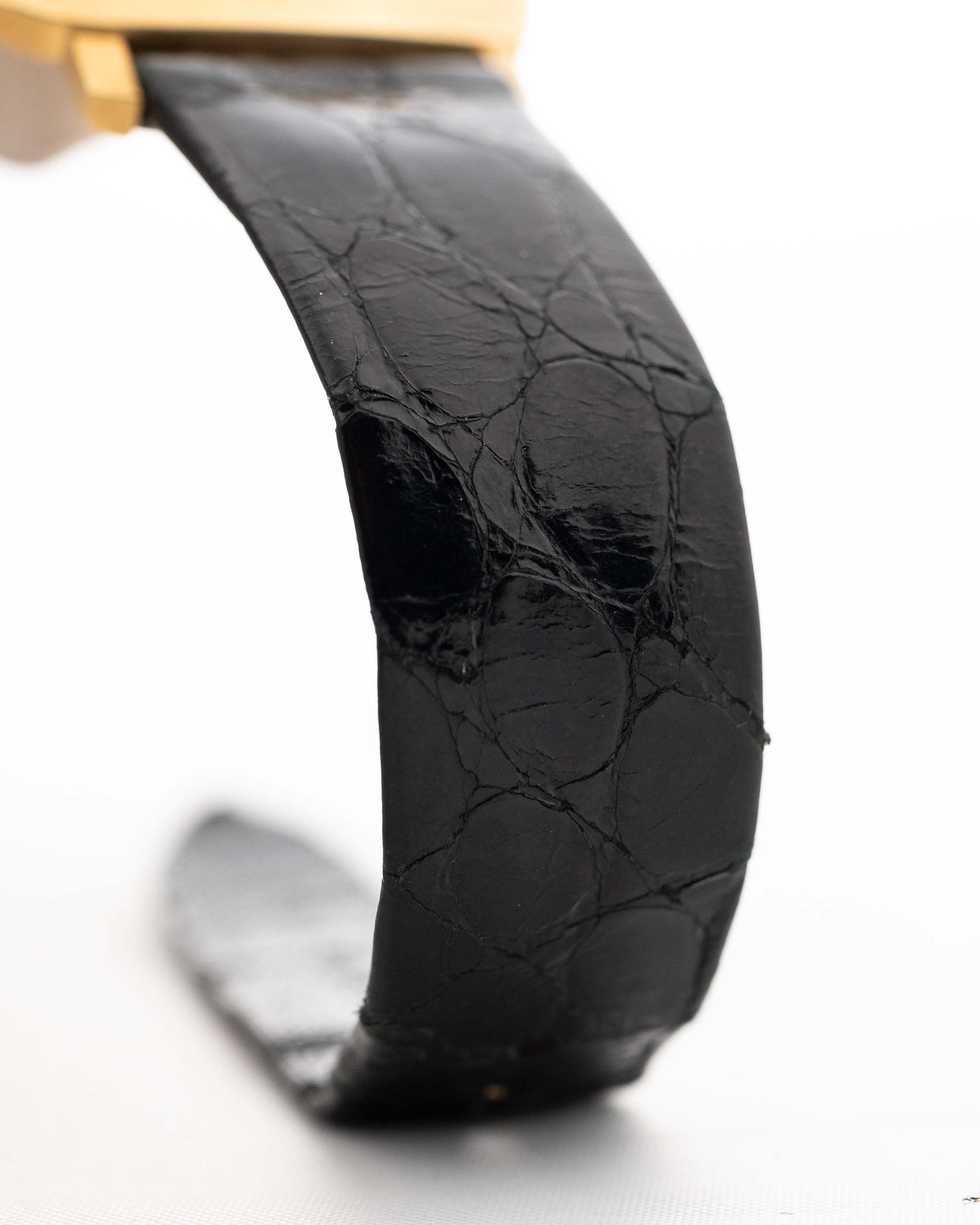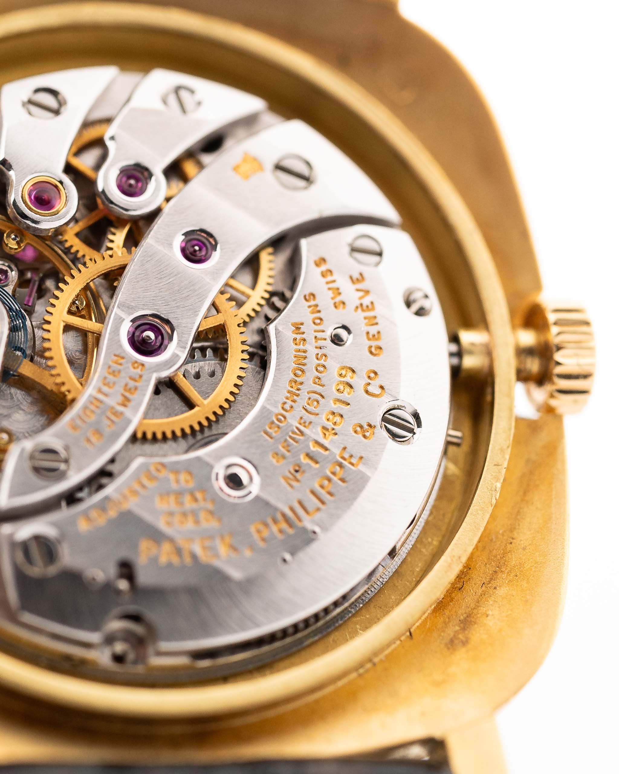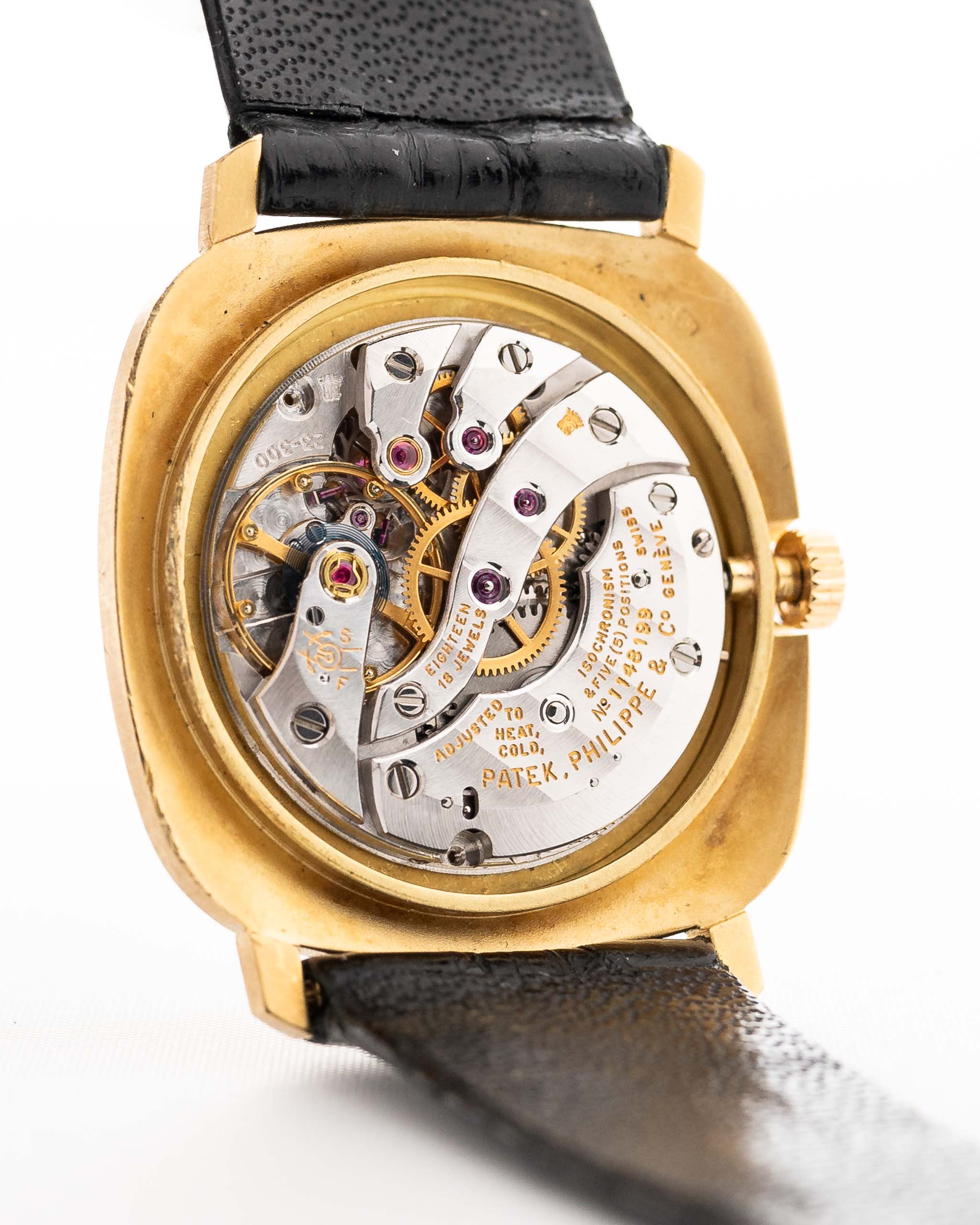 Here we have an excellent representation of Patek Philippes's dress watches, this ref. 3543 hit all the high notes with an 18k yellow gold square shaped case, short lugs, an elegant golden sunburst dial with roman hour markers and stick handset.