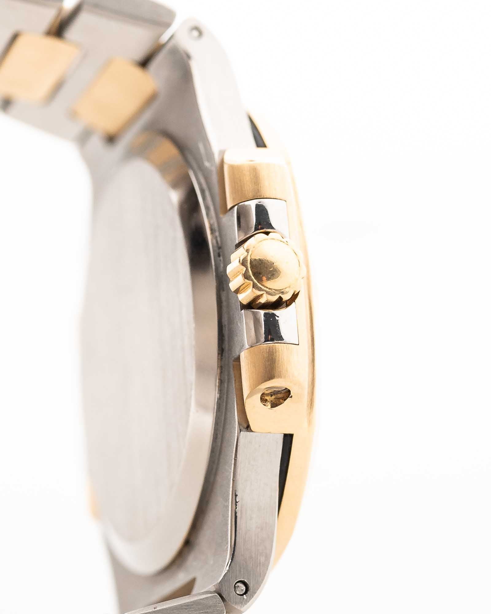 The ribbed golden sigma dial is flawless, framed by the signature rounded octagonal bezel and complemented by an integrated two-tone bracelet for exceptional comfort. Inside ticks the ultra-thin automatic Caliber 330 SC, combining precision with a slim profile.