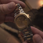 This Patek Philippe Nautilus Ref. 3800/1JA represents the perfectly balanced mid-size evolution of Gérald Genta’s iconic design. Crafted in a rare two-tone combination of stainless steel and 18k yellow gold, the 37.5 mm case delivers sportiness with unmistakable elegance.