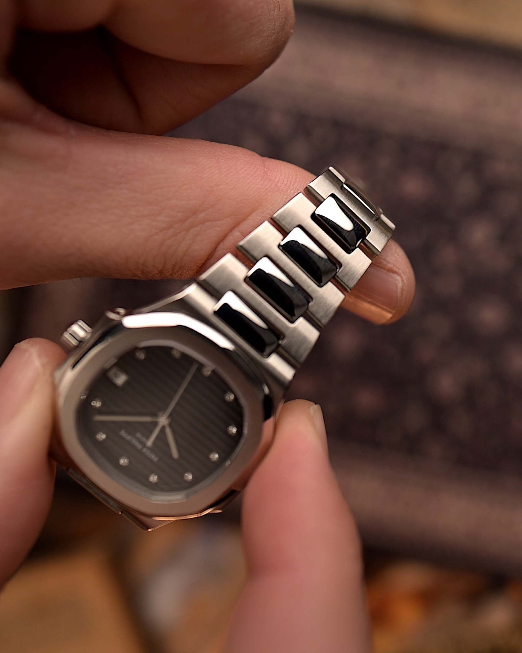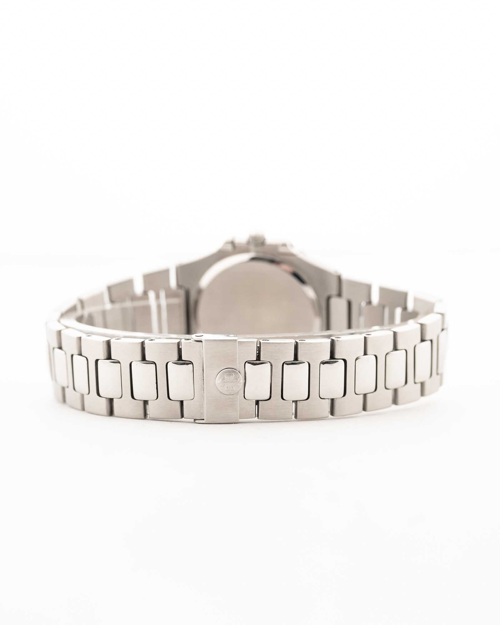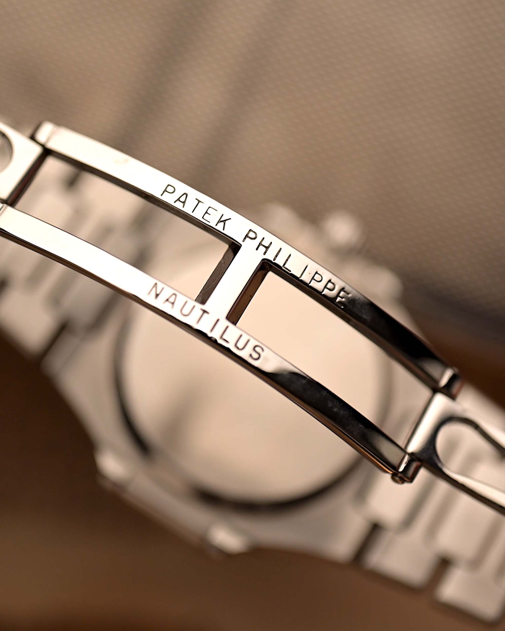 This example comes in fantastic condition, retaining all the crisp lines of the original case and bracelet. It got an upgrade to a diamond index dial in the past, since it was born with the regular Nautilus dial.