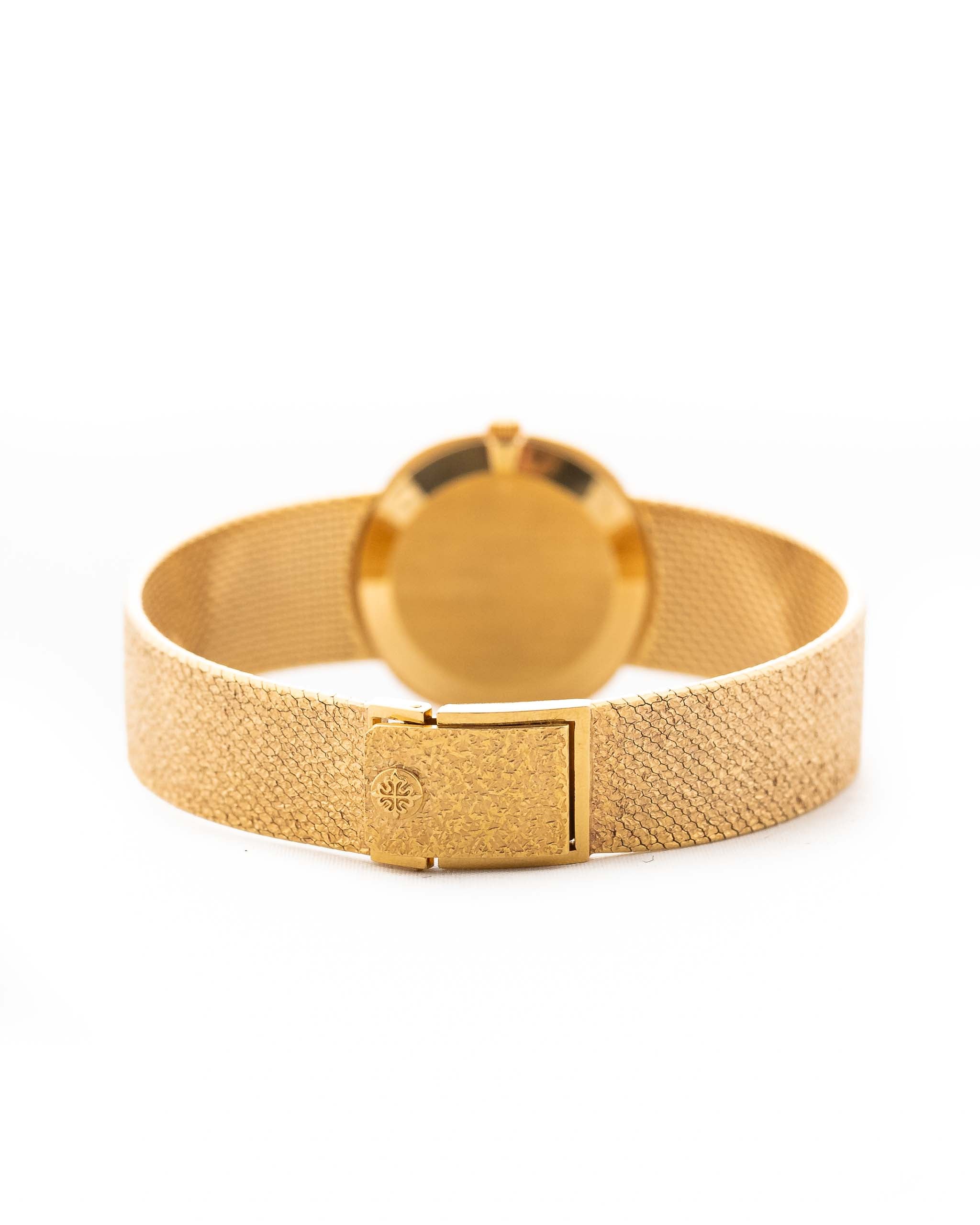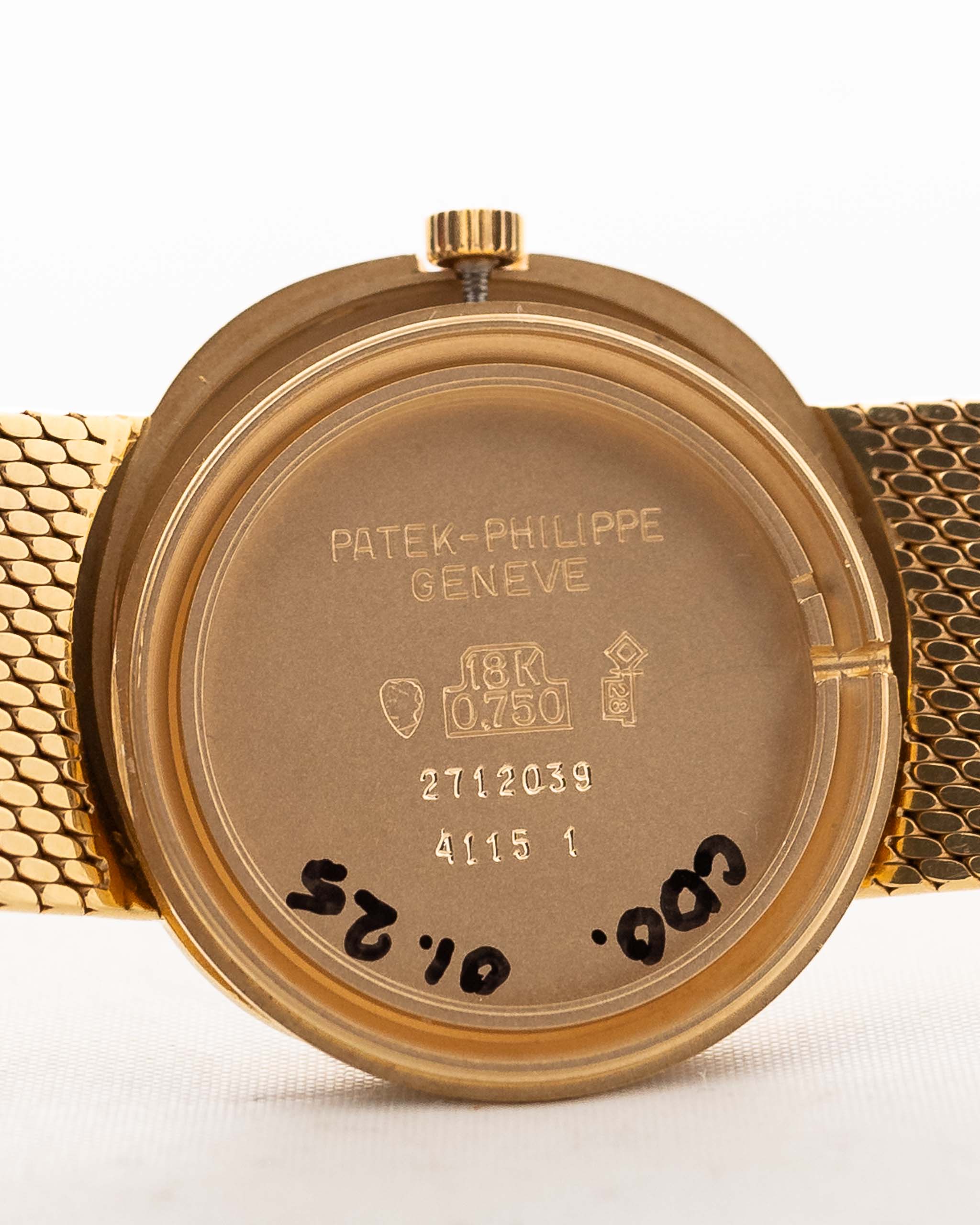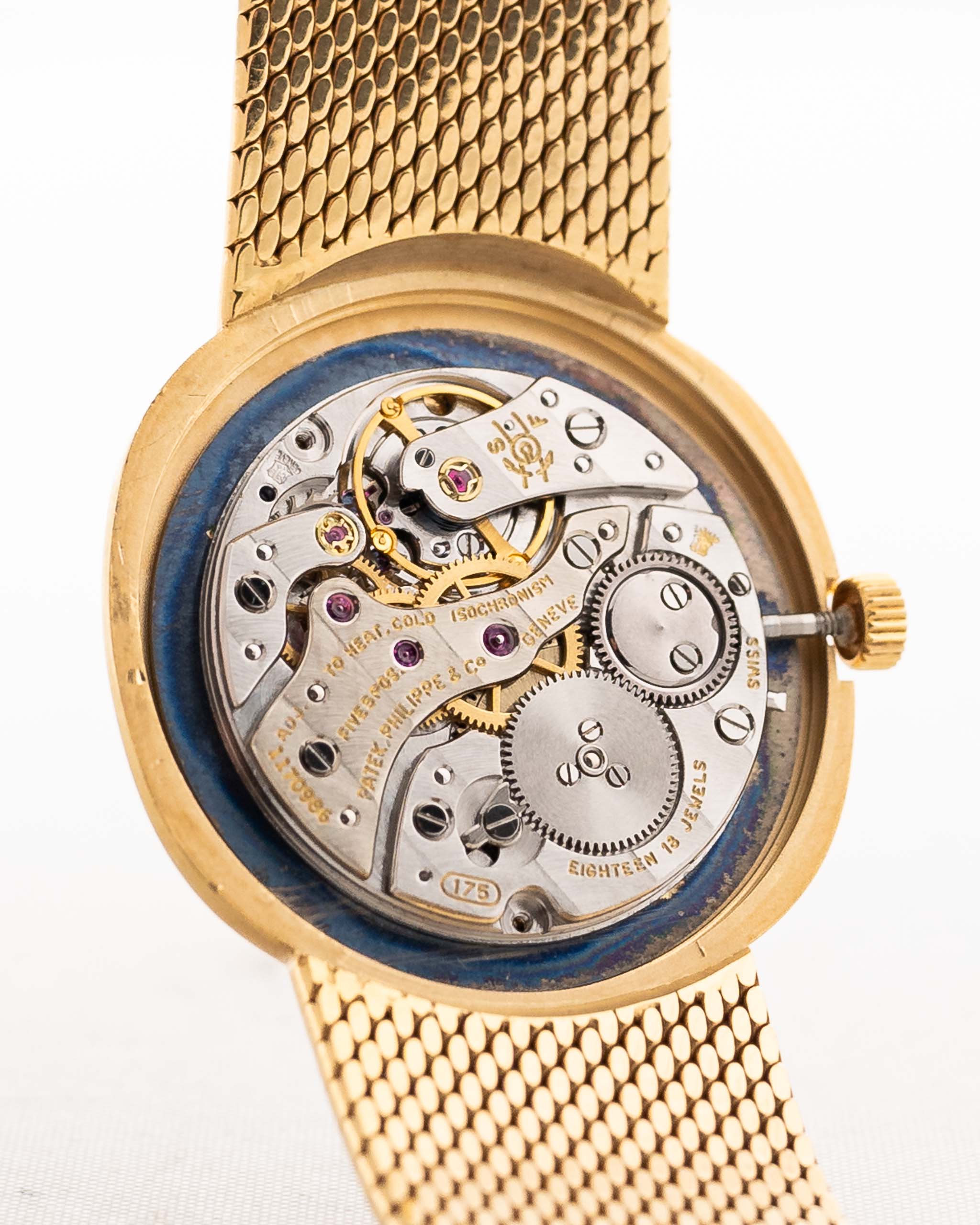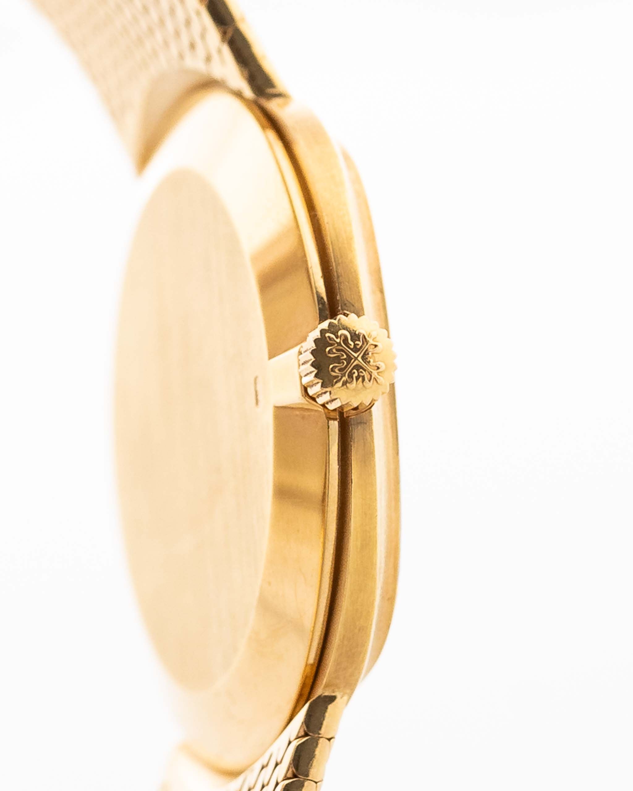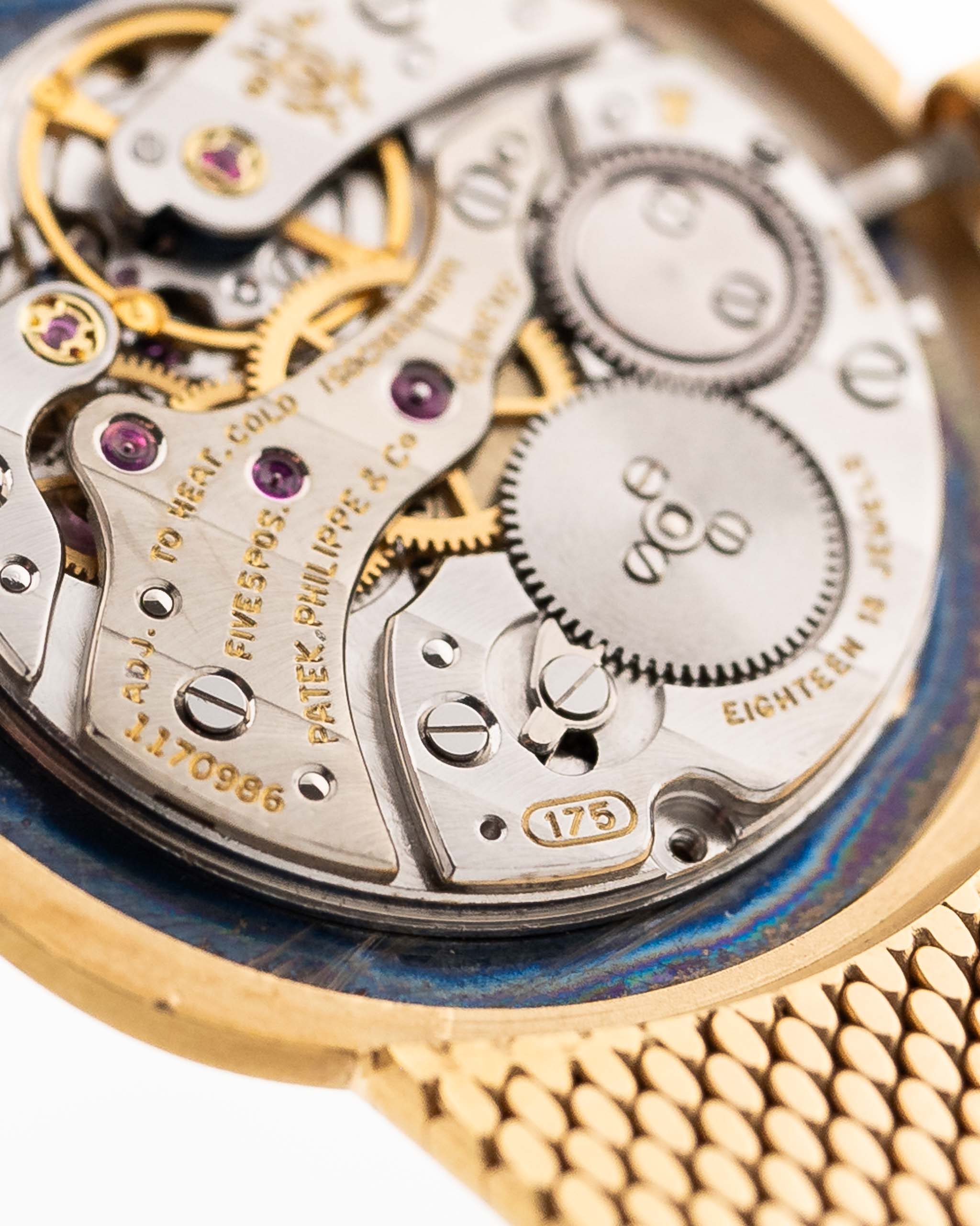 The icing on the cake, on this particular Patek Philippe is the integrated bracelet forged from 18k yellow gold in a very unique structure. Inside we find the reliable Patek Philippe manual wound caliber 175.