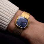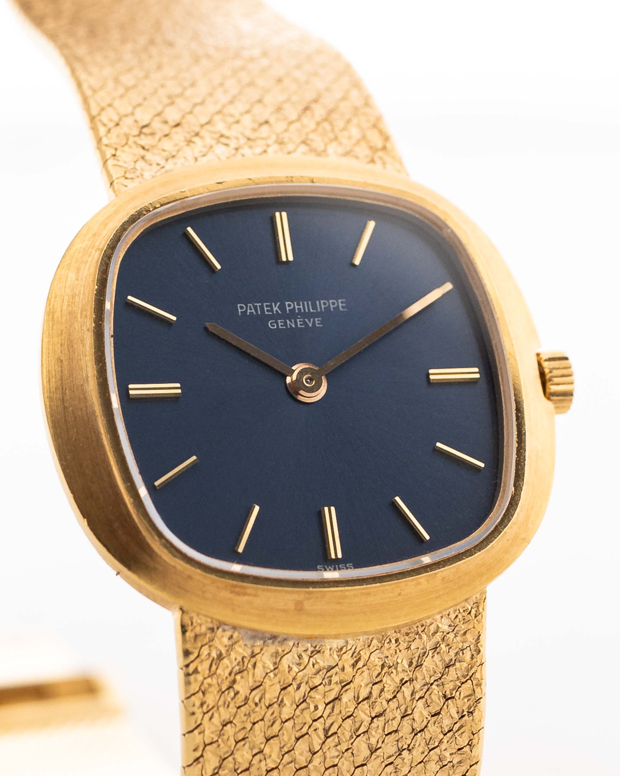 Here we have an excellent representation of Patek Philippes's dress watches, this ref. 4115 hit all the high notes with an 18k yellow gold square shaped case and elegant deep blue dial with stick hour markers and hands.
