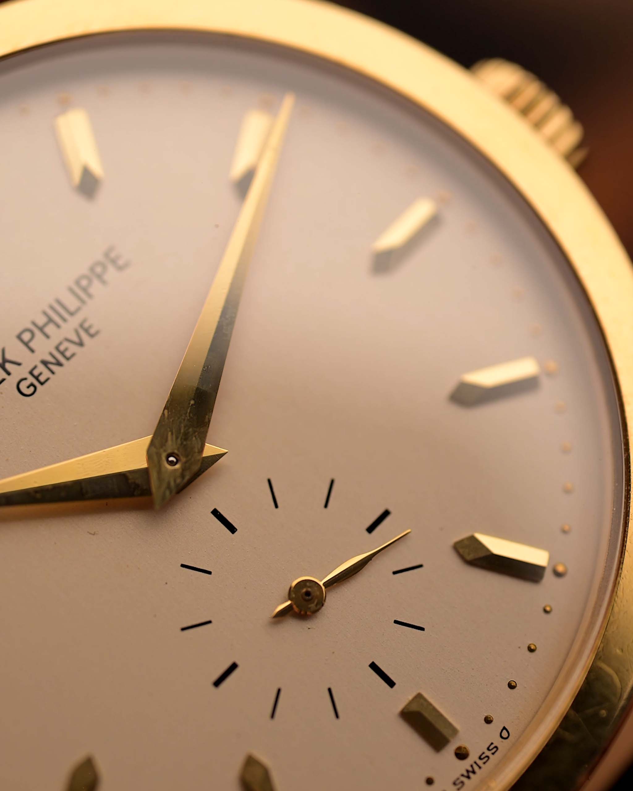 Housed in a 33 mm 18k yellow gold case with gently downturned lugs, this Calatrava radiates understated sophistication. The silver dial—untouched and immaculate—features a small seconds at six and classic dauphine hands, perfectly harmonizing with the minimalist aesthetic.