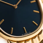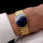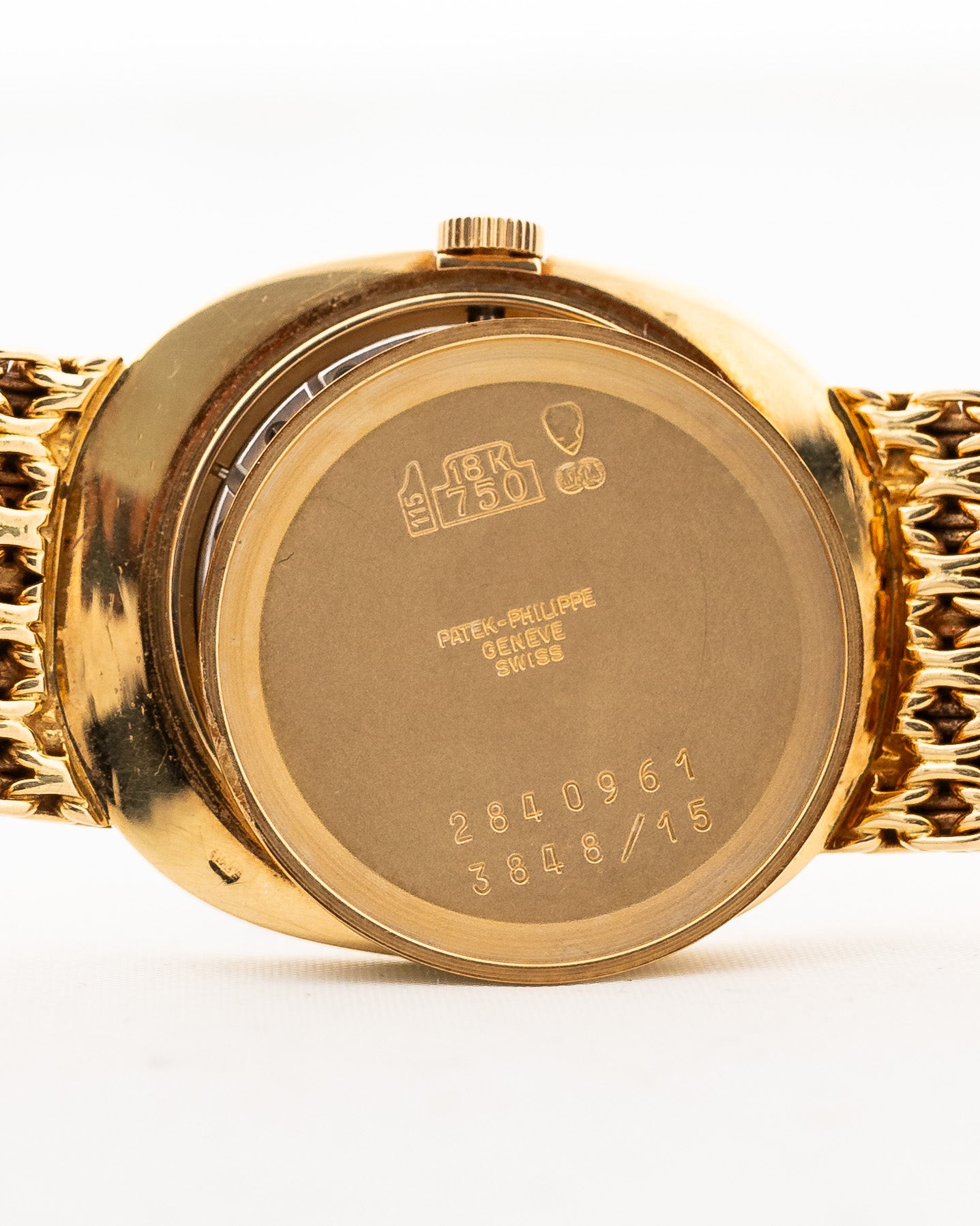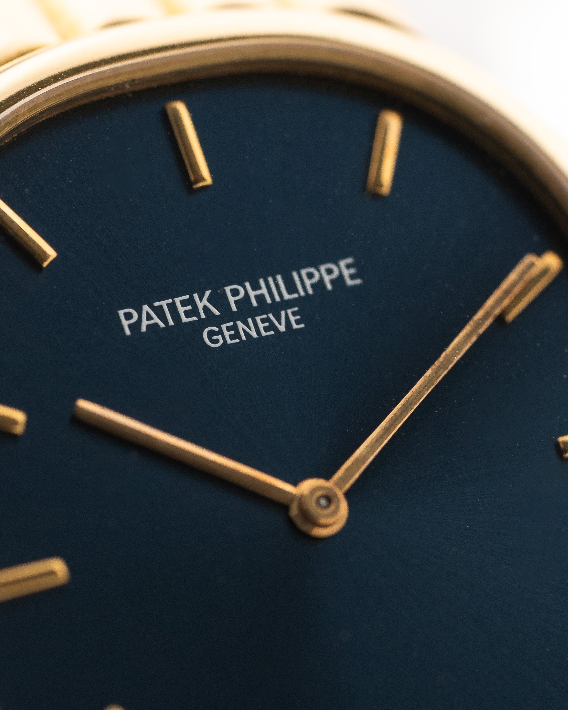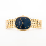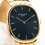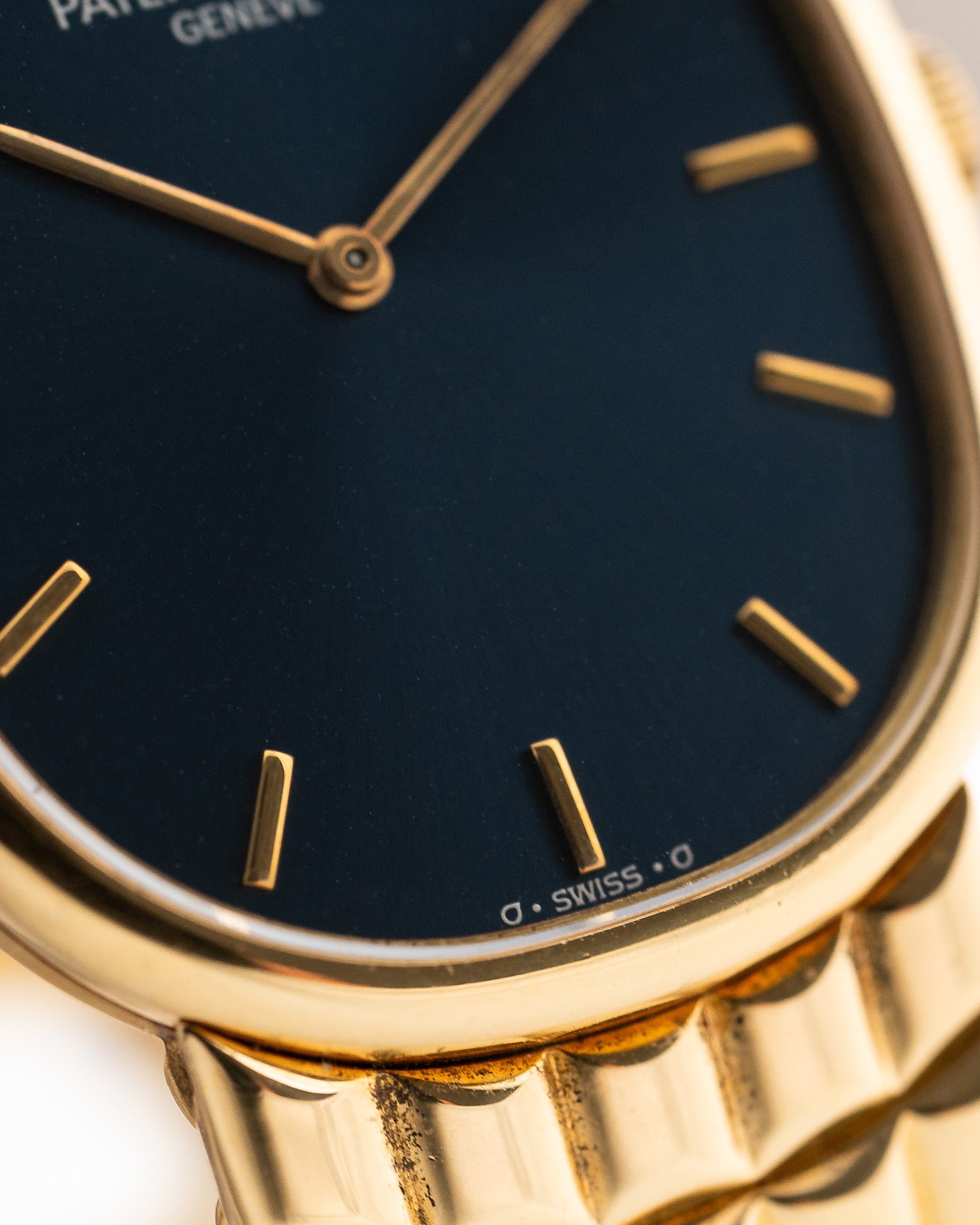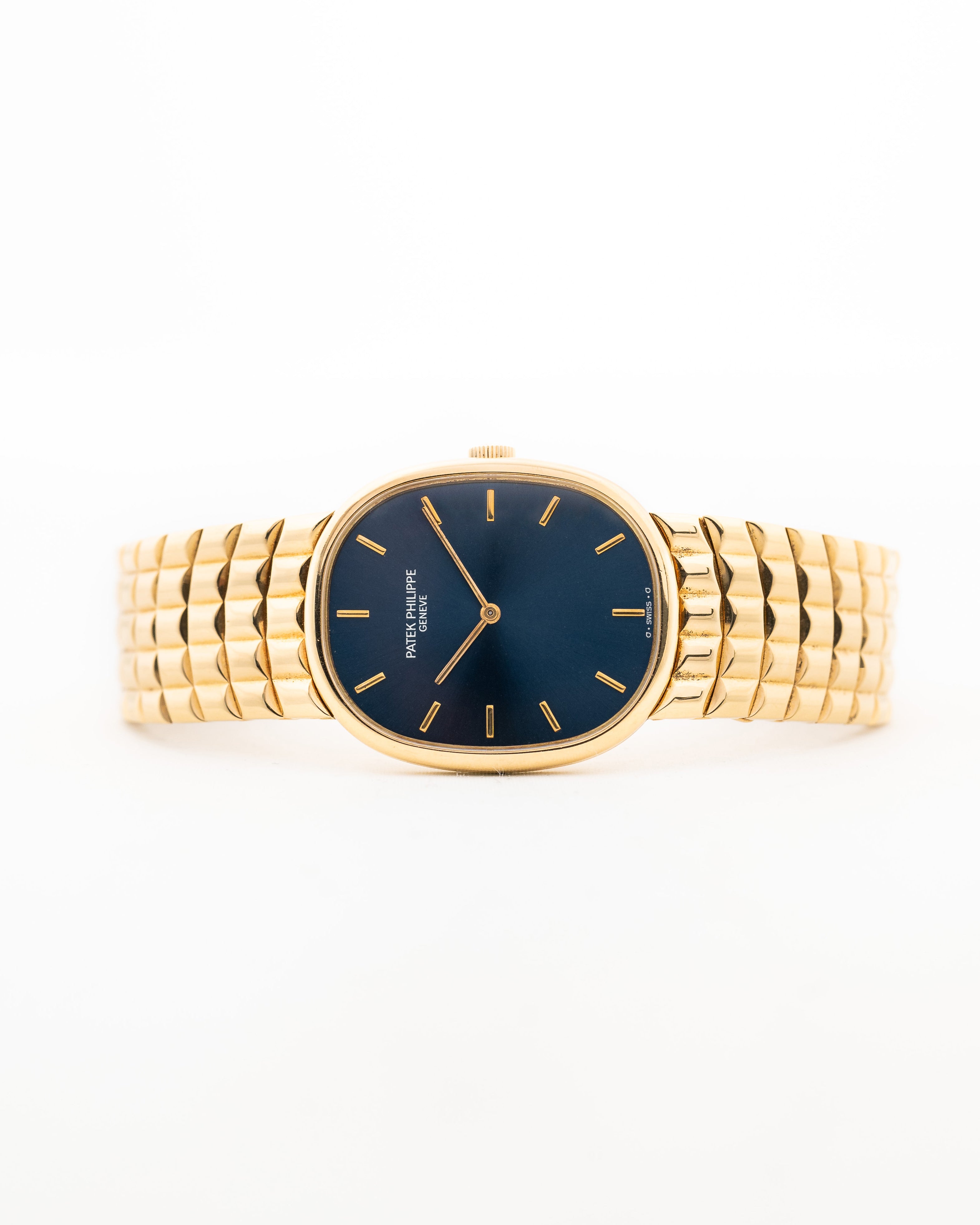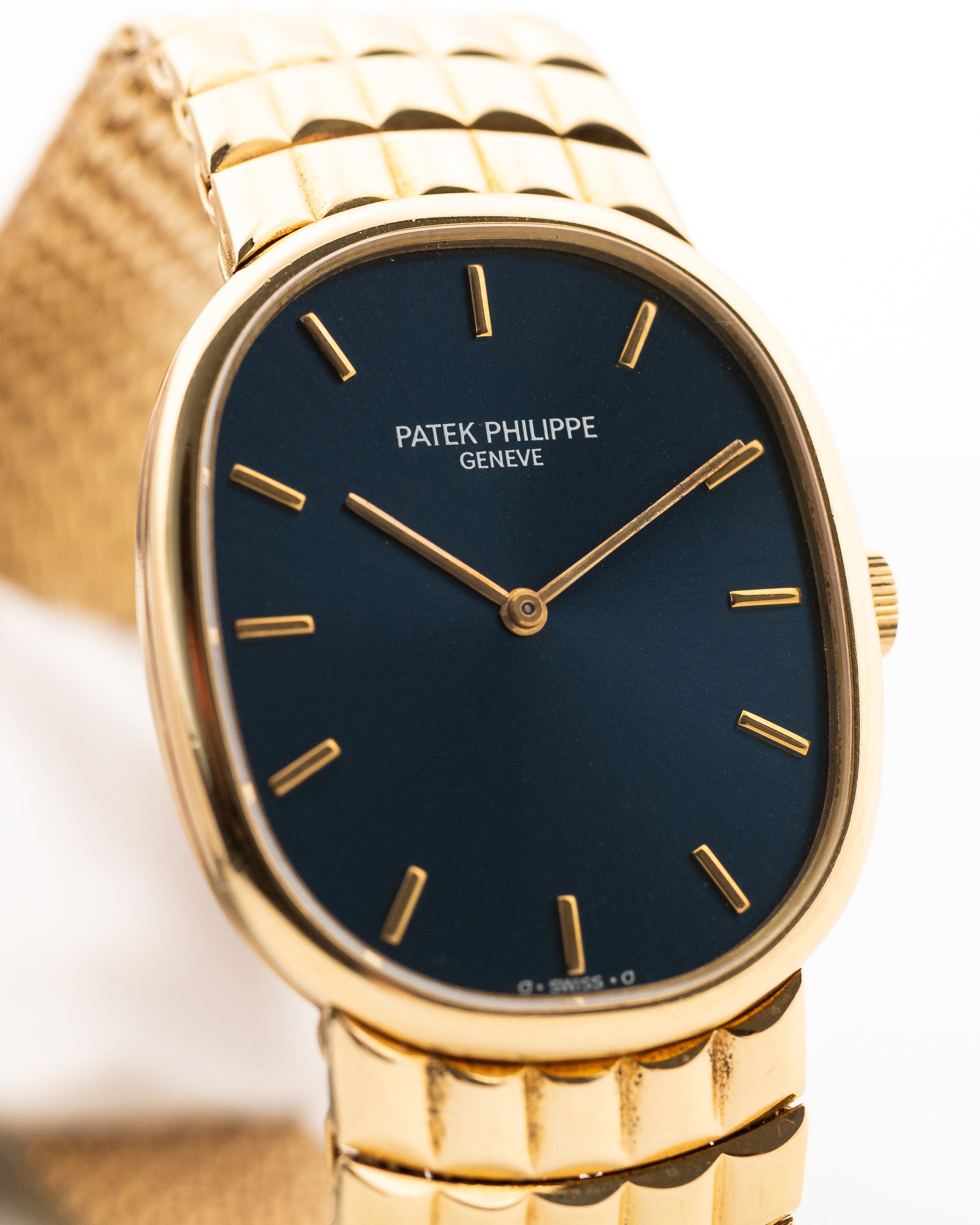 Here we have an excellent representation of Patek Philippes Ellipse dress watches, this ref. 3848 / 15 hit all the high notes with an 18k yellow gold case with a very rare integrated yellow gold bracelet, and a wonderful blue Sigma dial in flawless condition.