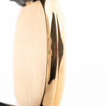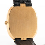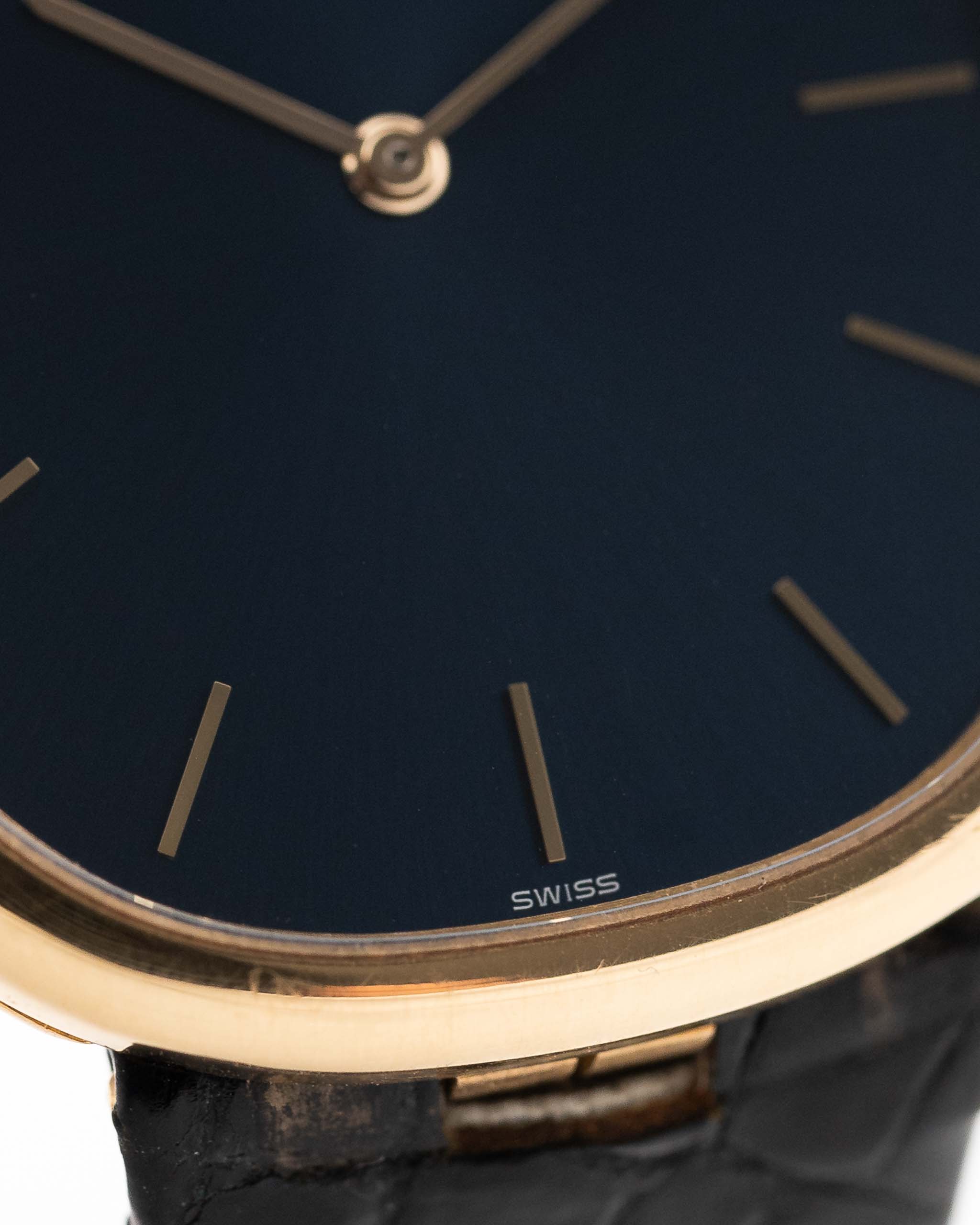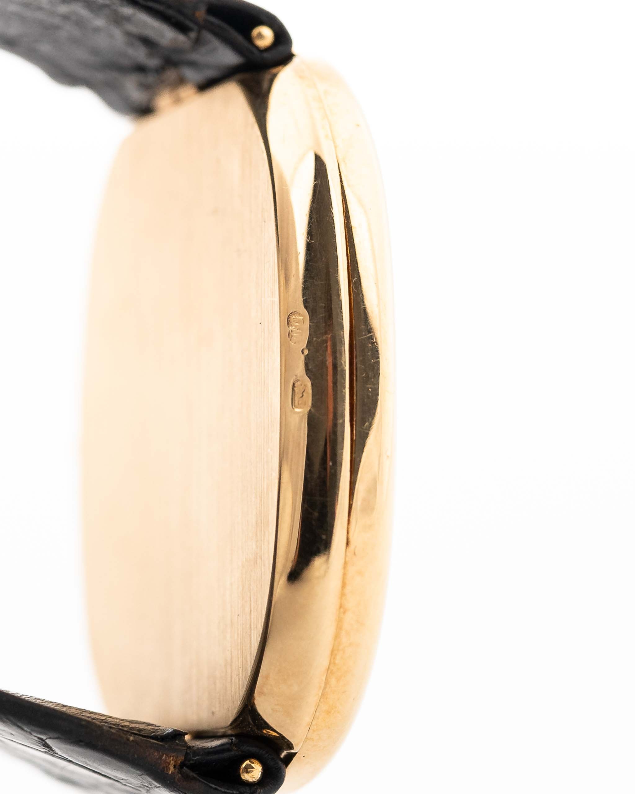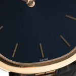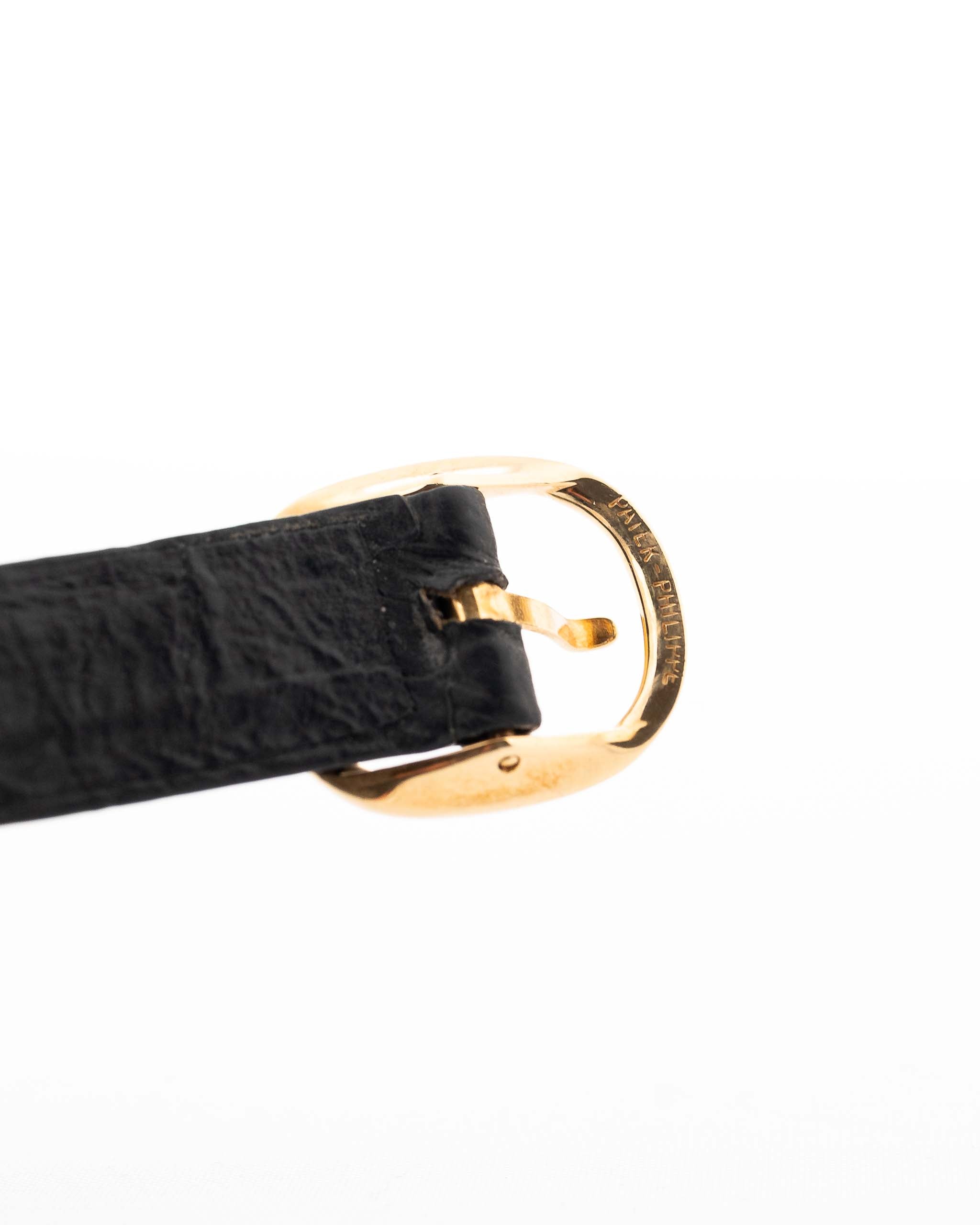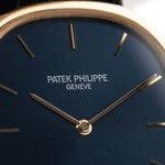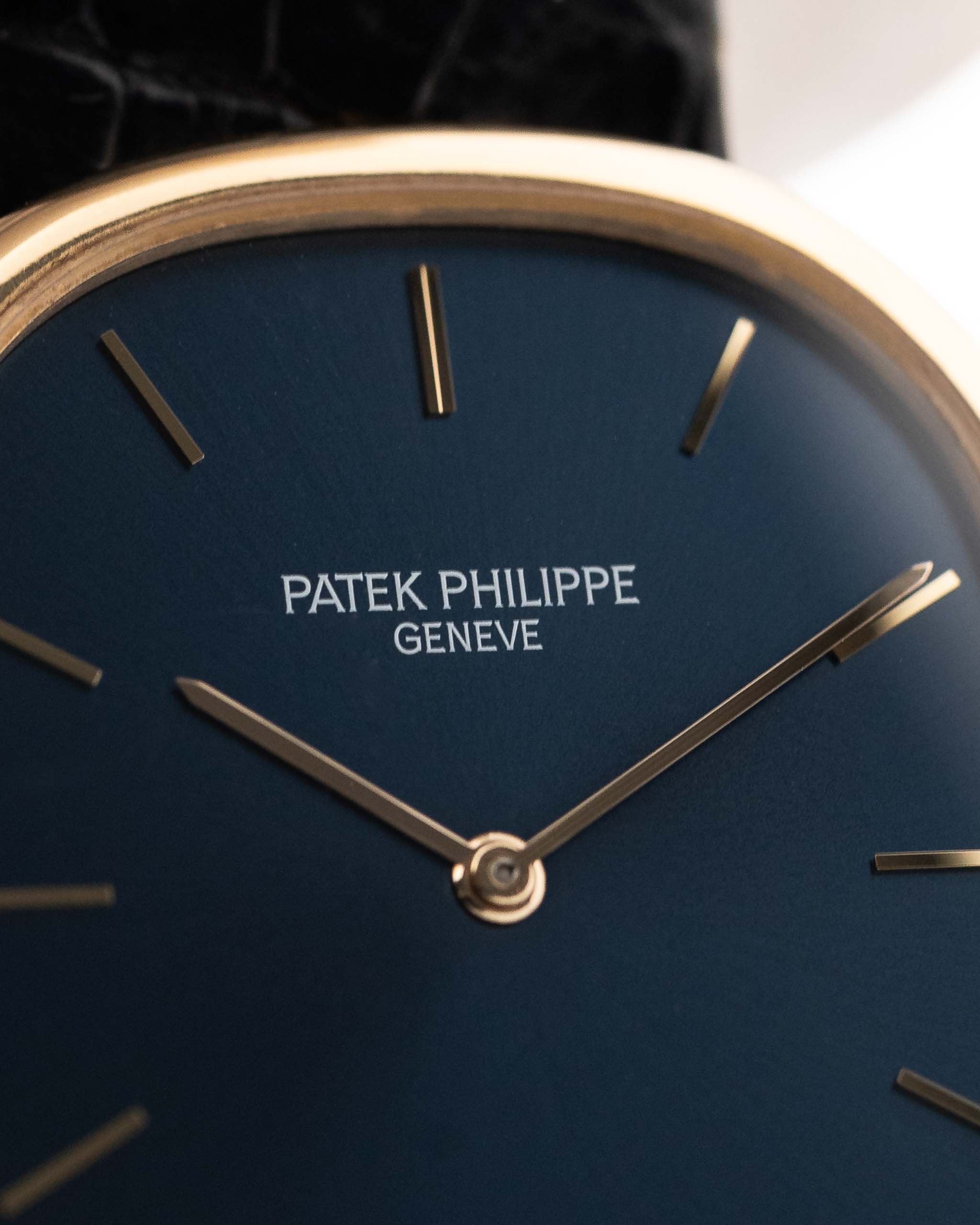Closeup Photo of a Patek Philippe Ellipse 3838J from the 1980s. 31mm case in Yellow Gold with Quartz Cal. E27, Flawless Blue Sigma Dial, Original Leather Strap and Gold Buckle.