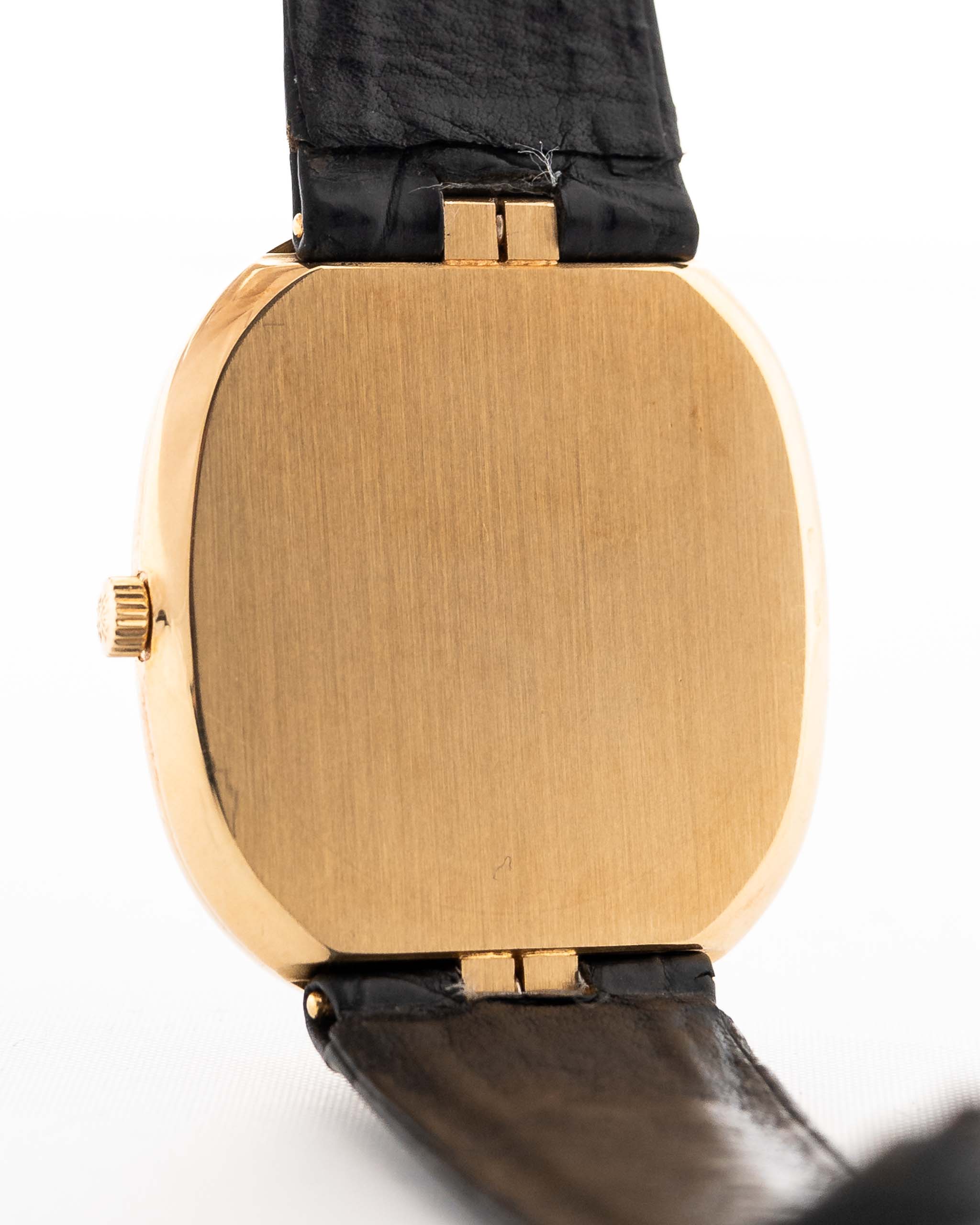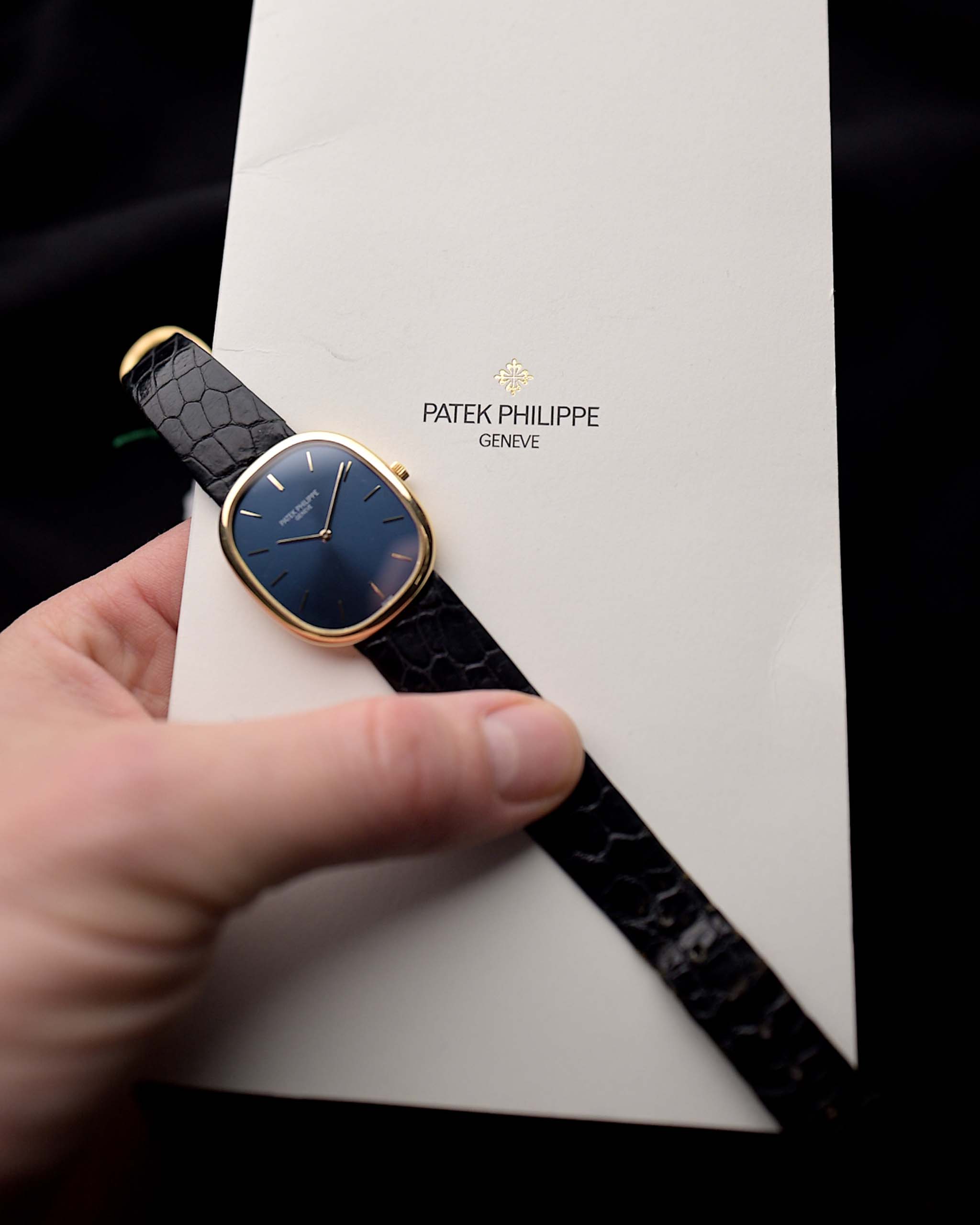 Photo of a Patek Philippe Ellipse 3838J from the 1980s on a wrist. 31mm case in Yellow Gold with Quartz Cal. E27, Flawless Blue Sigma Dial, Original Leather Strap and Gold Buckle.