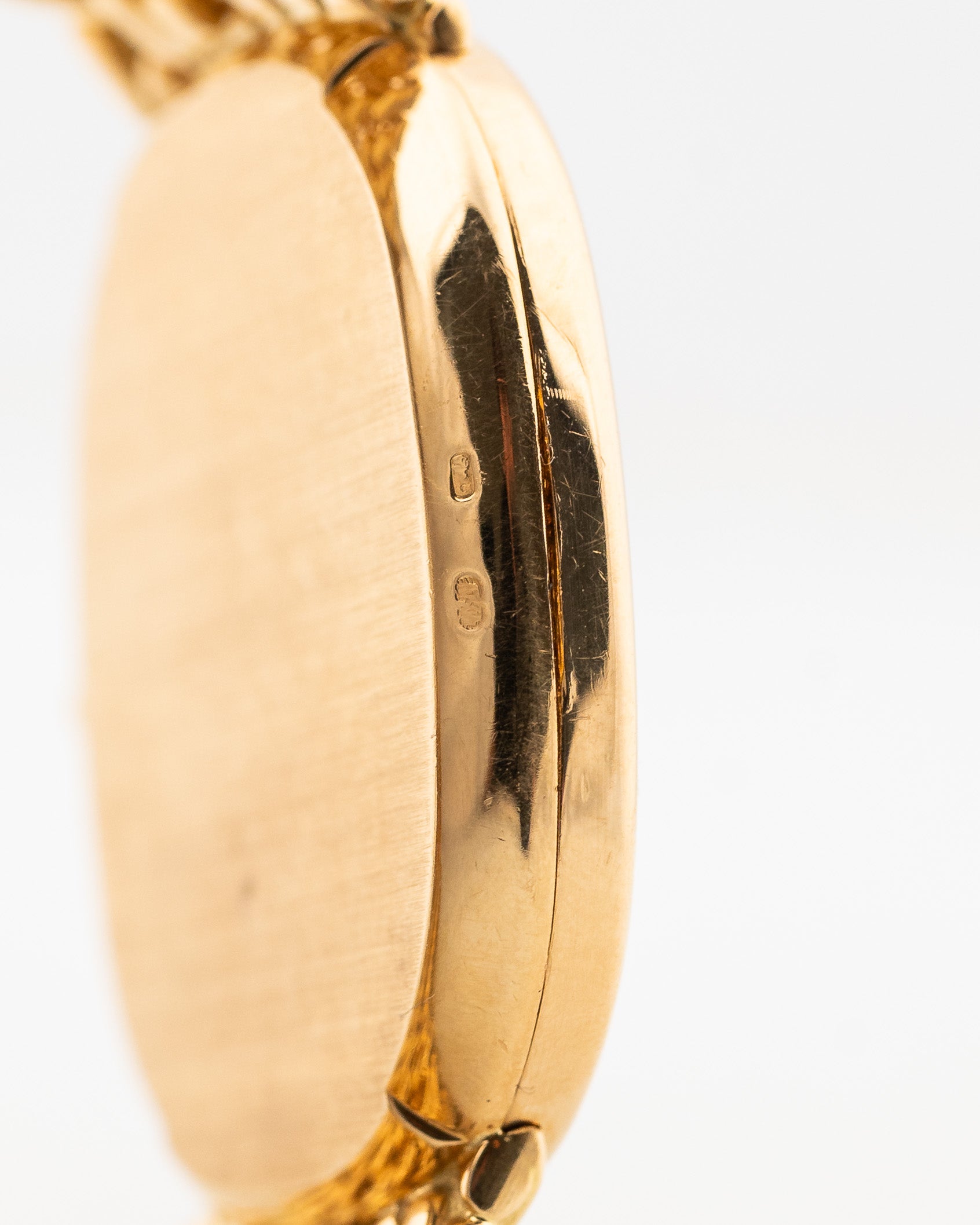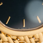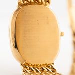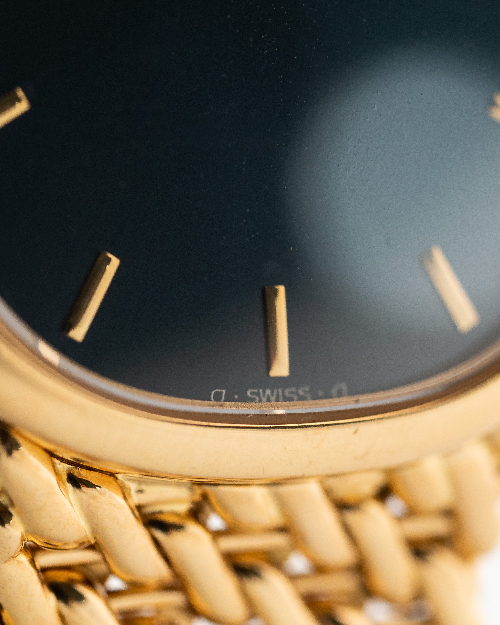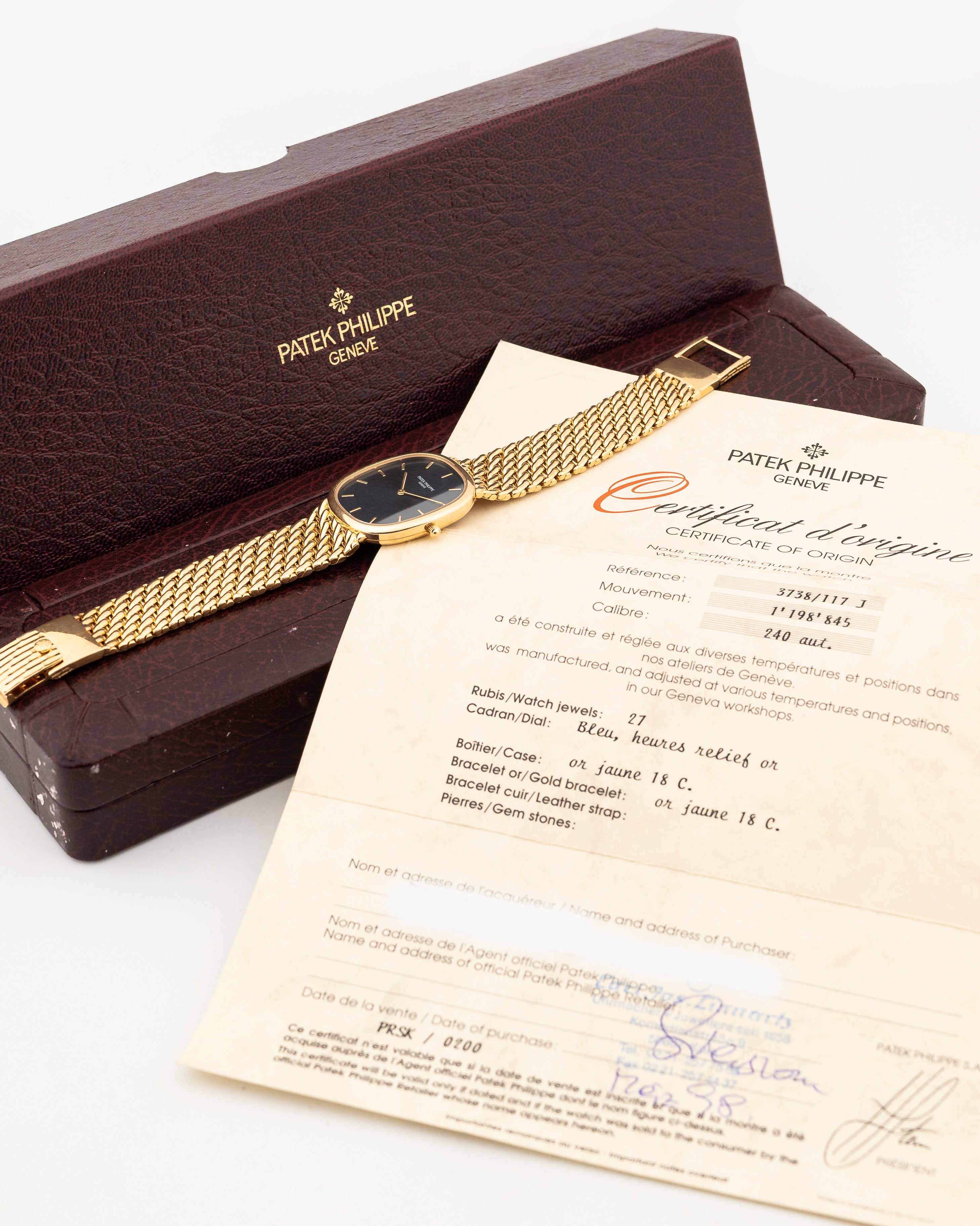 Closeup Photo of a Patek Philippe Ellipse 3738 Jumbo from 1998 on wrist. With Automatic  movement, 31mm case, 27 jewels, original blue sunburst dial, Yellow gold bracelet.