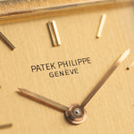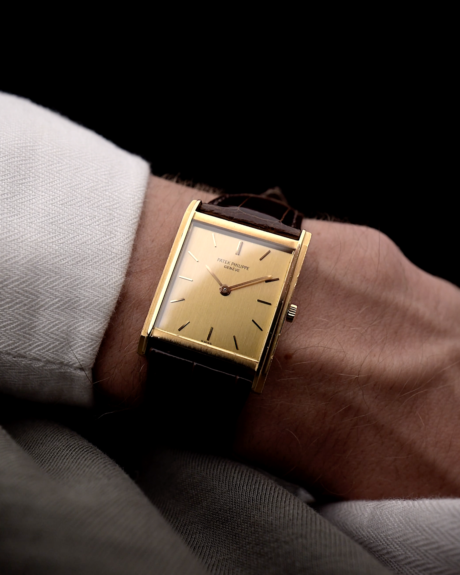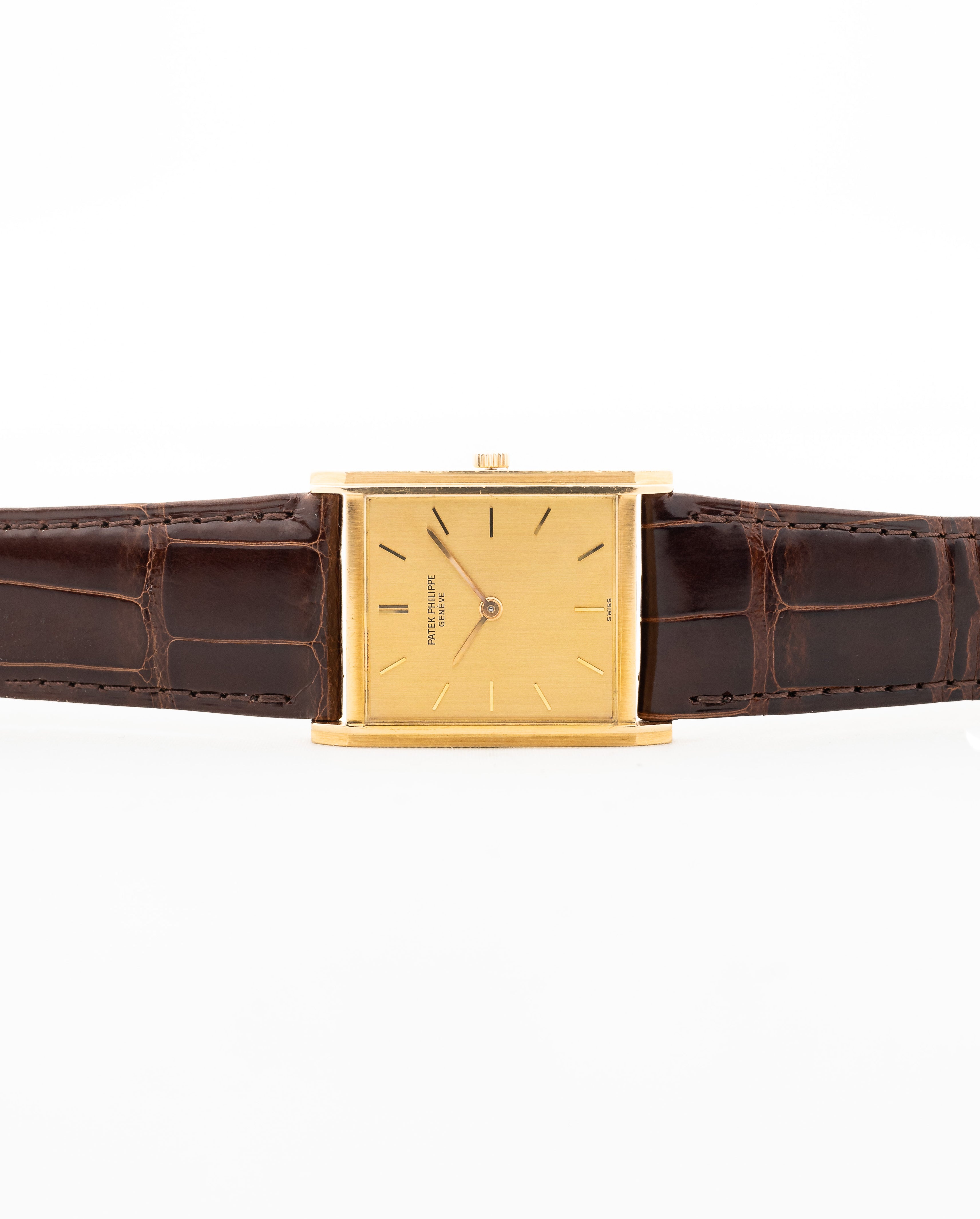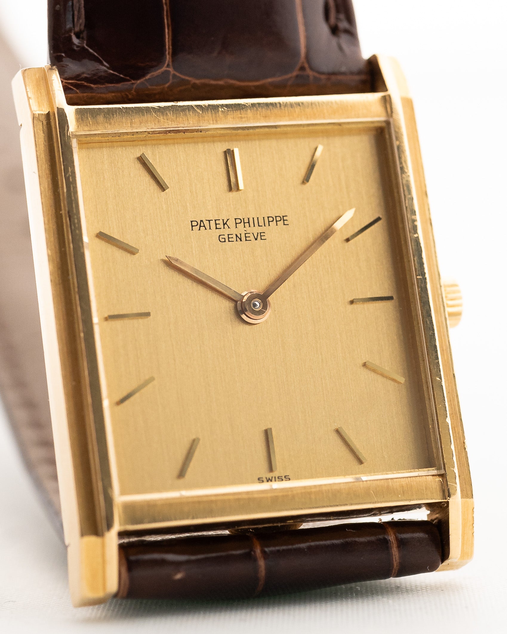 Here we have an excellent representation of Patek Philippes's dress watches, this ref. 3519 hit all the high notes with an 18k yellow gold Rectangular case, short down turned lugs, a wonderful clean golden colored dial, stick hour markers and hands.
