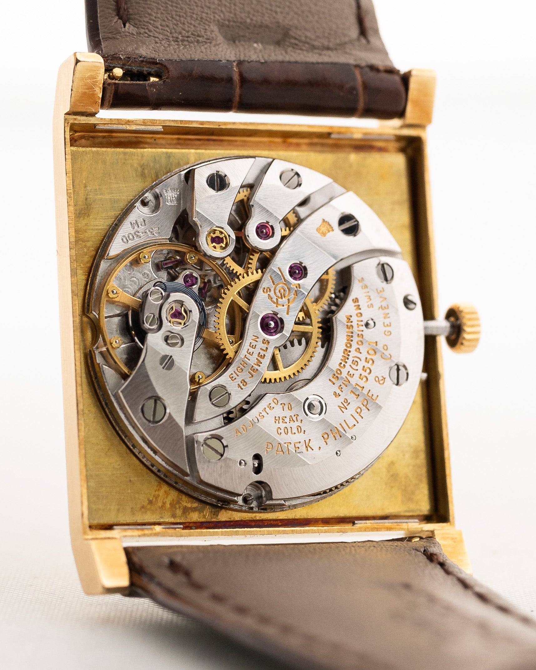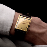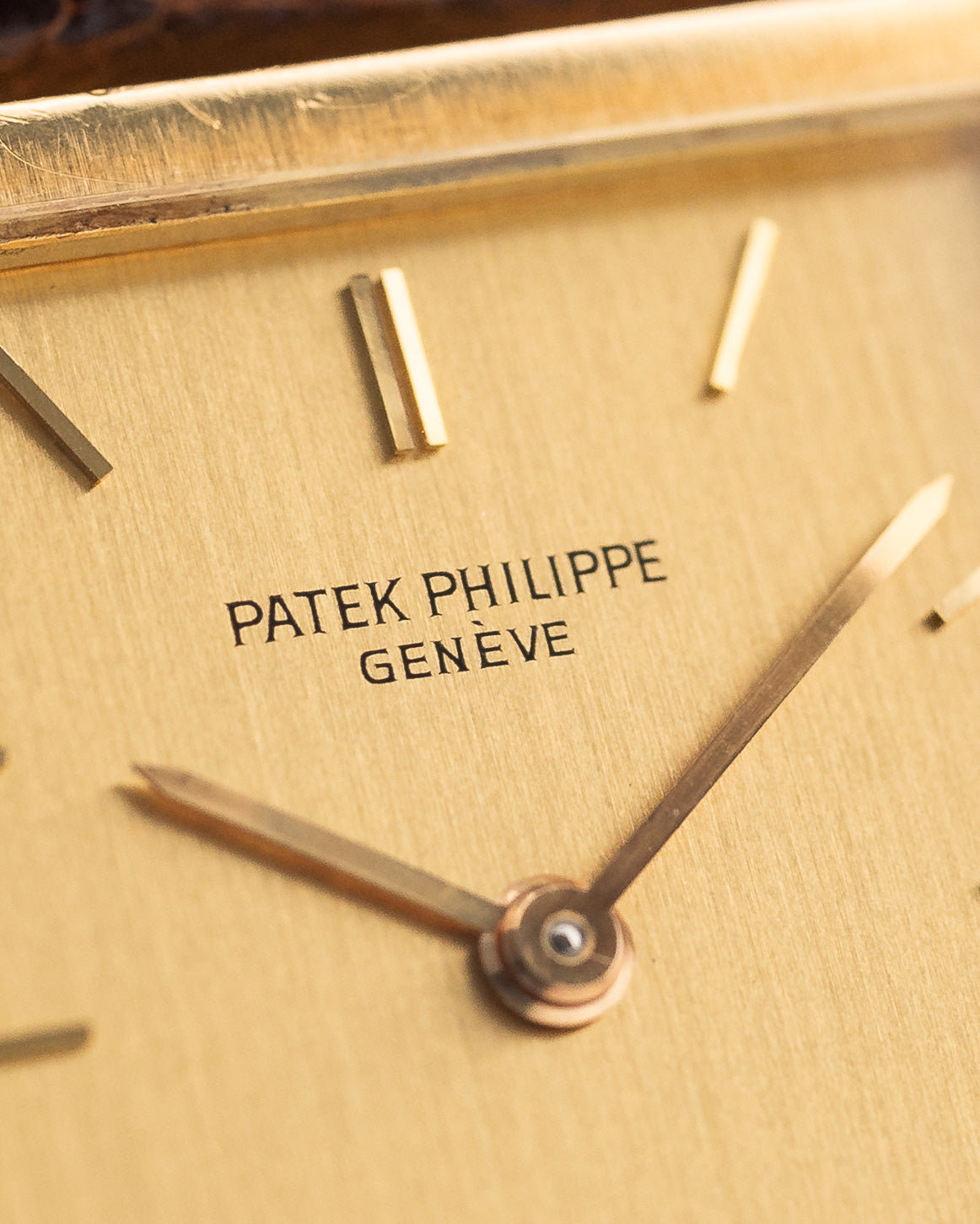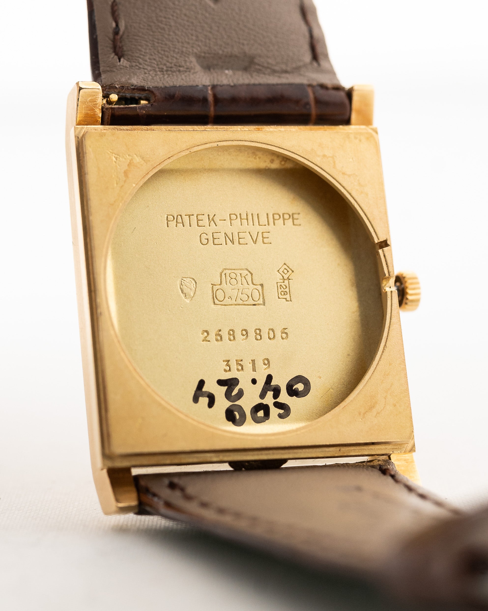 Here we have an excellent representation of Patek Philippes's dress watches, this ref. 3519 hit all the high notes with an 18k yellow gold Rectangular case, short down turned lugs, a wonderful clean golden colored dial, stick hour markers and hands.